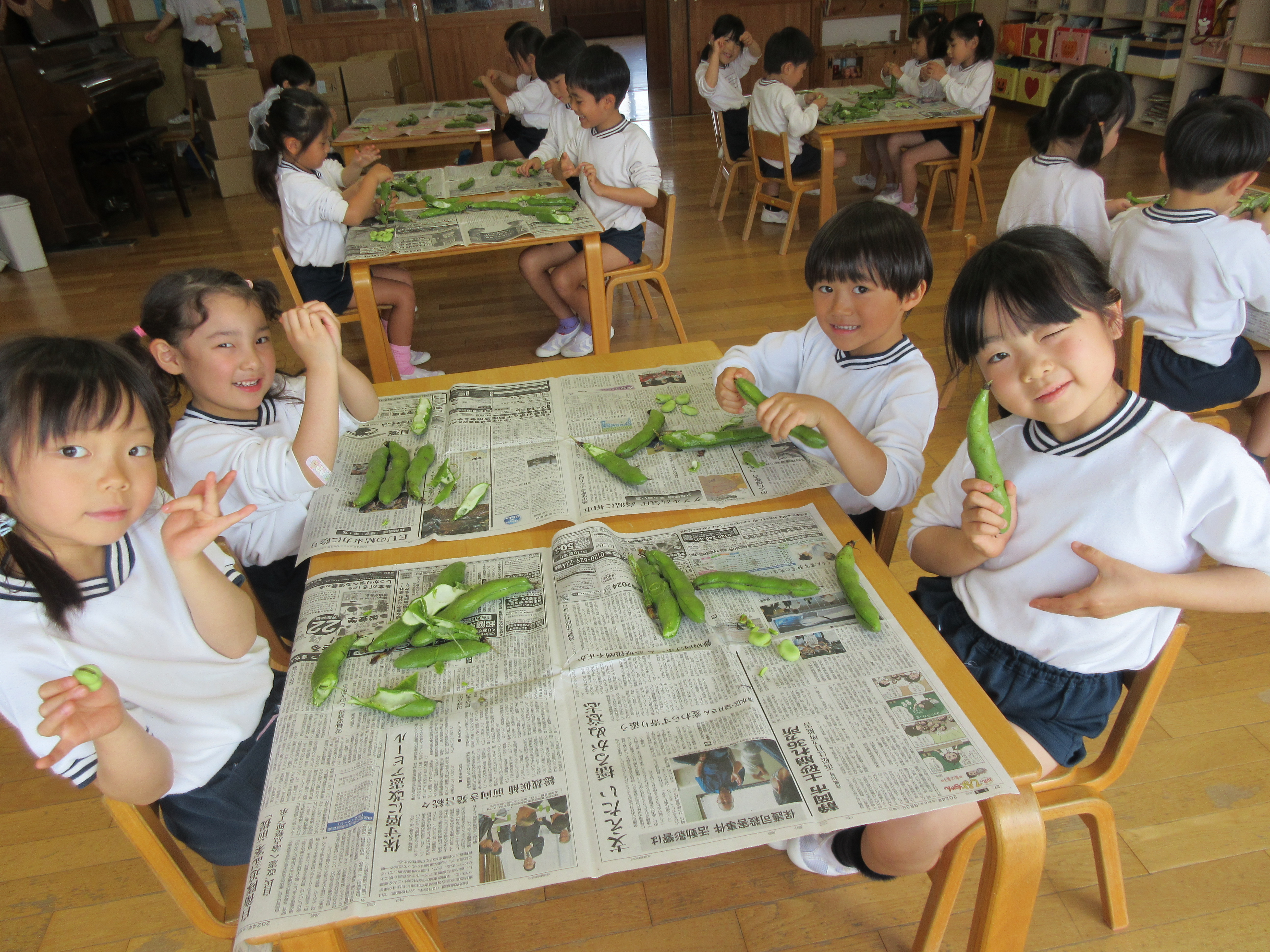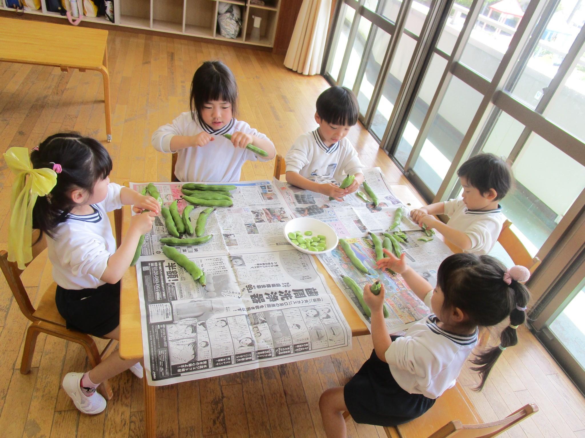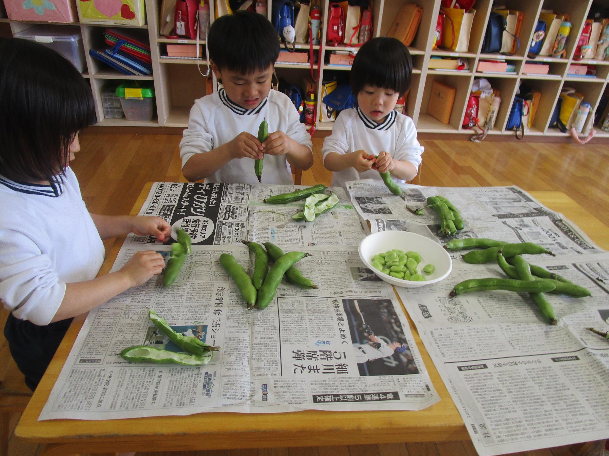 ひまわり・ゆり組の子どもたちがそら豆の皮むきをしました。