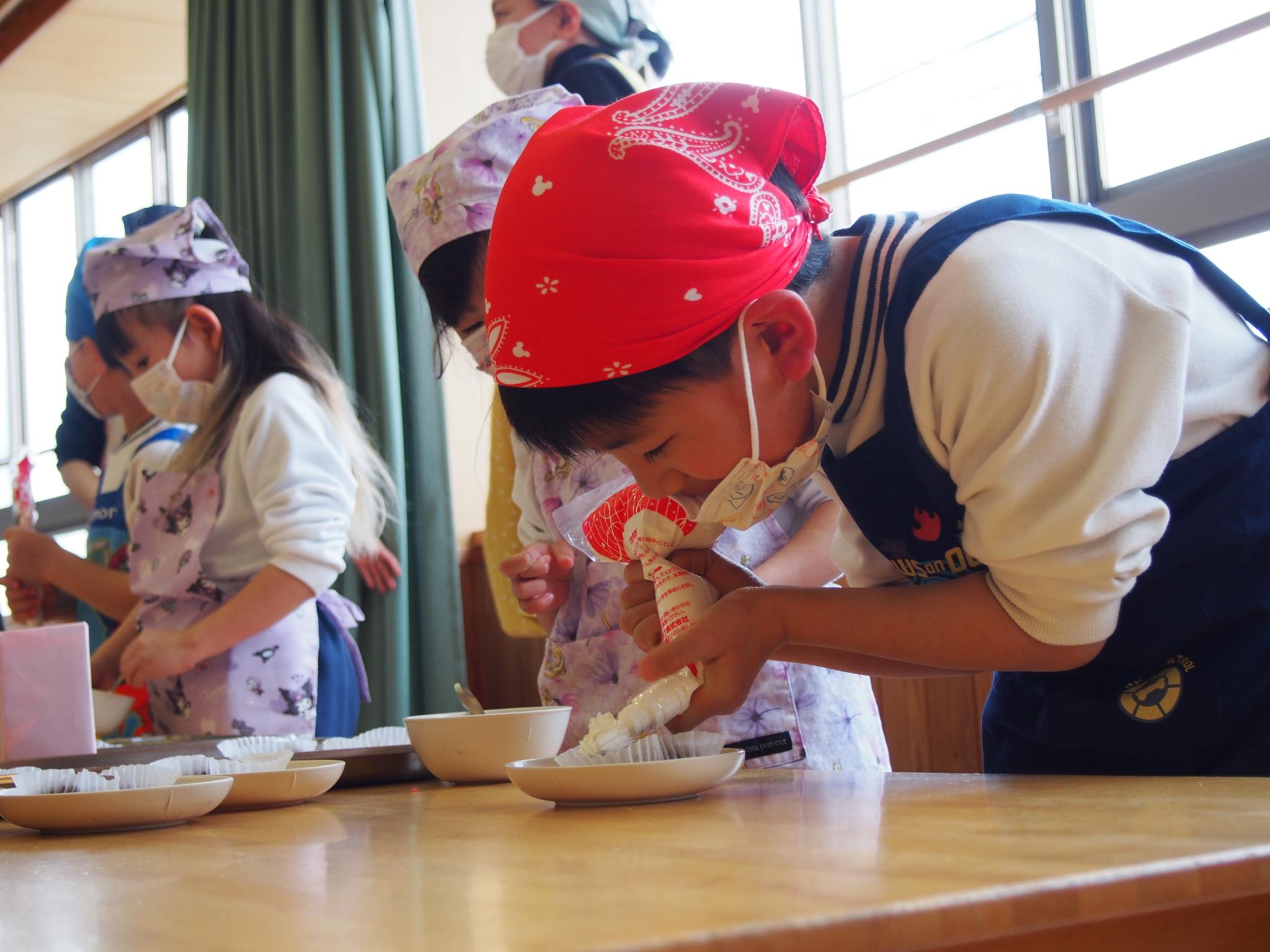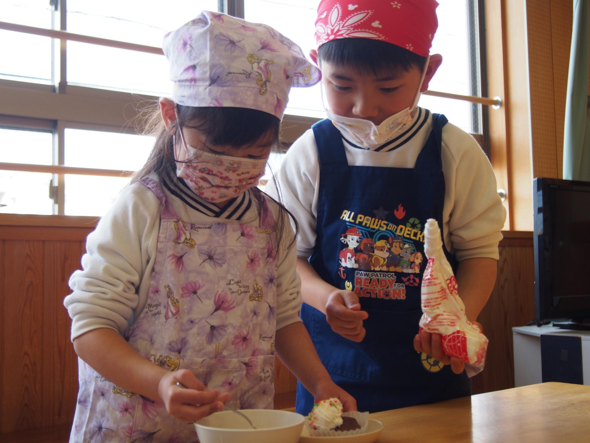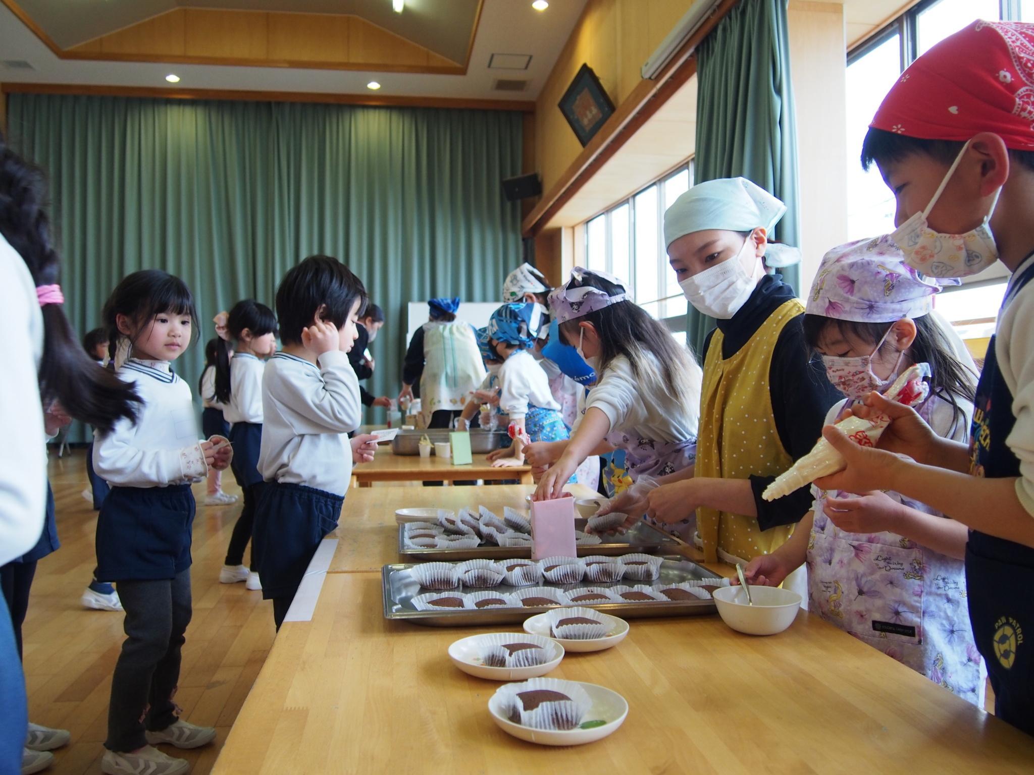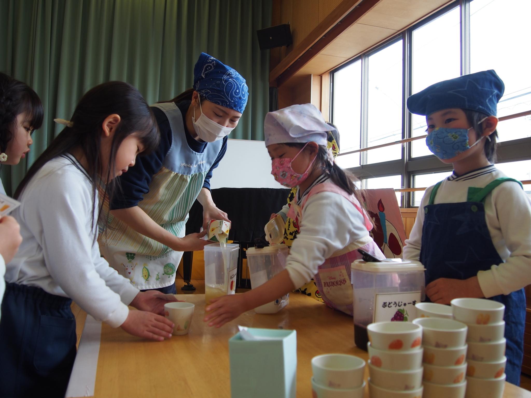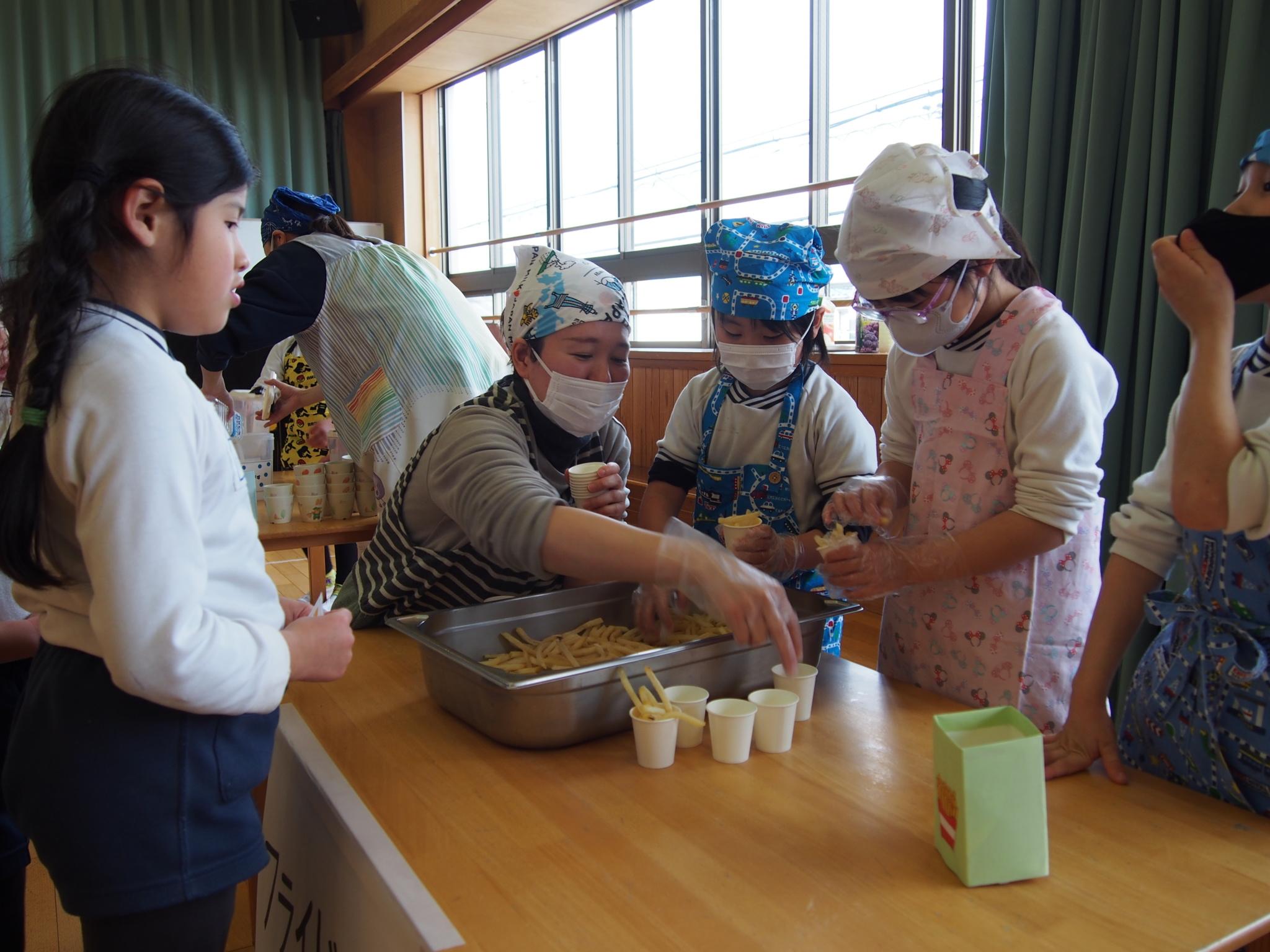 食育講座、お店屋さんごっこでは、ココアケーキ、フライドポテト、ジュースの3つのお店が並びました。