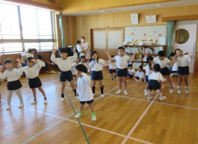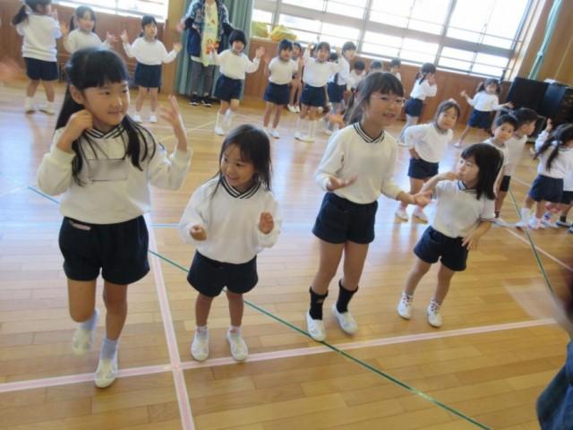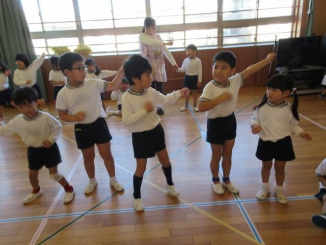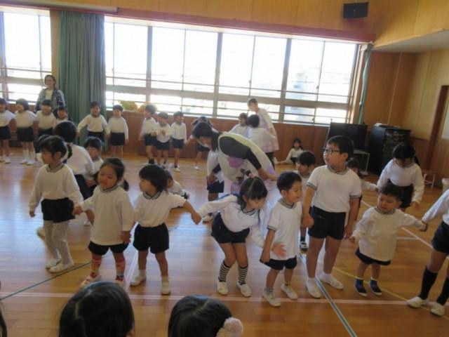 ひまわり、ゆり、れんげ、すみれ組が集まって、他のクラスの遊戯も