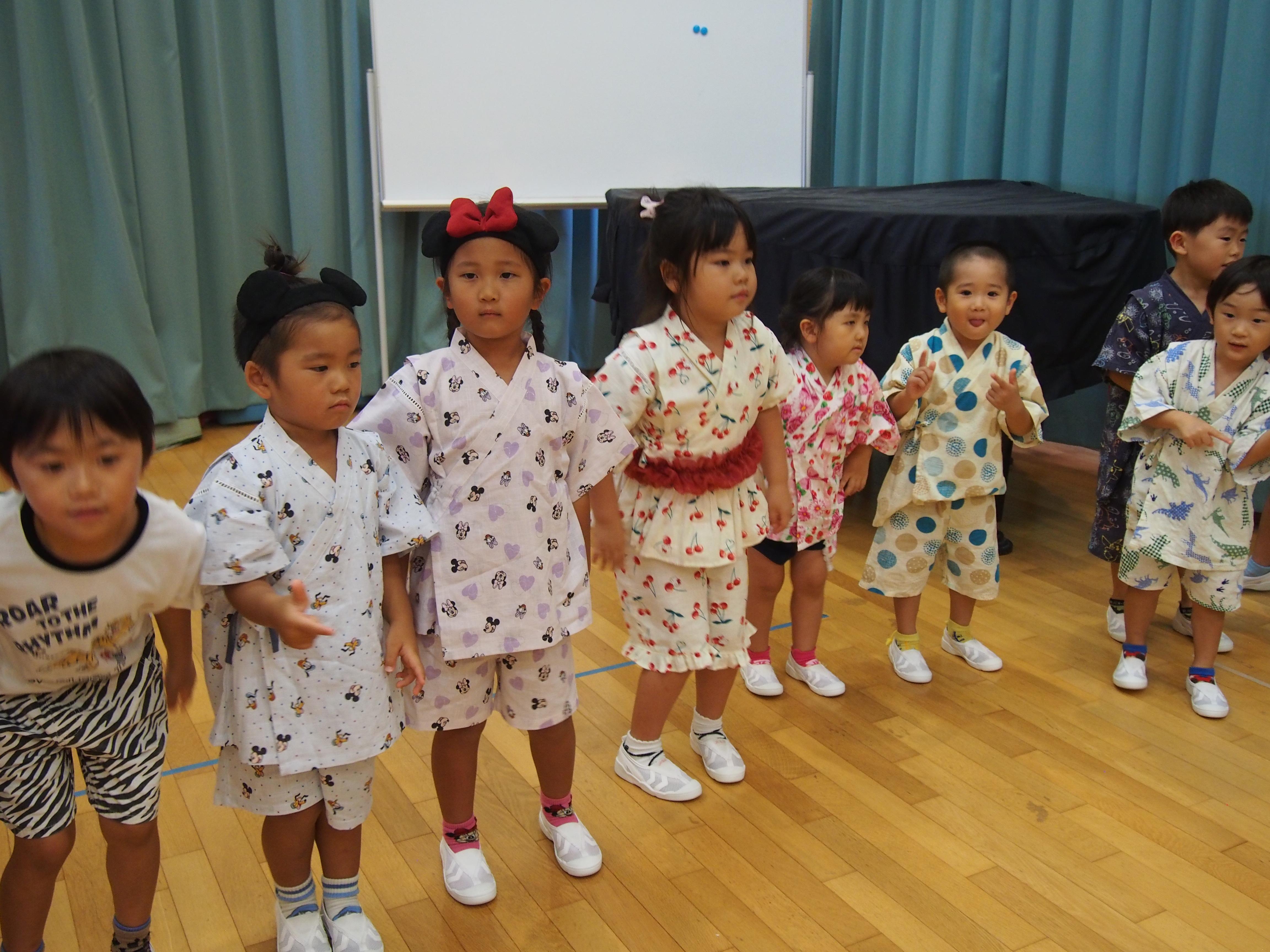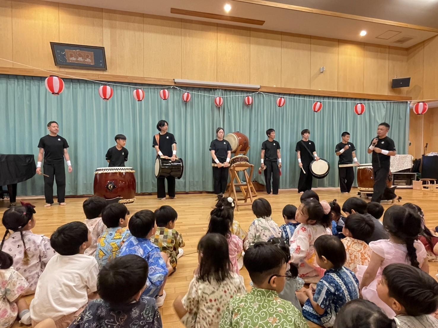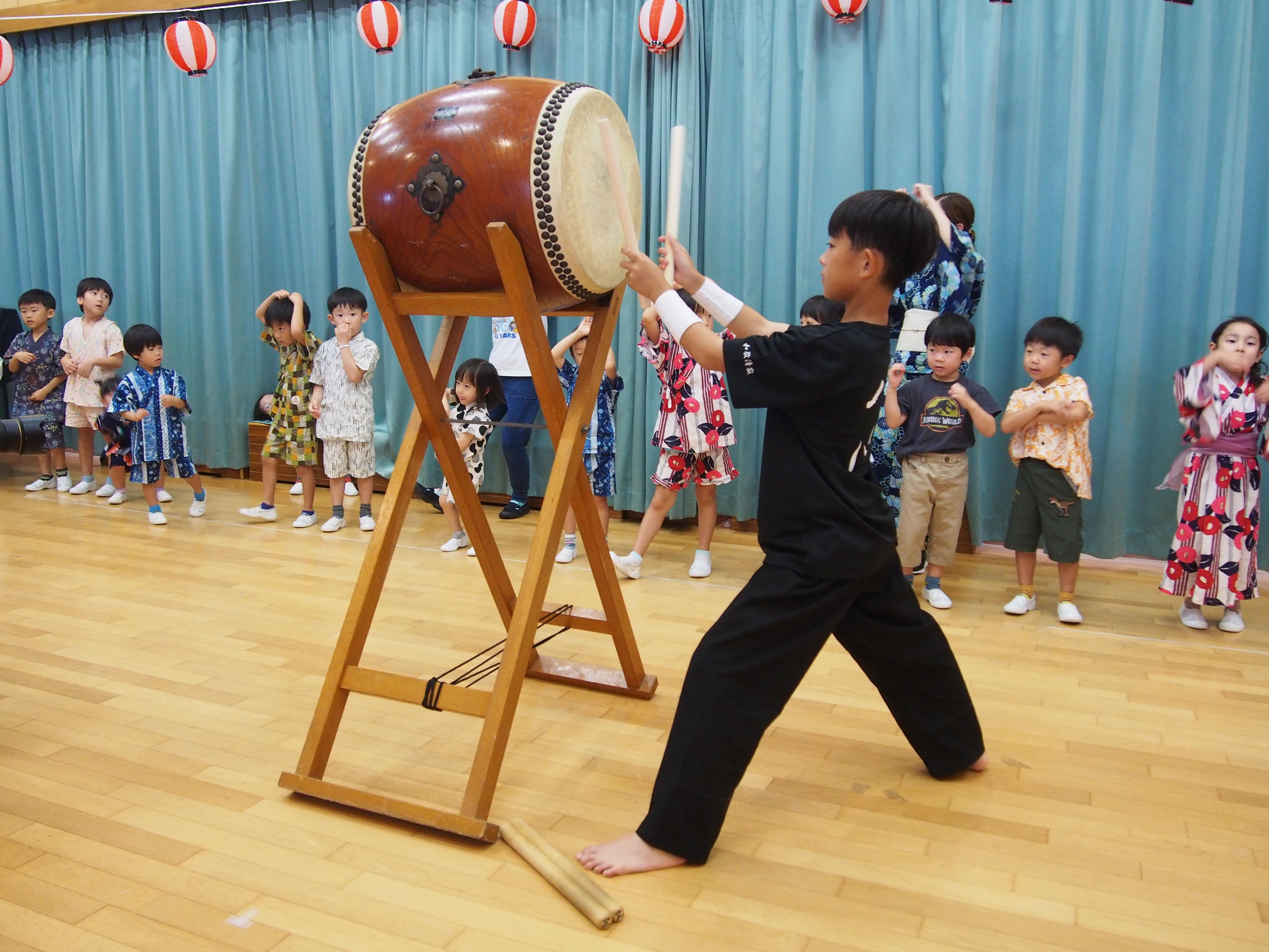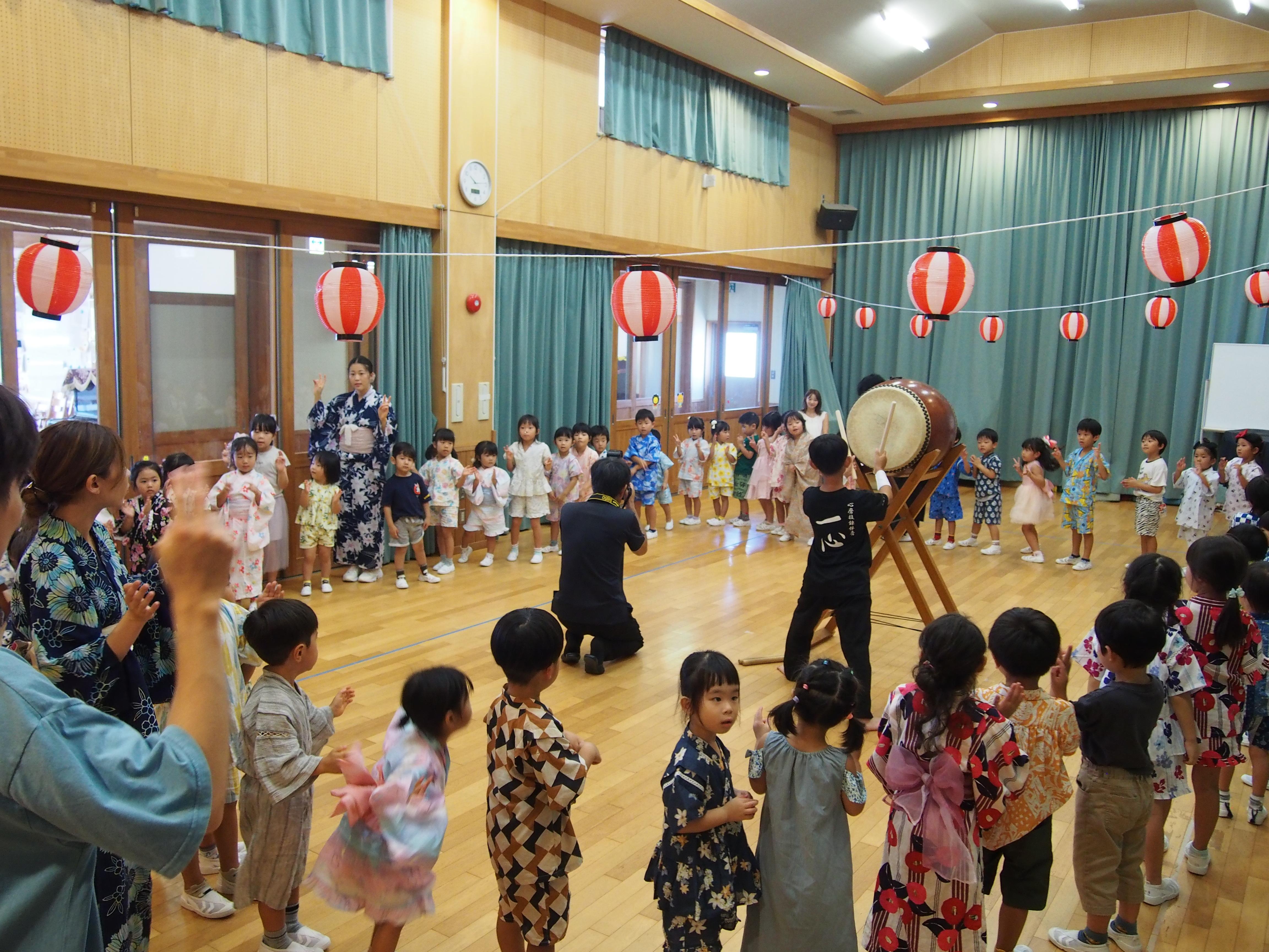 オープニングは太鼓尊塾一心(たいこそんじゅくいっしん)による和太鼓演奏!朝元理事長先生、園長先生、アソカ学園の先生、メンバーの学生さんたちみんなで演奏してくれましたね。子どもたちも「わっしょい」の掛け声や3・3・7のリズムで応援してくれましたよ。和太鼓の響きで心のドキドキも高まったようです。演奏後は、盆踊り!エビカニクス音頭とドラえもん音頭を踊りました。浴衣、甚平、ドレス、お気に入りの格好のお友だちが笑顔で並んで踊る姿は、とても微笑ましい光景でした。