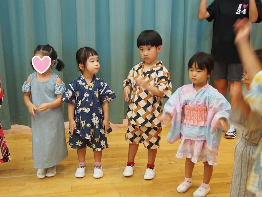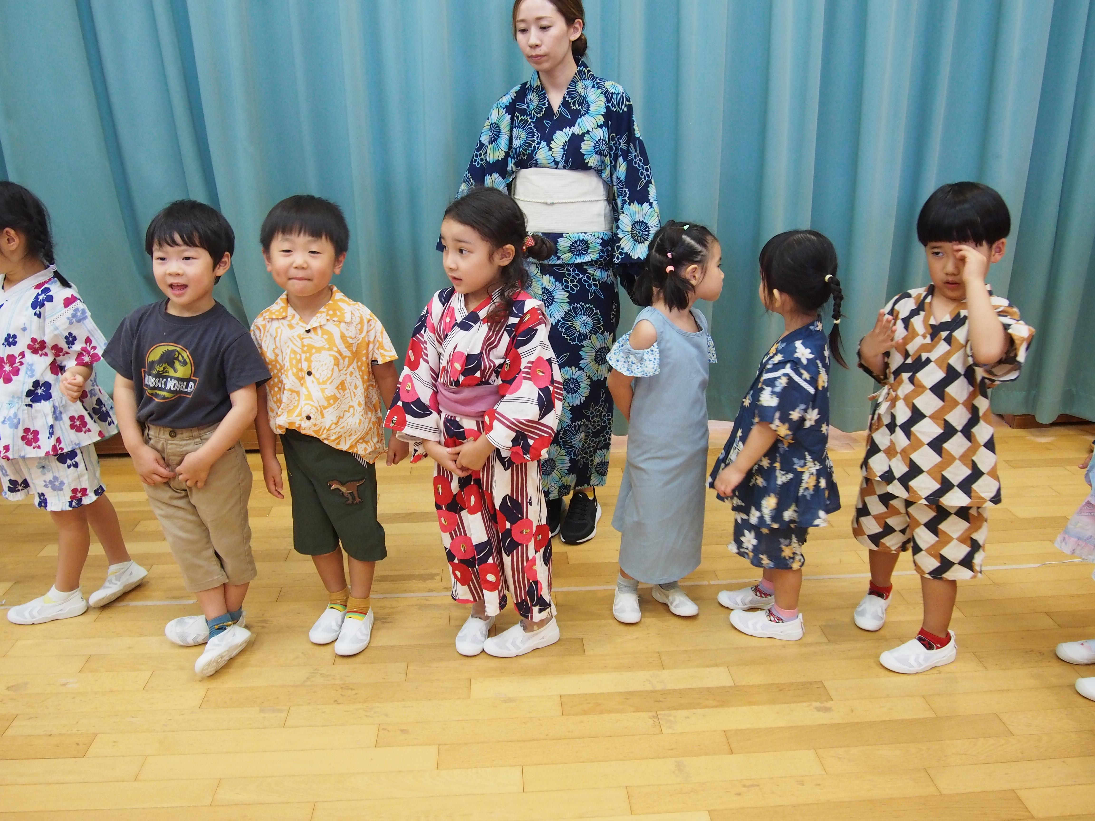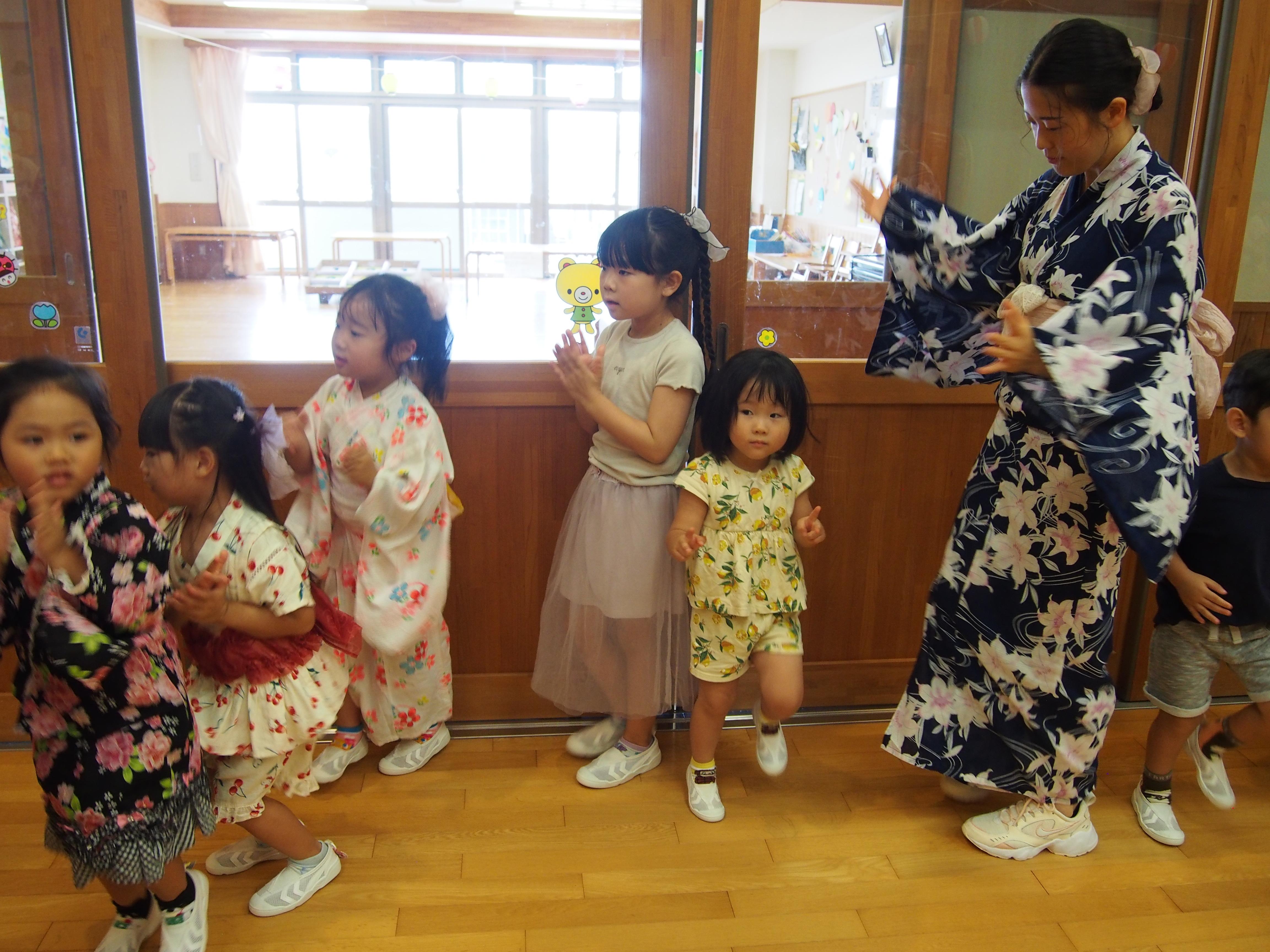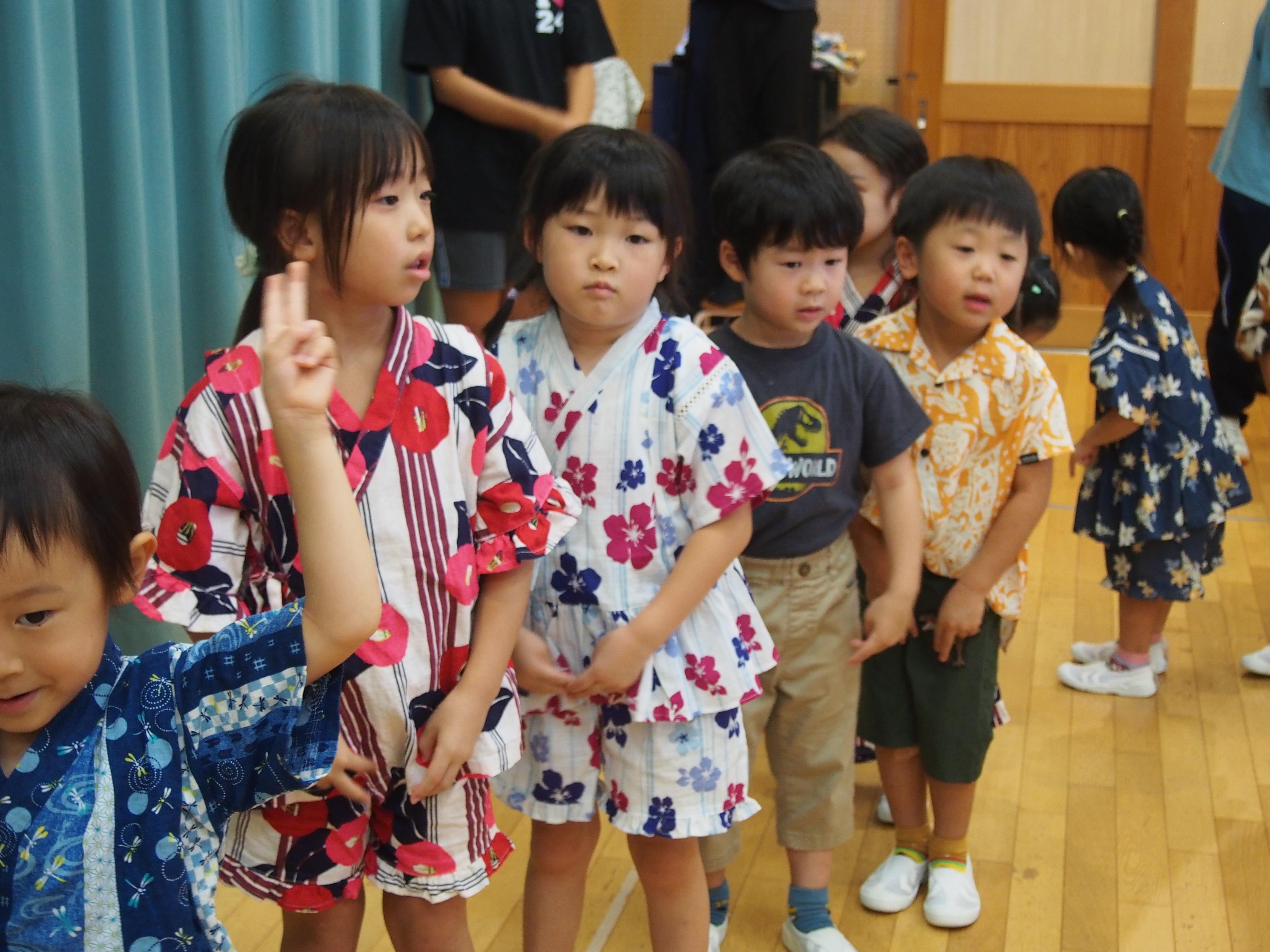 オープニングは太鼓尊塾一心(たいこそんじゅくいっしん)による和太鼓演奏!朝元理事長先生、園長先生、アソカ学園の先生、メンバーの学生さんたちみんなで演奏してくれましたね。子どもたちも「わっしょい」の掛け声や3・3・7のリズムで応援してくれましたよ。和太鼓の響きで心のドキドキも高まったようです。演奏後は、盆踊り!エビカニクス音頭とドラえもん音頭を踊りました。浴衣、甚平、ドレス、お気に入りの格好のお友だちが笑顔で並んで踊る姿は、とても微笑ましい光景でした。