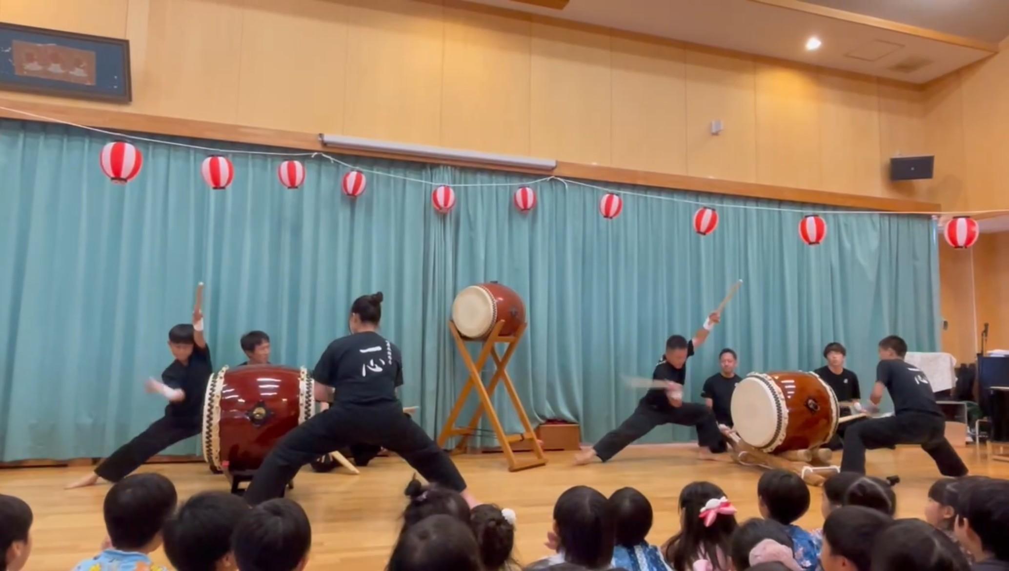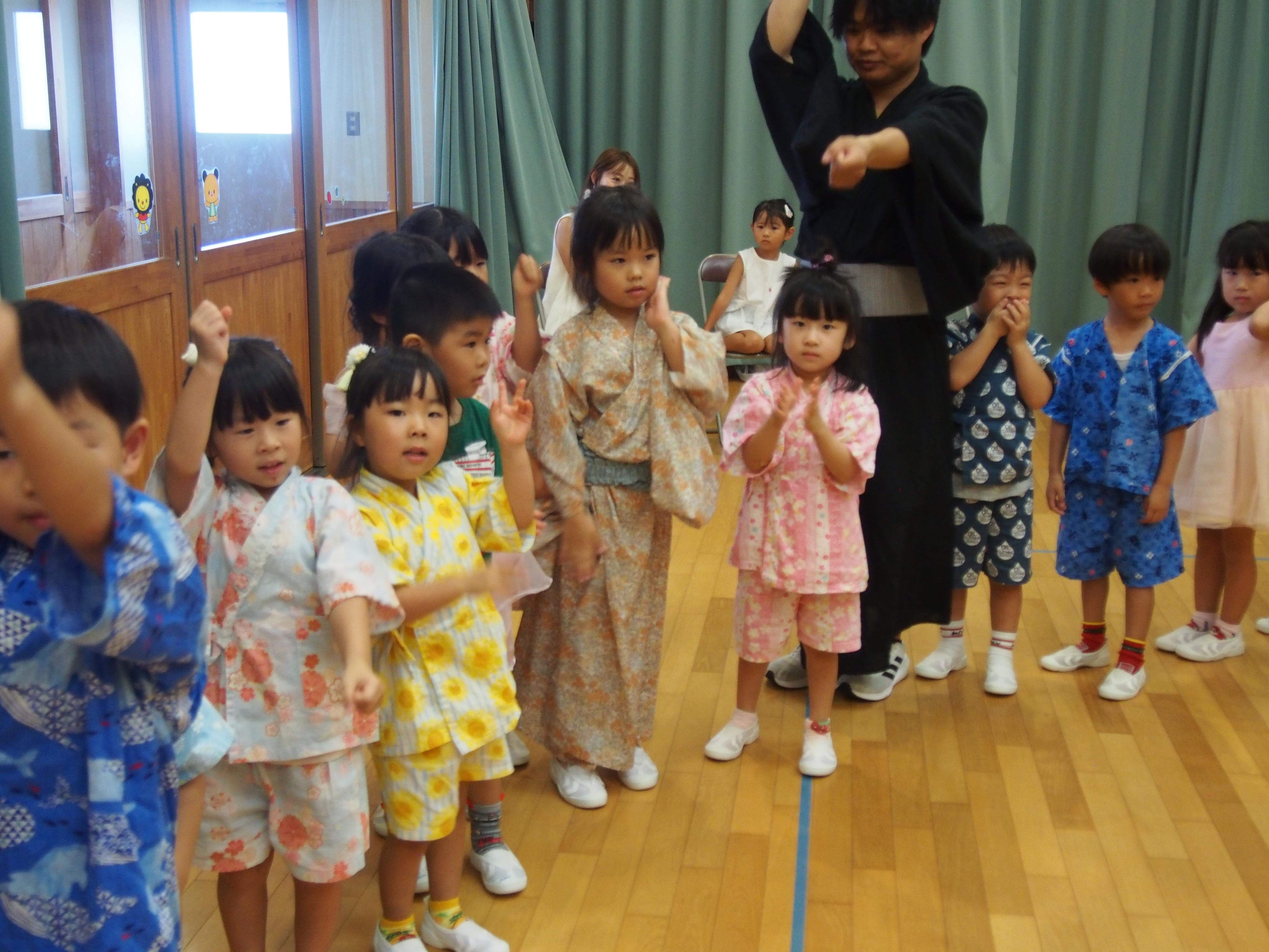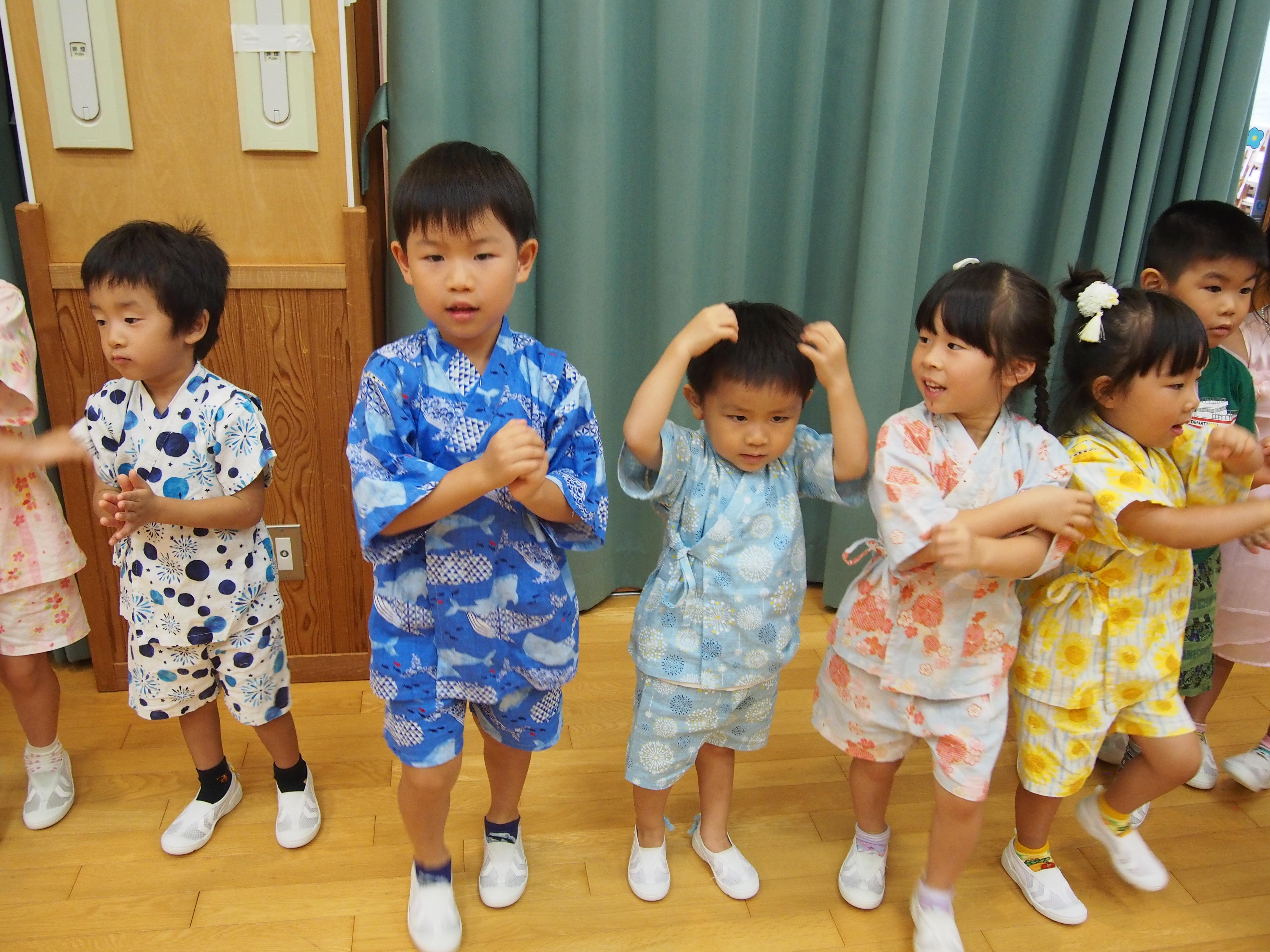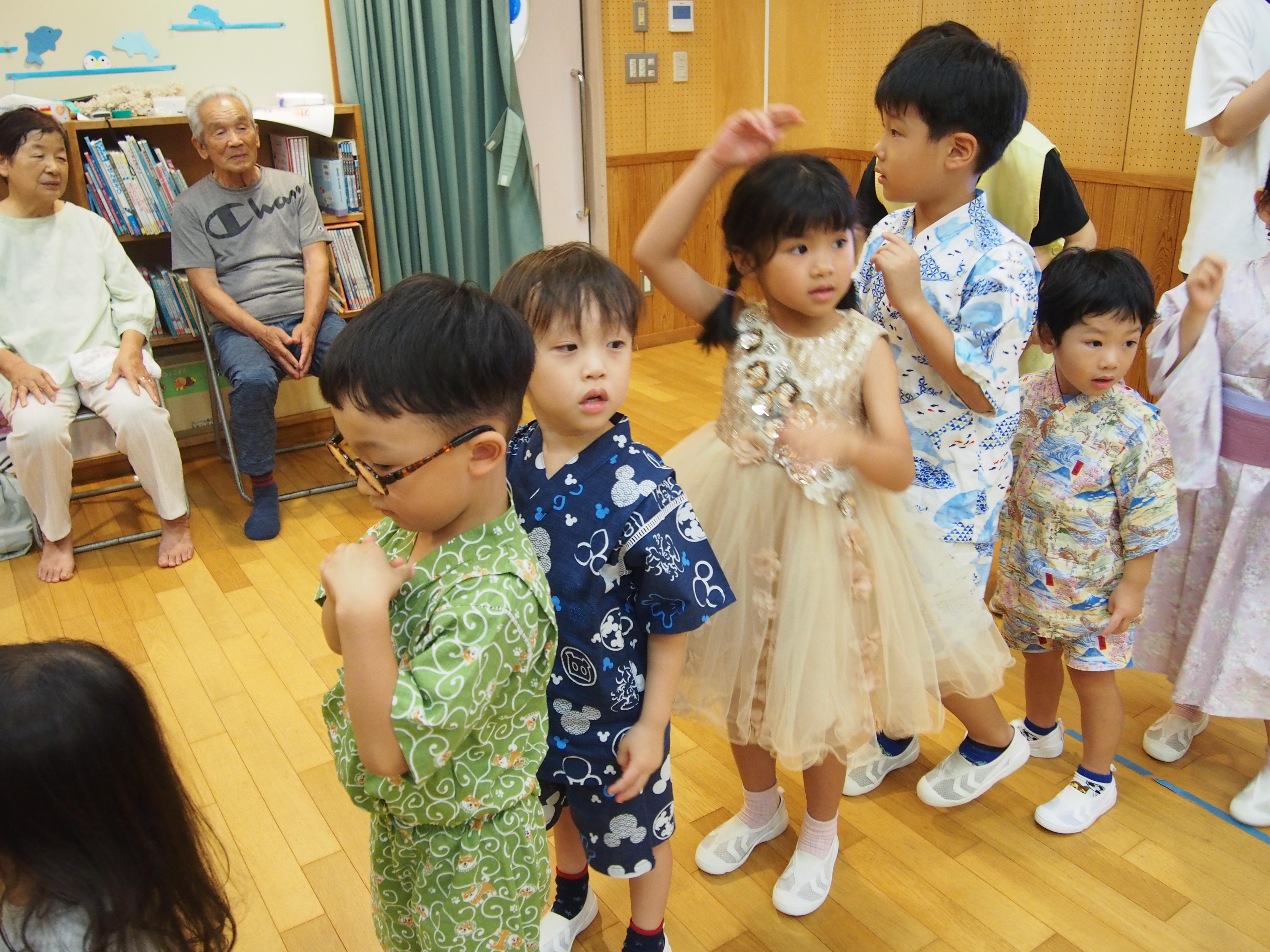 オープニングは太鼓尊塾一心(たいこそんじゅくいっしん)による和太鼓演奏!朝元理事長先生、園長先生、アソカ学園の先生、メンバーの学生さんたちみんなで演奏してくれましたね。子どもたちも「わっしょい」の掛け声や3・3・7のリズムで応援してくれましたよ。和太鼓の響きで心のドキドキも高まったようです。演奏後は、盆踊り!エビカニクス音頭とドラえもん音頭を踊りました。浴衣、甚平、ドレス、お気に入りの格好のお友だちが笑顔で並んで踊る姿は、とても微笑ましい光景でした。