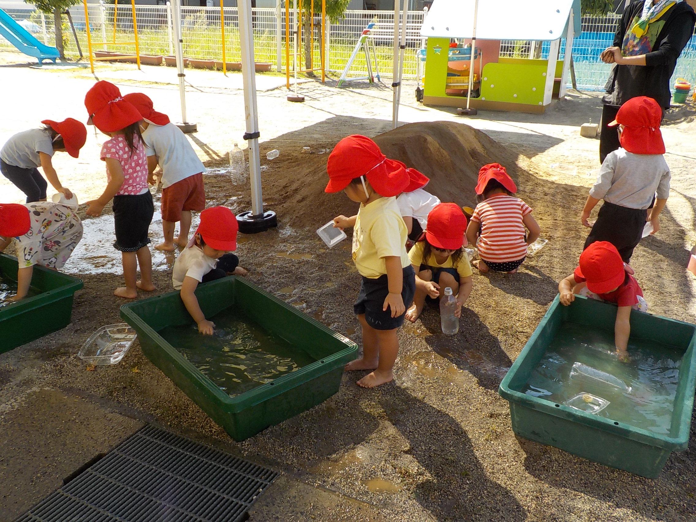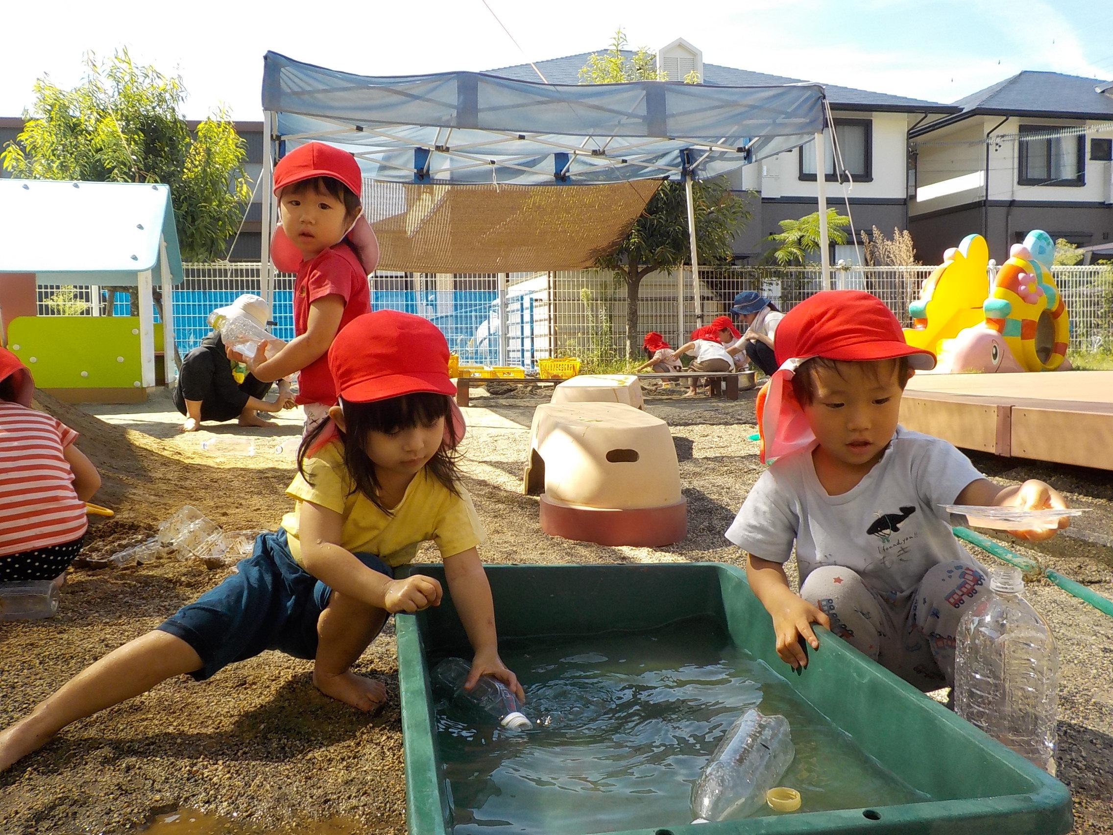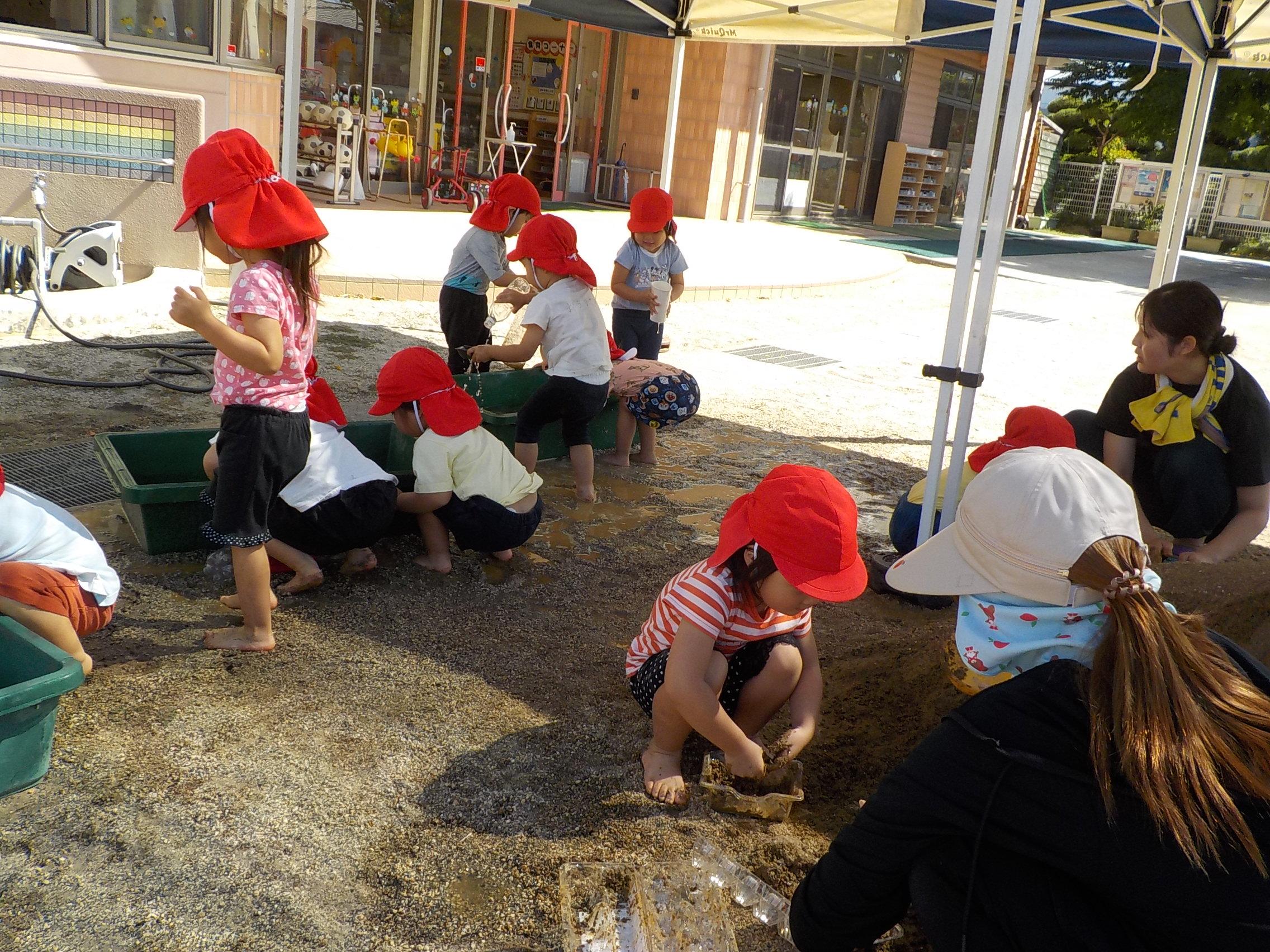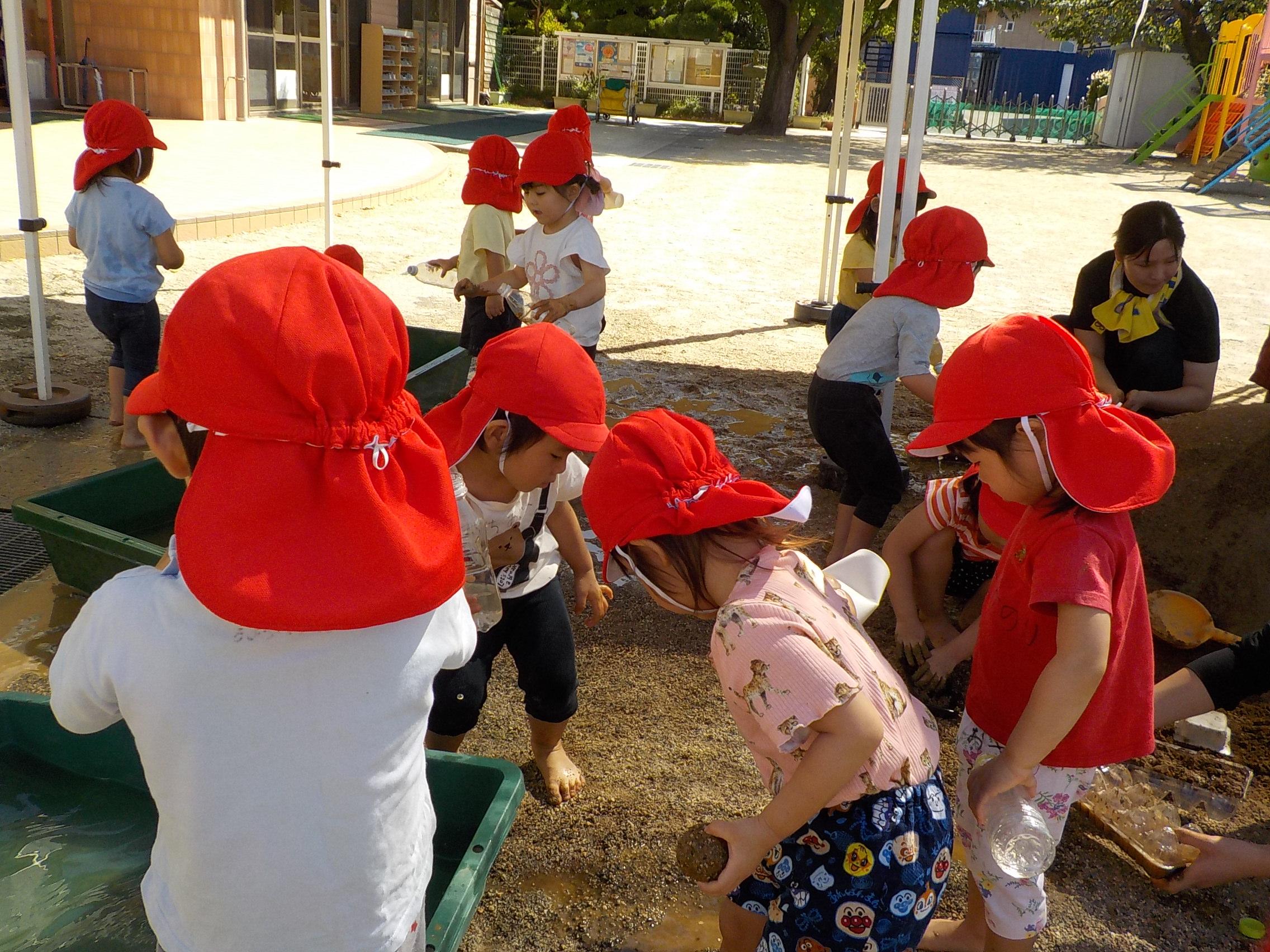 最初はコップに水を汲んで地面にバチャッ!バチャッ!と水をこぼし、その音や水が飛び跳ねることを繰り返し楽しむ、すみれ組さん。だんだん土がどろどろになってくると、色々な形の容器に泥を入れたり、丸めてお団子にしたりと感触を楽しんでいました。