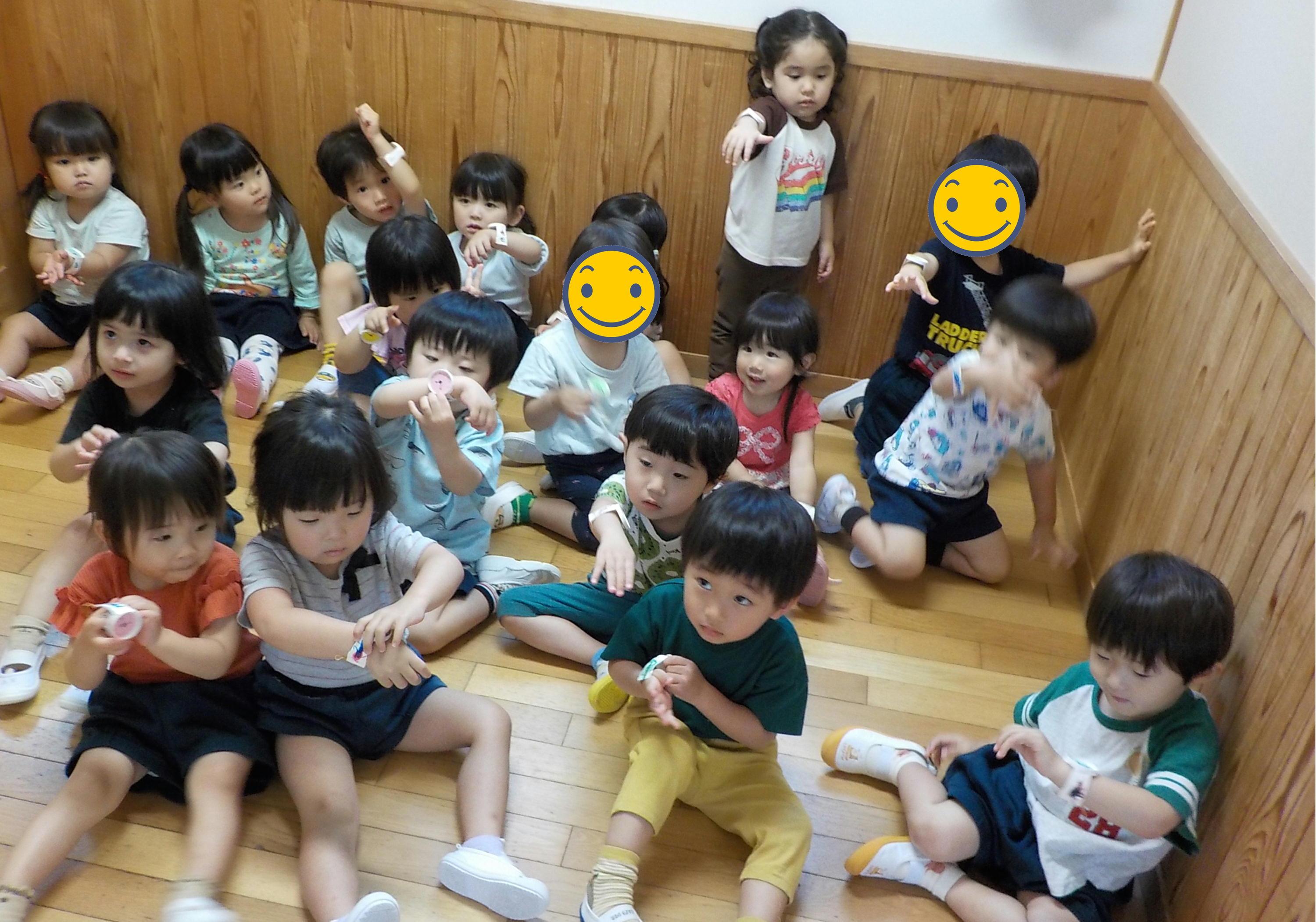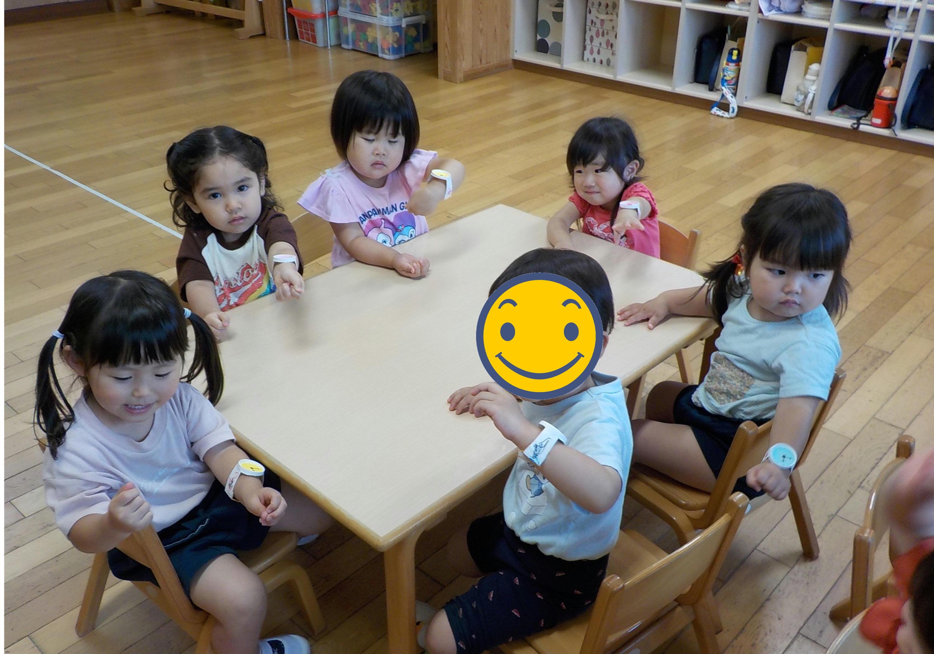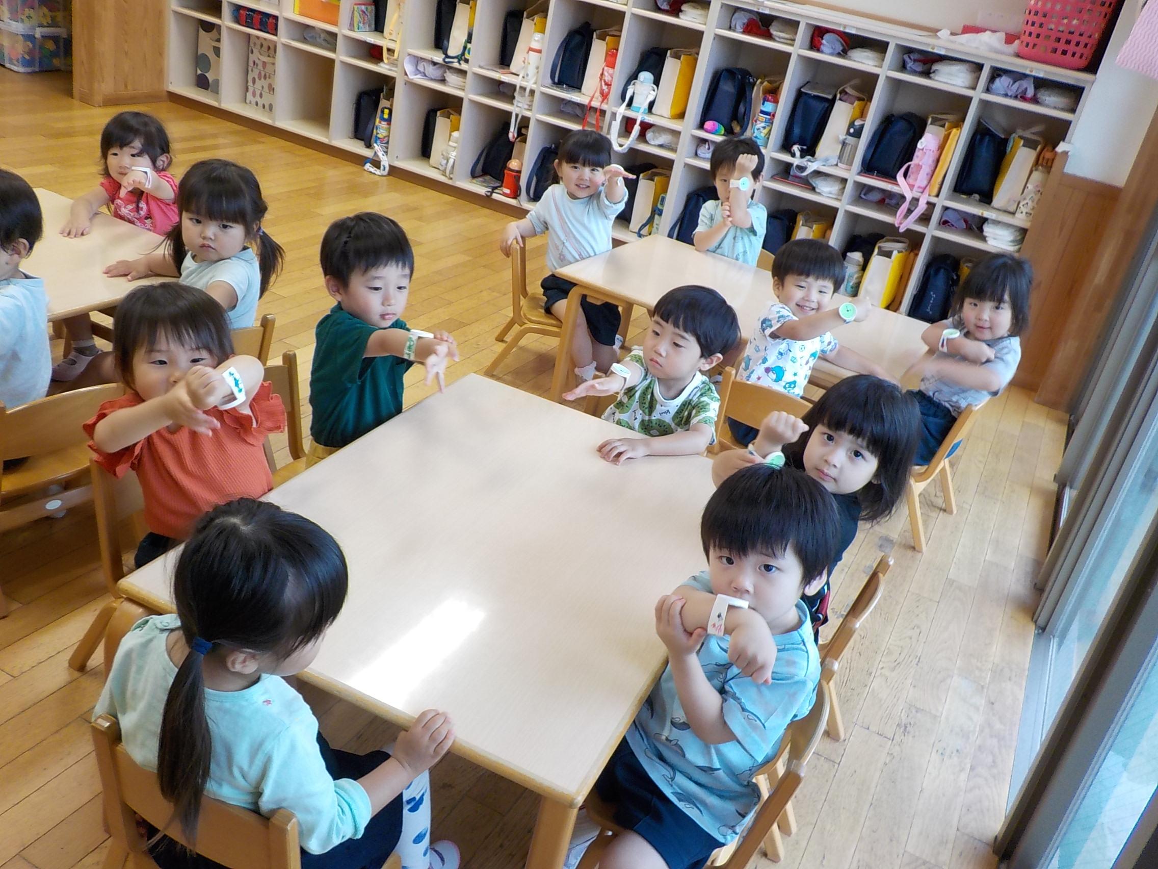 すみれ組では自分の腕時計を作りました。小さい紙コップを使用して文字盤の部分は4色から好きな色を選び、ベルトの部分はサインペンで模様を描きました。出来上がった腕時計をはめると大喜びのすみれ組さん。「とけいのうた」や「すうじのうた」も大きい声で楽しそうに歌っています。
