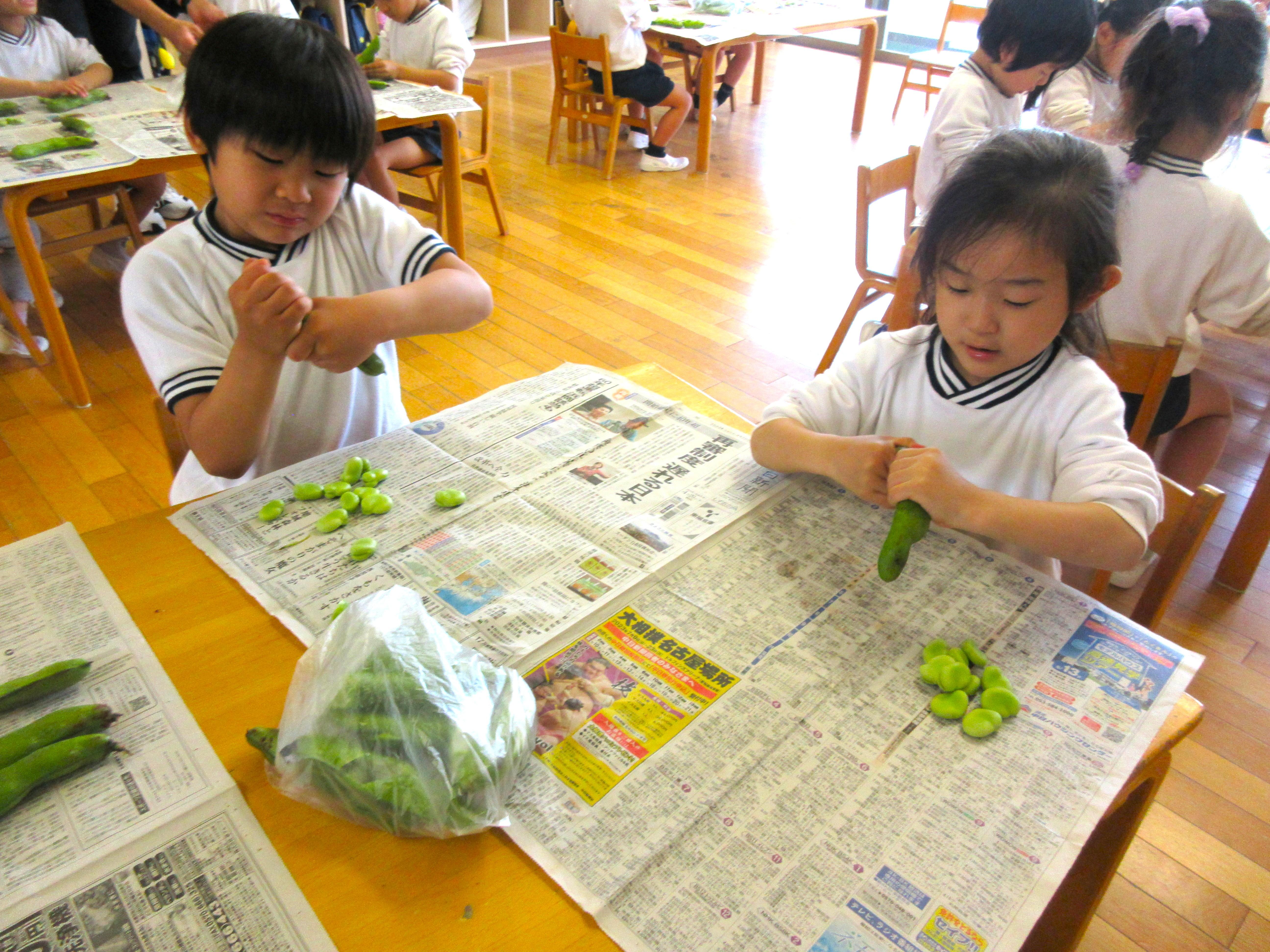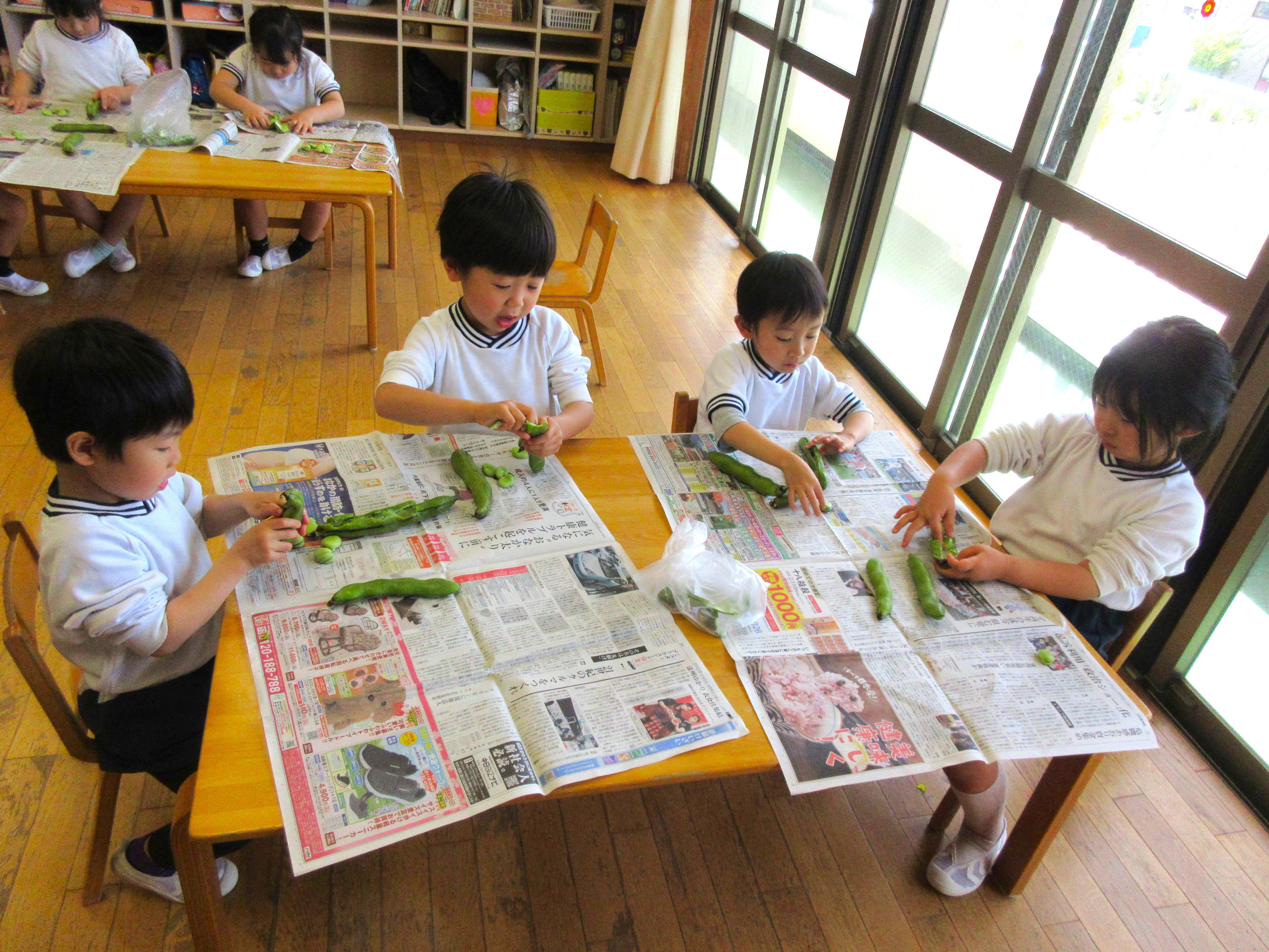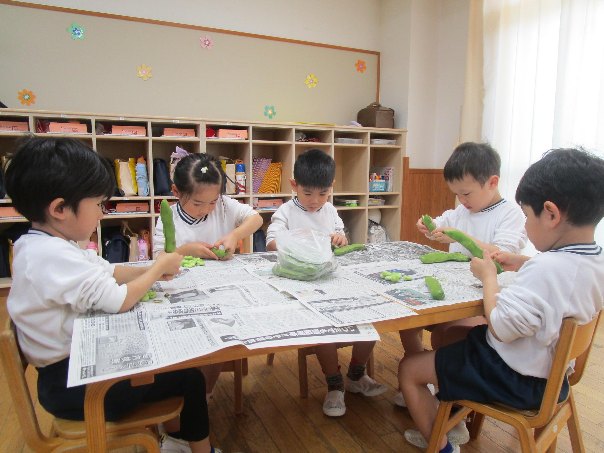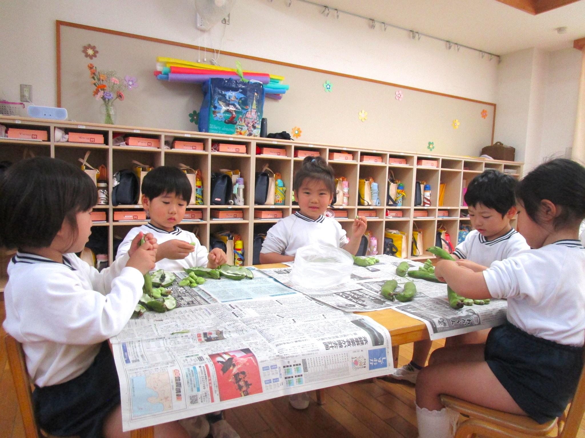 ゆり・ひまわり組さんの子どもたちが、そら豆の皮むきをしました!