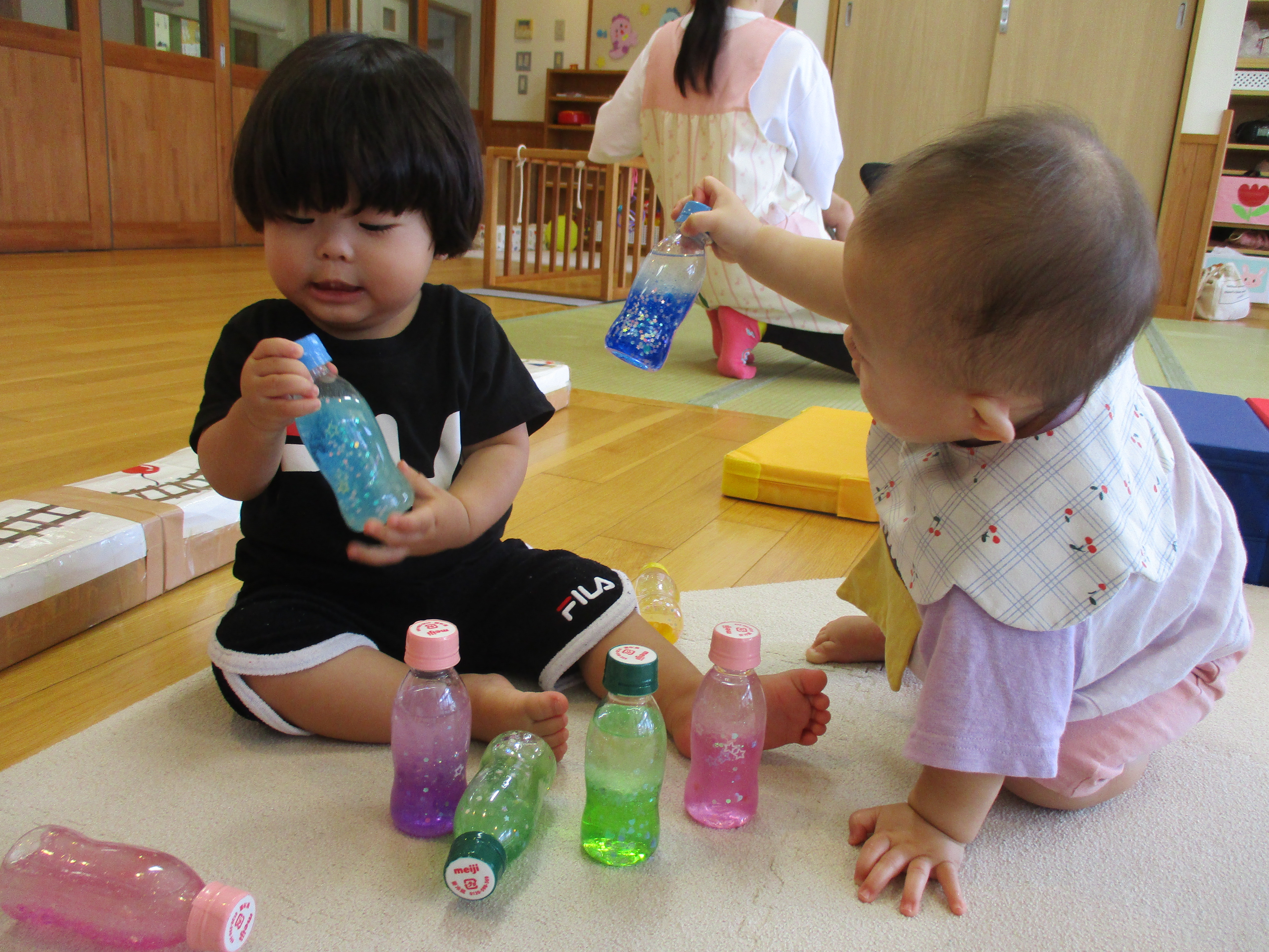 カラフルな色水の中には、キラキラと光るラメやスパンコールが入っていて、ボトルを傾けると、中のキラキラがゆらゆらと揺れて、まるで宝石のよう✨ 子どもたちはその様子に、思わず笑顔がこぼれていました🥰🥰