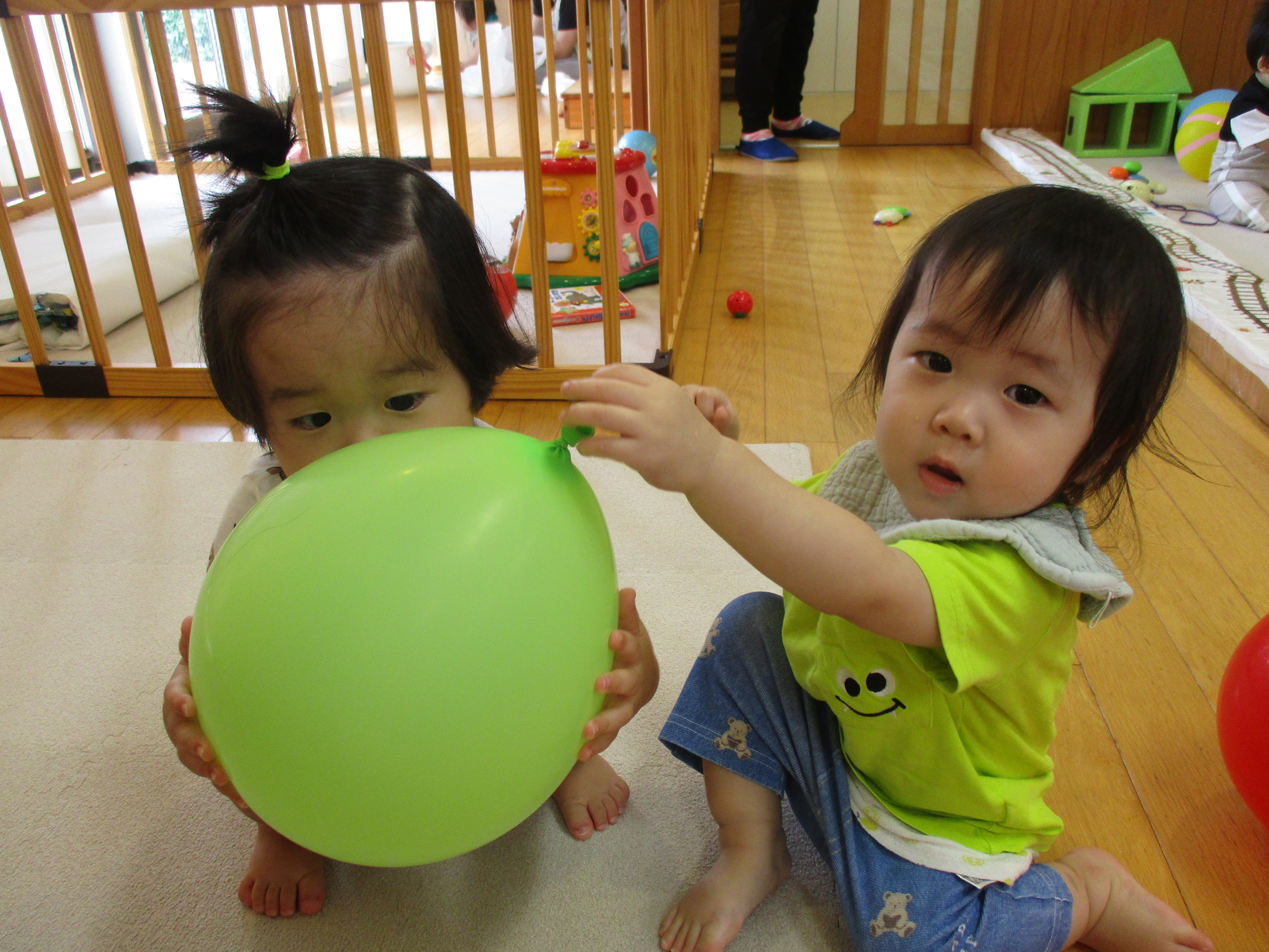 小さな手でポーンと投げたり、保育者の「321…それ~!」の合図で上から落としてみたり✨ 風船がゆっくりと落ちてくる様子をじっと見つめ、手を伸ばしてキャッチ!