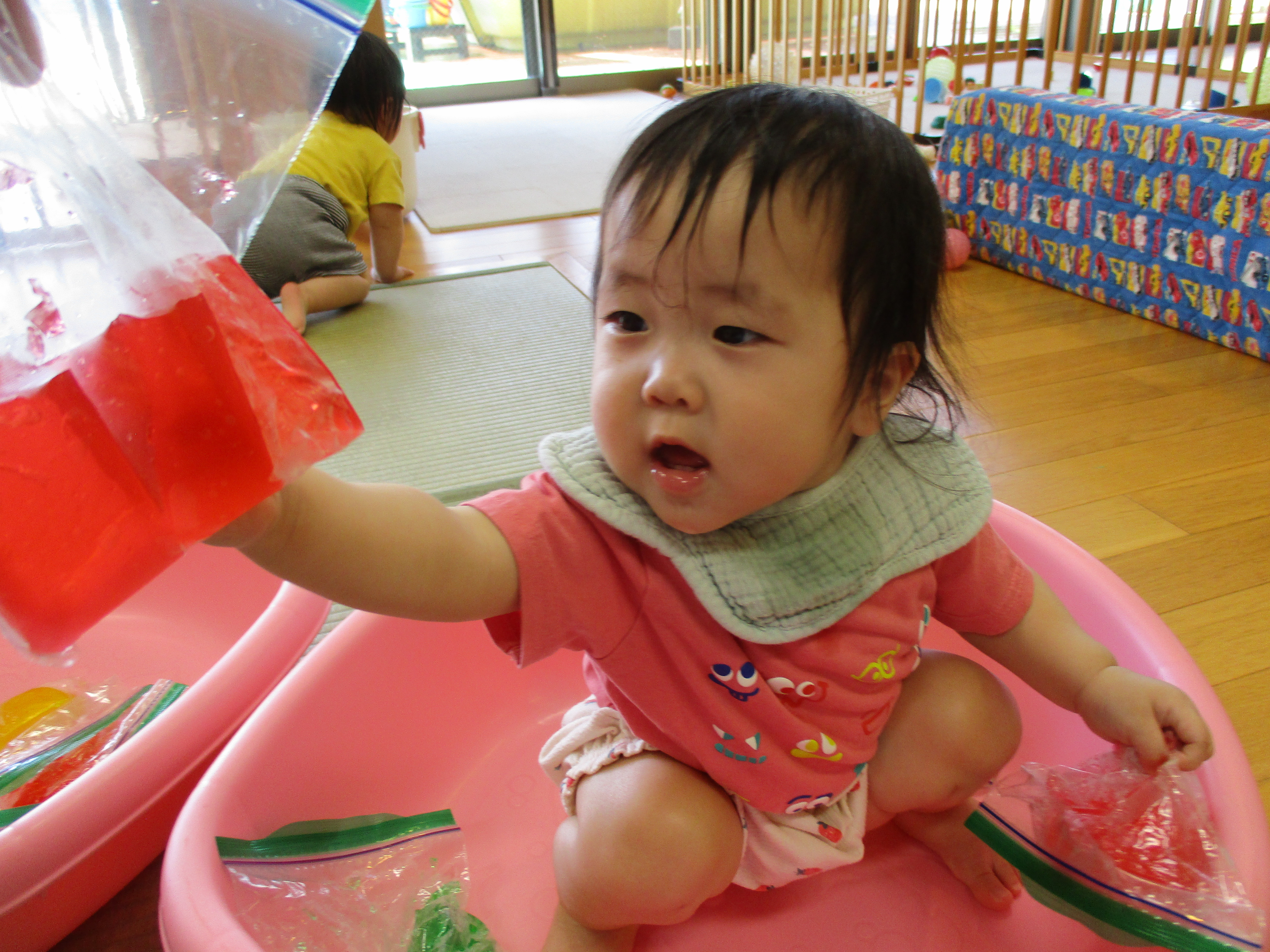 赤、青、黄、緑とカラフルな寒天をジップロックに入れ、最初は「何だろう?」と不思議そうに見つめていたつくしさん😮