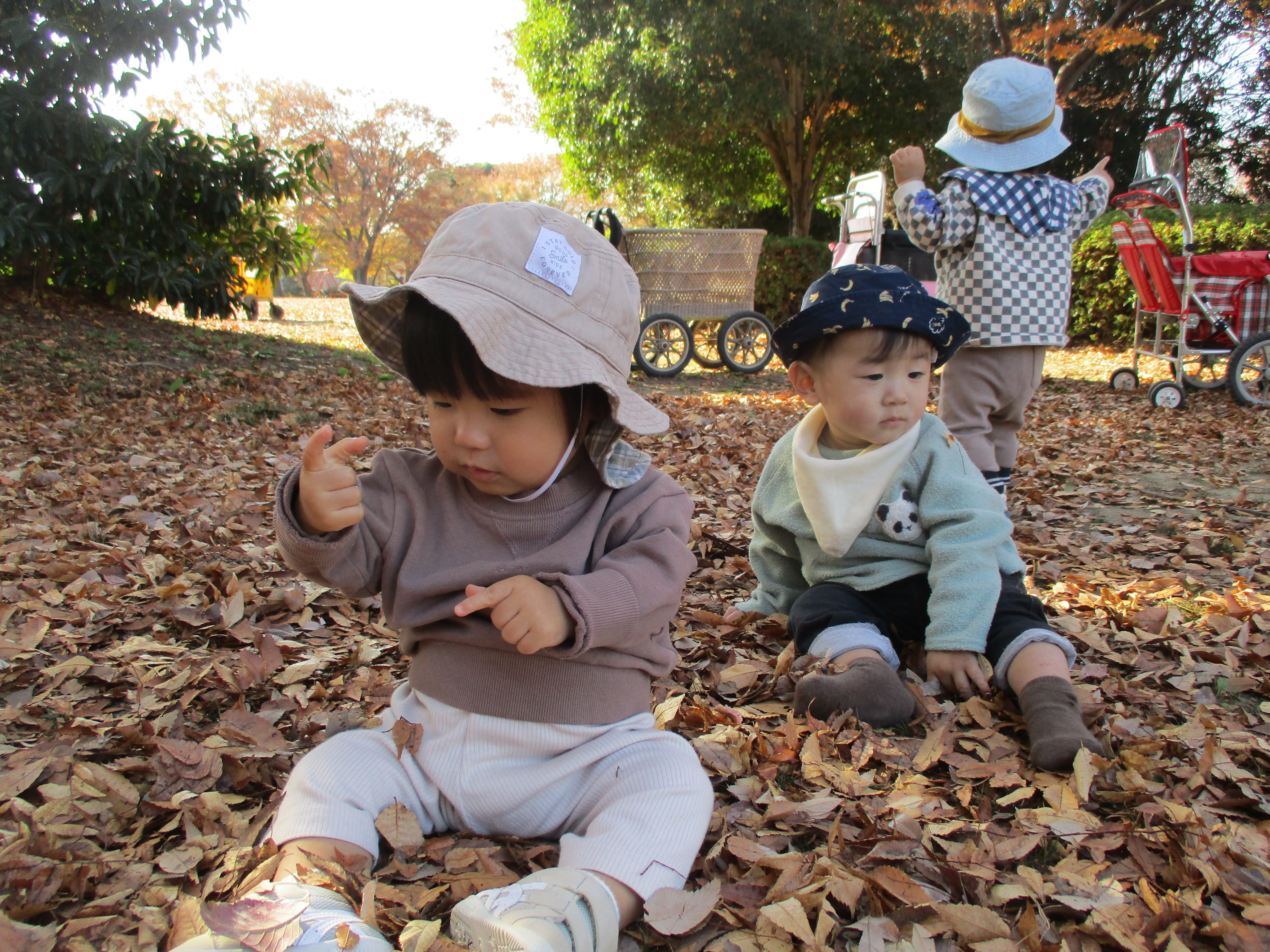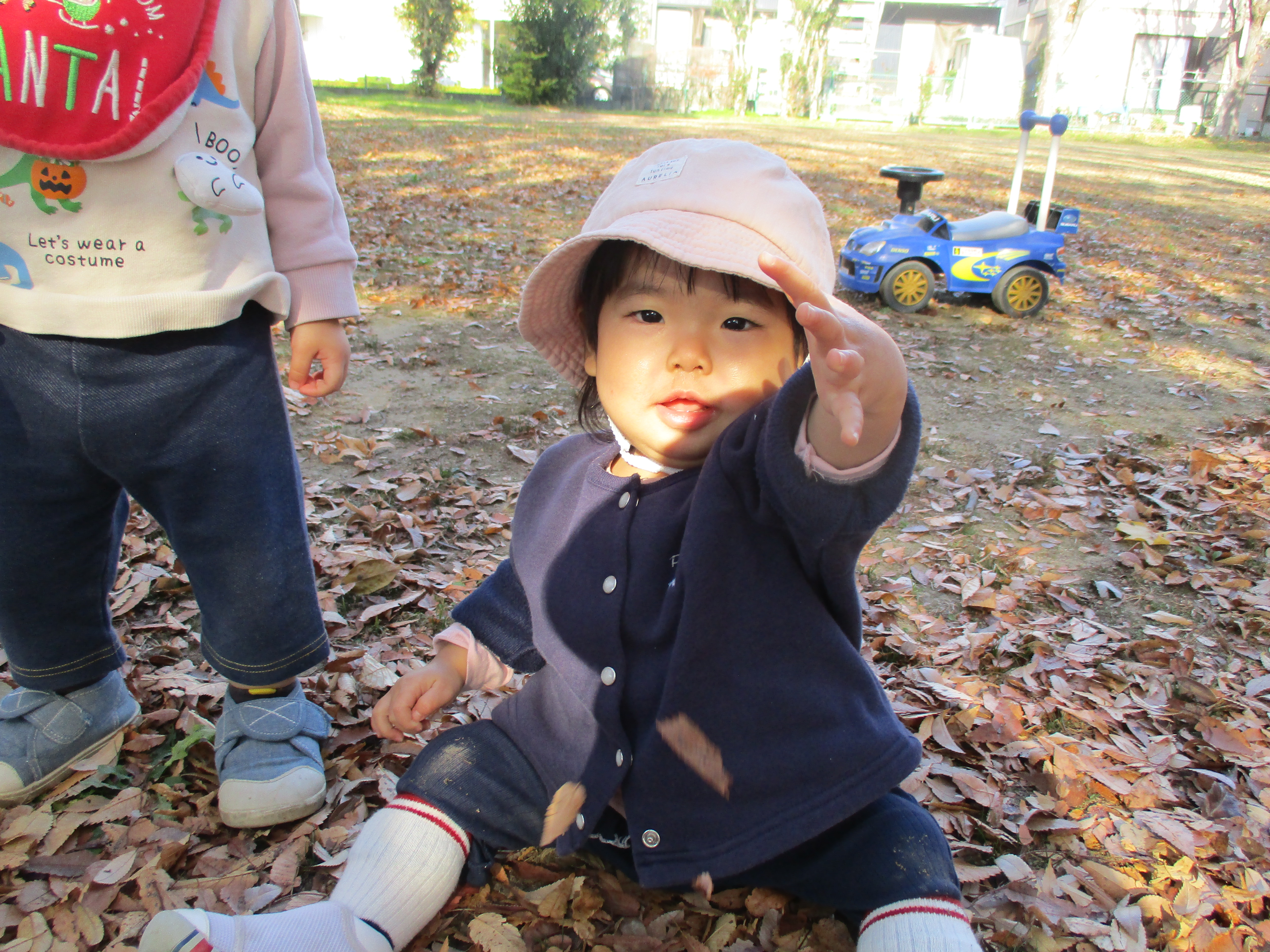 落ち葉を見つけると、拾ってポーンと投げてみたり、じっと見つめたり、、👀保育者がたくさんの落ち葉を拾い、落ち葉シャワーをすると「わぁ~!!」と喜び真似をする子どもたちです💖「せーのっ!」の掛け声に合わせてみんなで落ち葉シャワーを楽しみました🎶