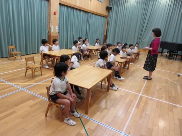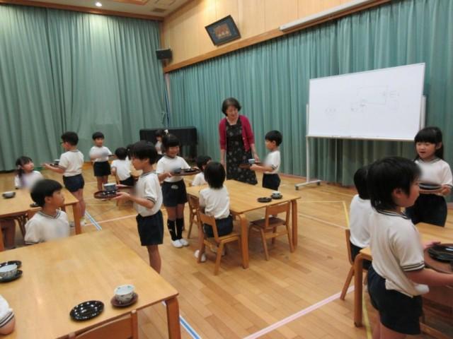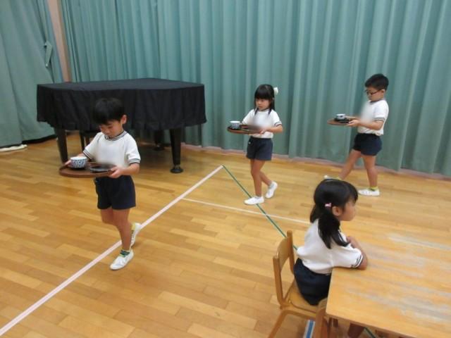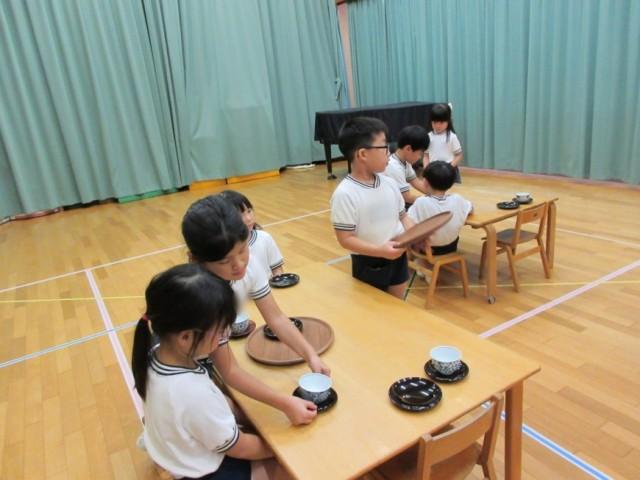 今回は湯呑みも茶托の上に置いて運ぶ練習をしました。みんな上手に運ぶことができ、出したり、下げたりするのも教わった通りにできていました。いつも元気いっぱいのひまわり組さんですが、緊張しているのか、不安なのか、「どうぞお召し上がりくださいませ」、「お下げします」などの言葉を少し小さめの声で言っている姿が微笑ましいです。