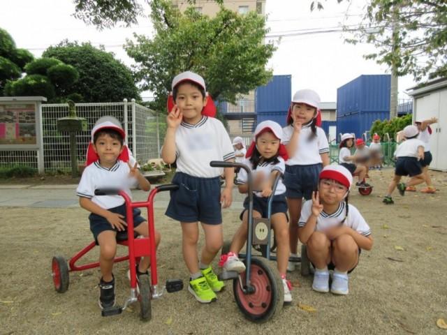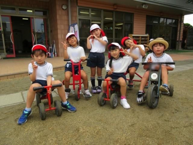 三輪車に乗ったり、乗っている子を押してあげたり、砂場で遊んだり、バナナおにごっこをしたりなどみんなで仲良く遊んでいますよ。
