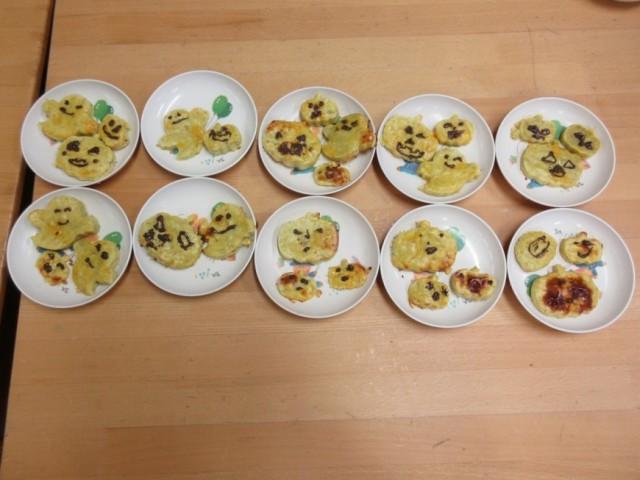 ハロウィン当日だったので、おばけとかぼちゃの型を使って形を作り、焼いてもらったあとにはチョコペンで目や口を描きました。1人1人こだわって形を作ったり、チョコペンでとても真剣な表情で集中して顔を描いたりなど、とても楽しんでいる姿が見られ、「クッキング楽しかった!」、「最高なおやつだった〜」、「今日は最高な1日だった!」と言っている子が多く、とても嬉しかったです。