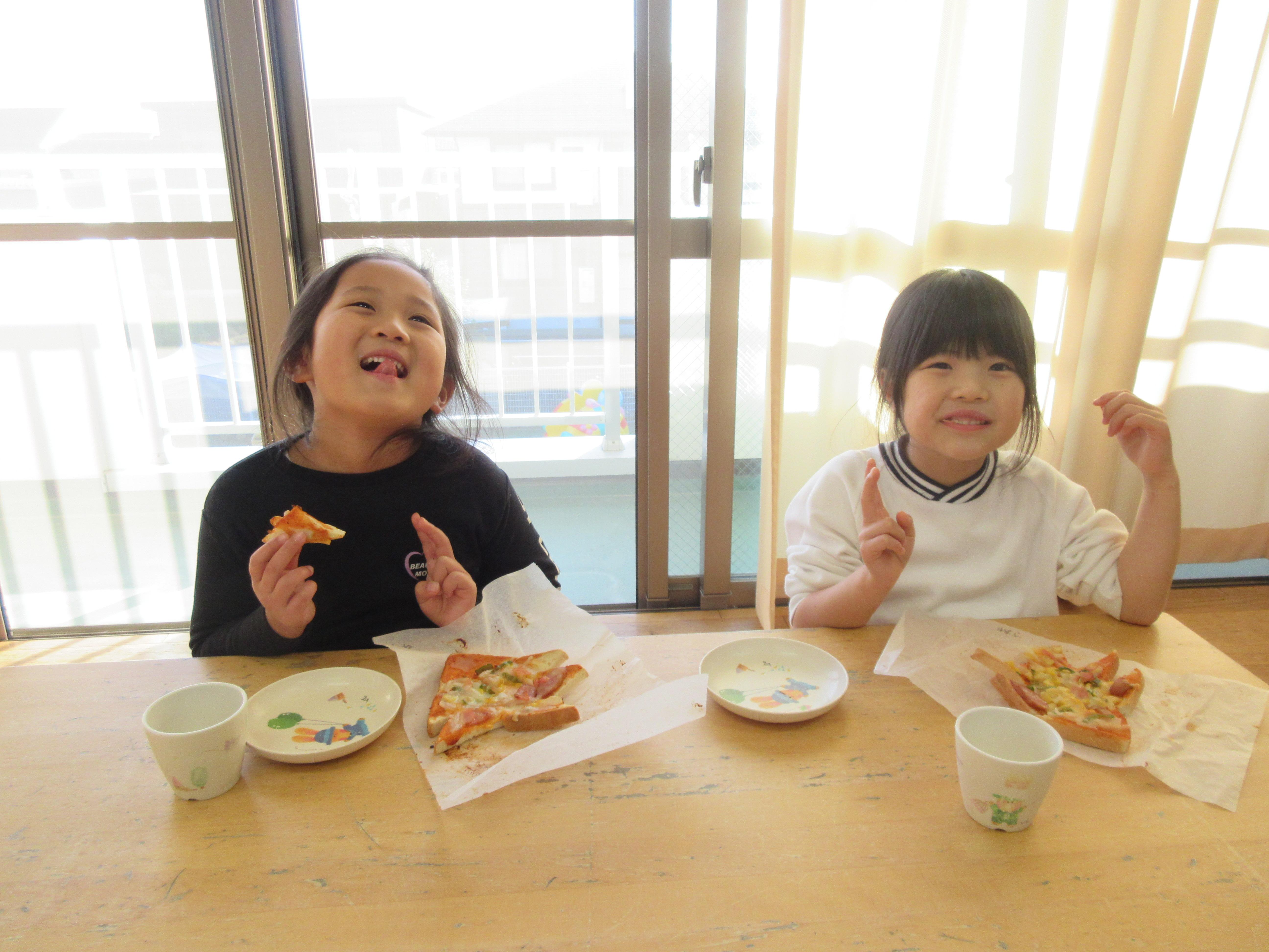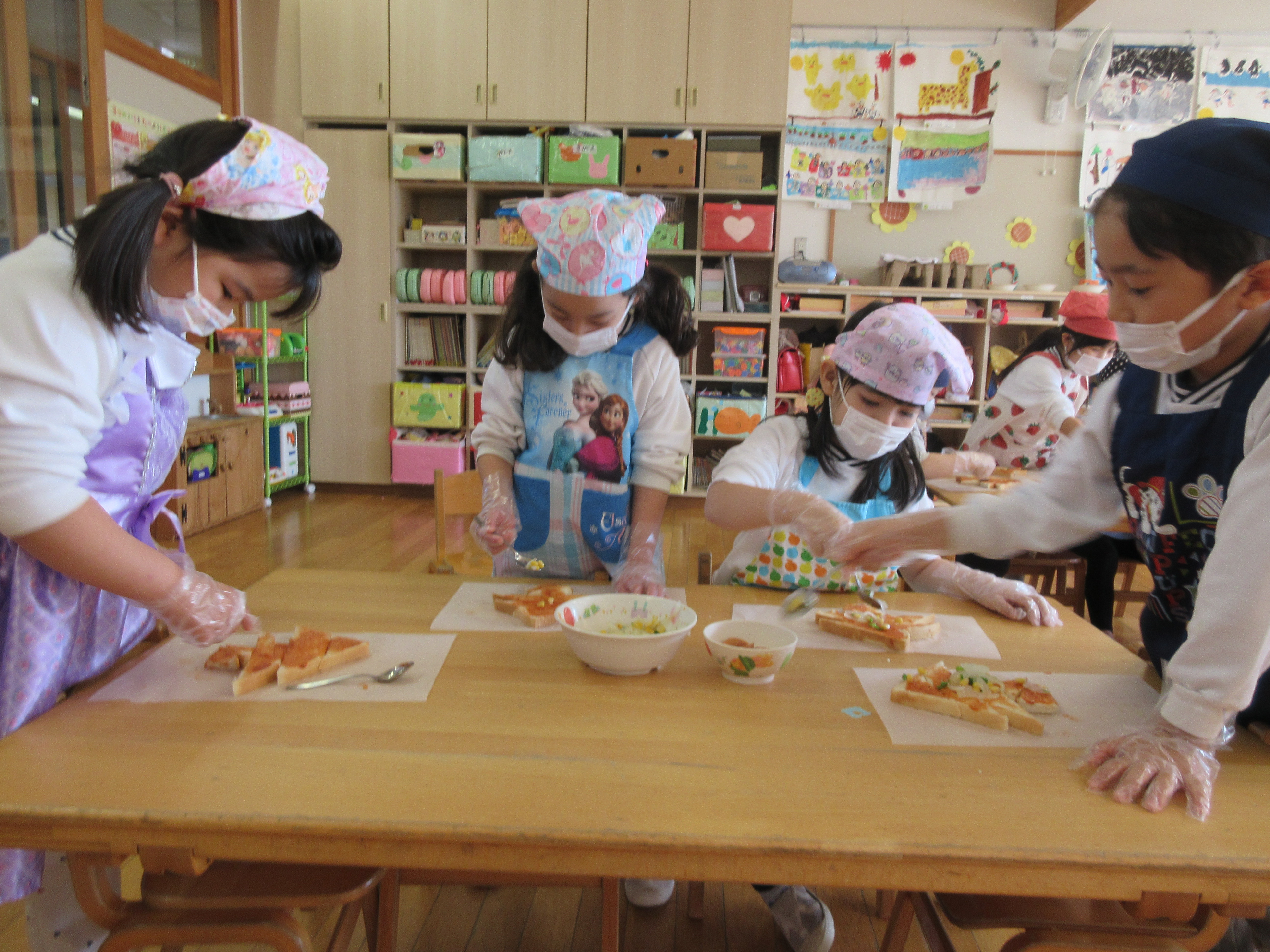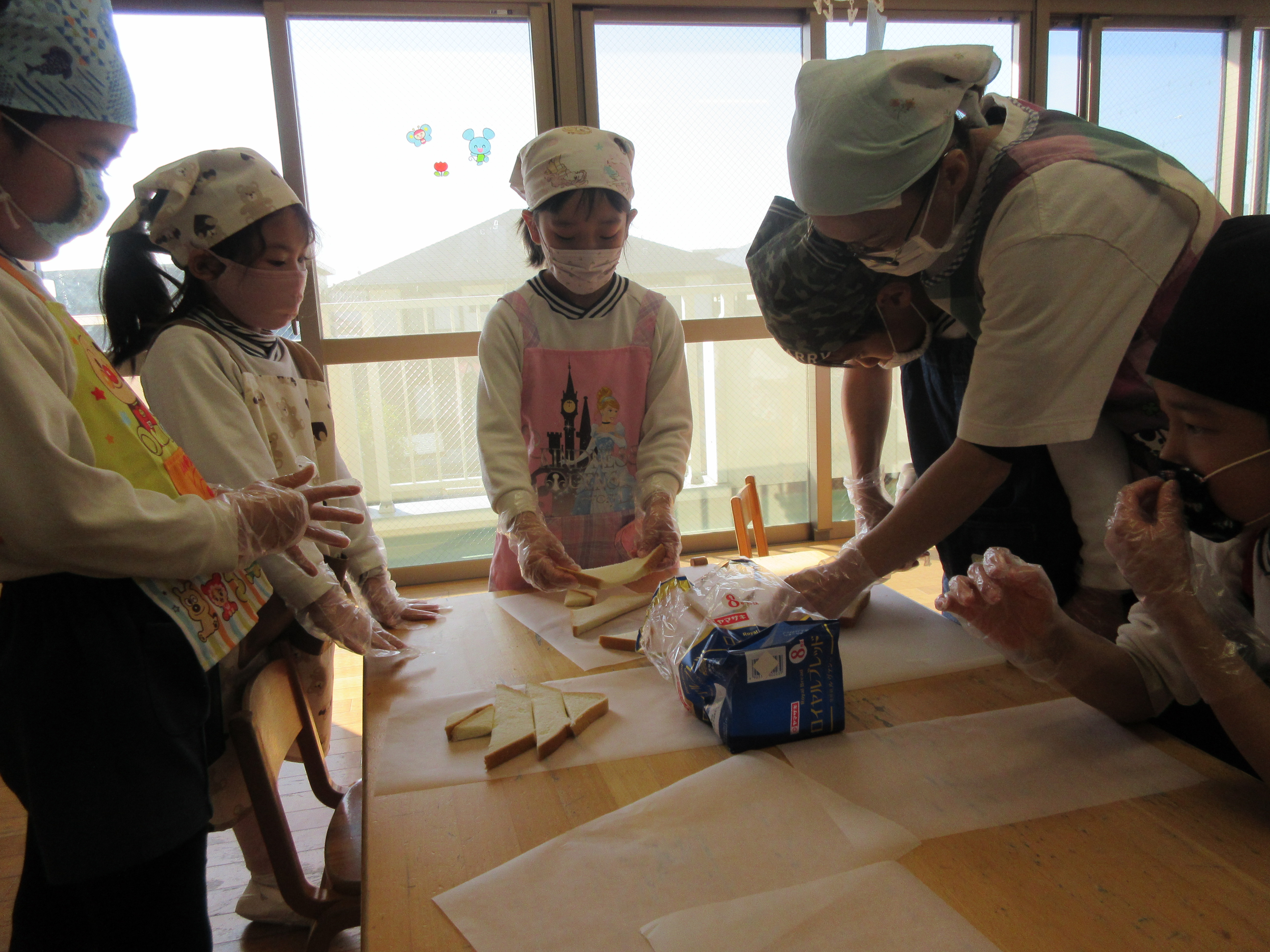 保育者と一緒に食パンを切って、こども達が並べ替え、
