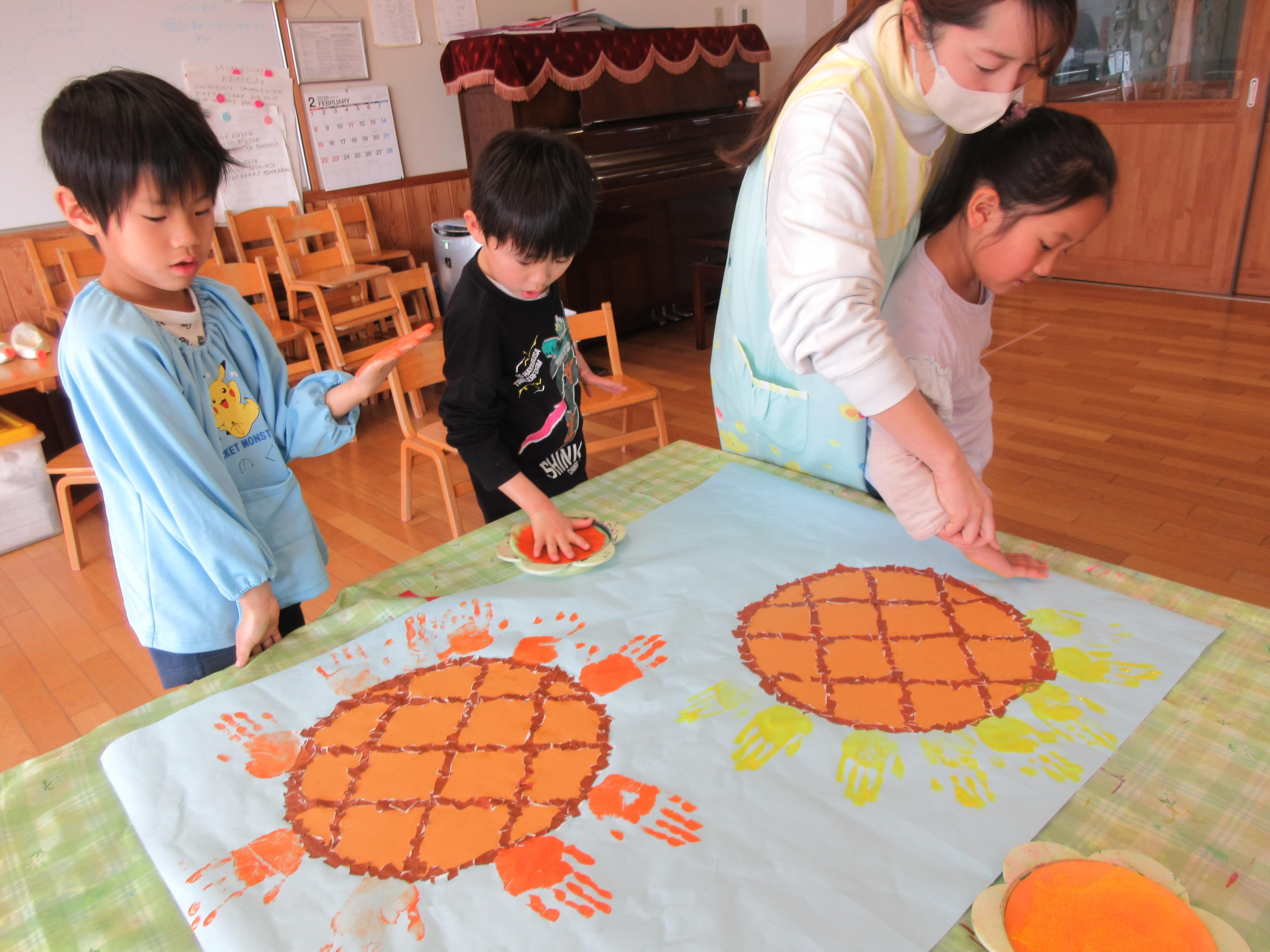 枠作りが完成すると、今度はその周りに手形をつけていきます。