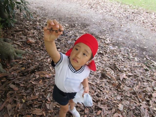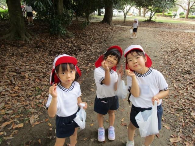先日、ひまわり組さんと一緒に大蒲公園へお散歩に行きました。公園に着くと、どんぐりや木の実がいっぱい落ちていて、早く拾いたくてワクワクしている子どもたちでした。1人ずつ保育者から袋をもらうとどんぐり探しへいざ出発!落ち葉をどかしてどんぐりを見つけると次々と袋の中へ入れていました。「みて、ぼうしつきだよ!」「おおきいのとれた!」と嬉しそうに拾ったどんぐりを見せてくれた子どもたちでした。どんぐりが入っている袋を宝物のように大事に持って帰っている姿は、なんだか微笑ましかったです!また天気がいい日は散歩に行き、季節を感じていきたいと思います。