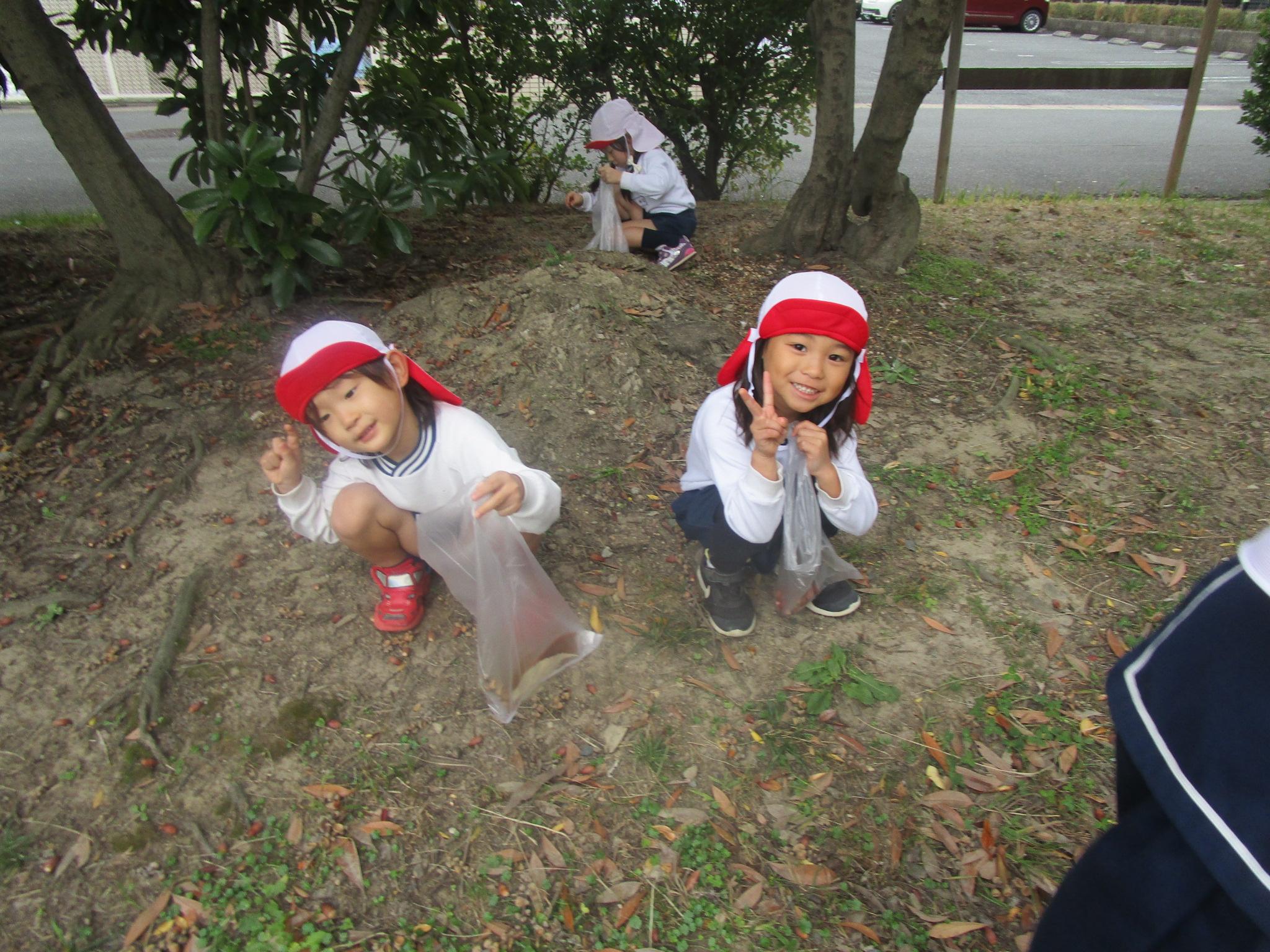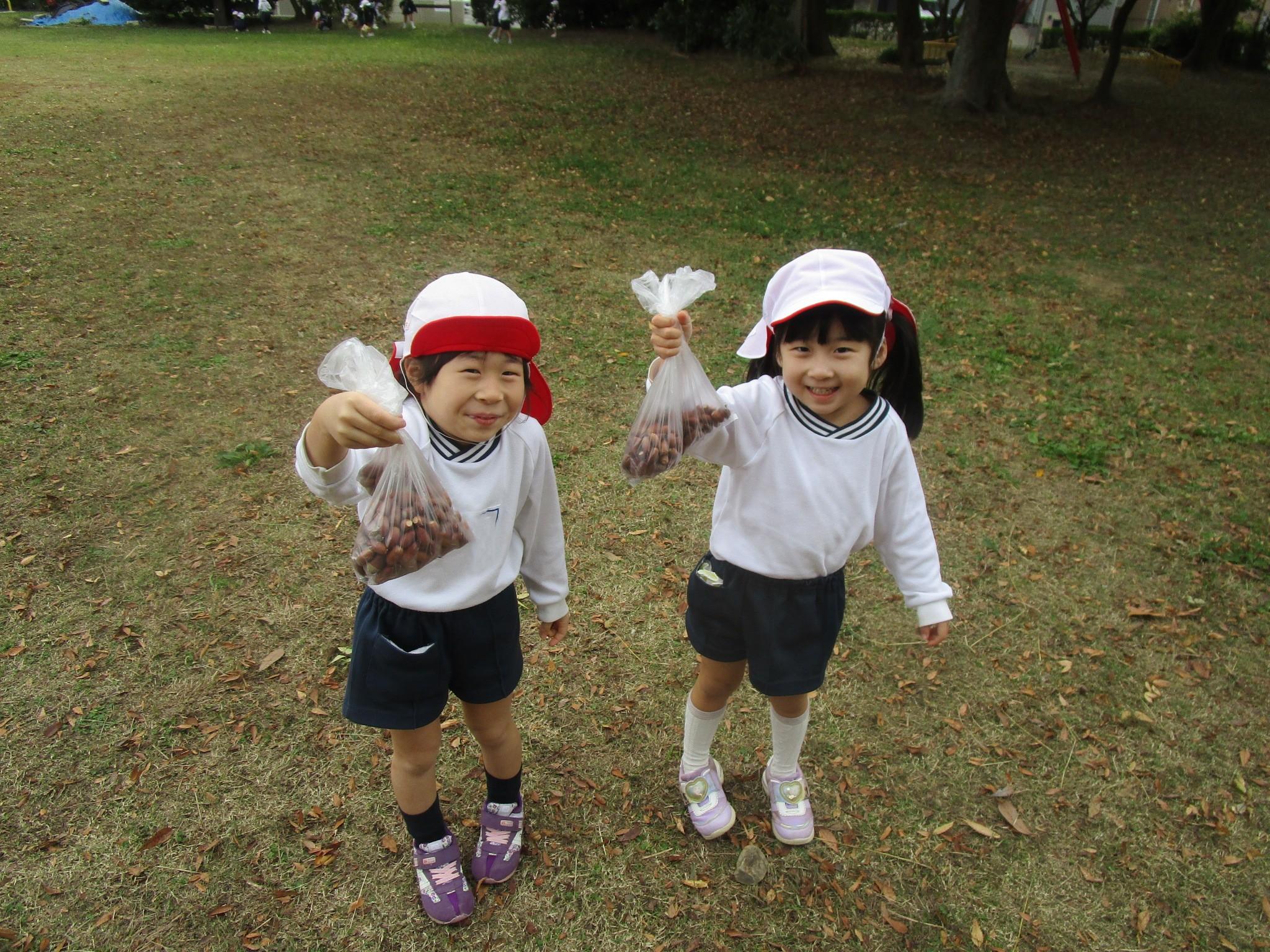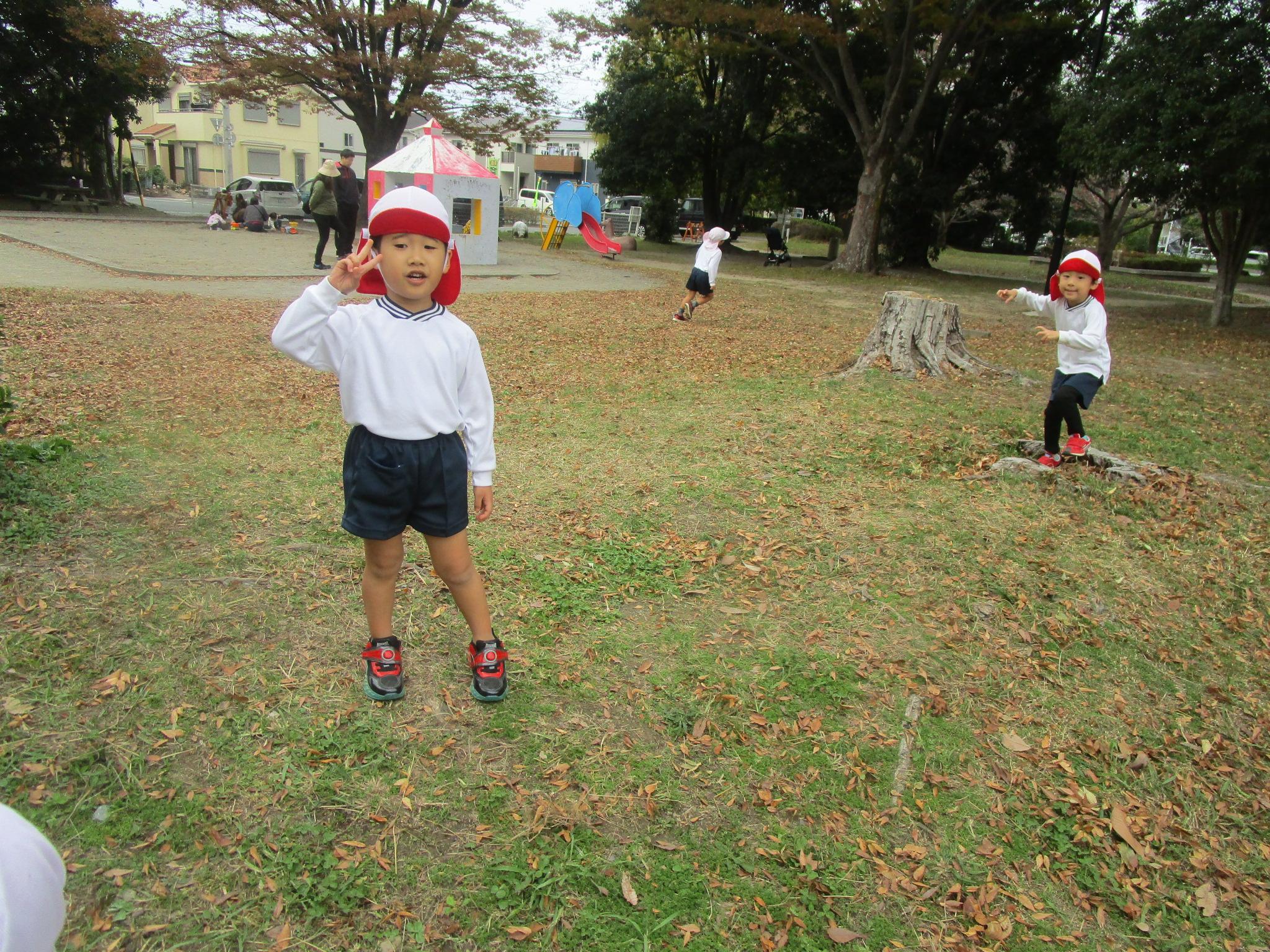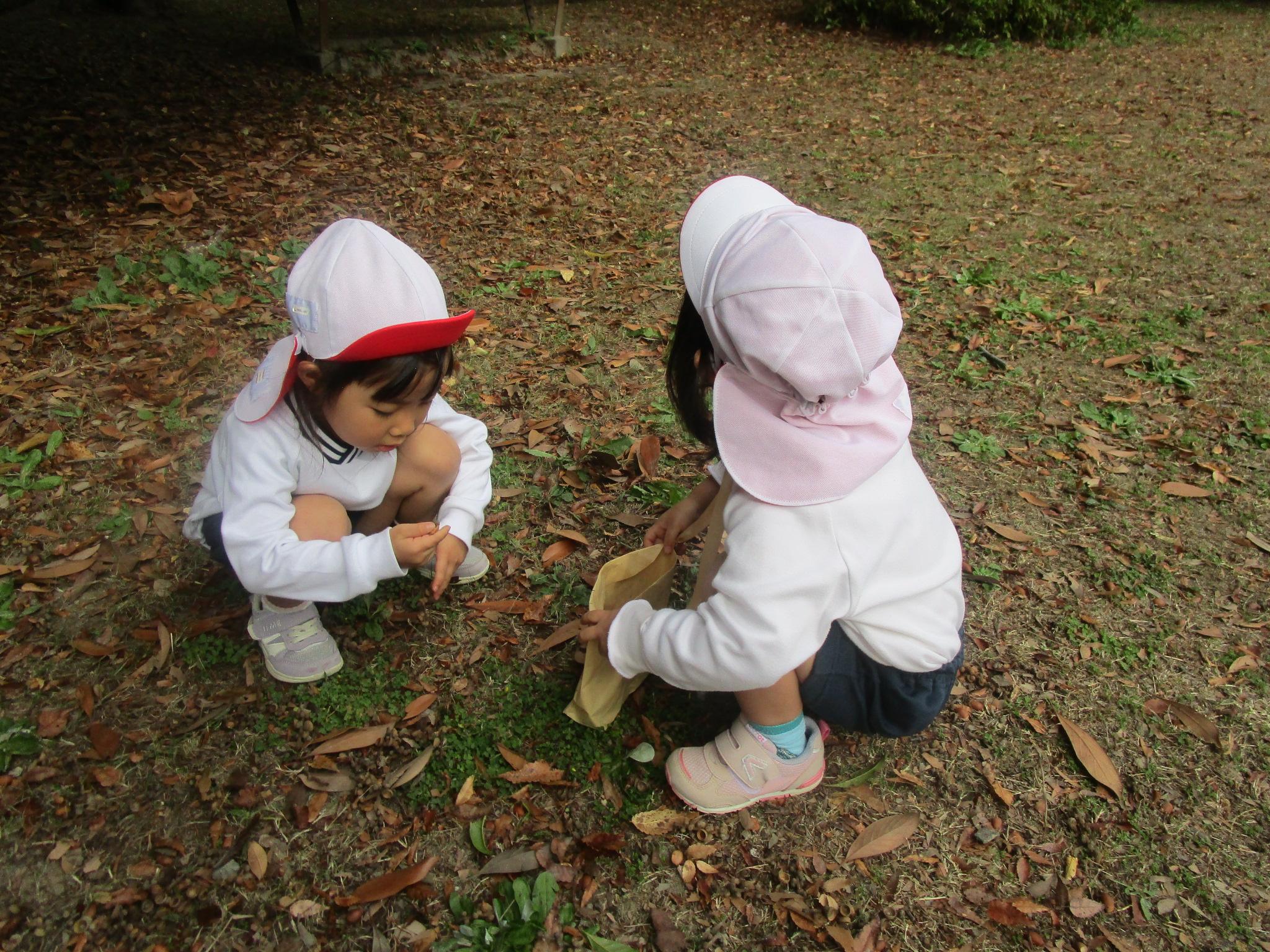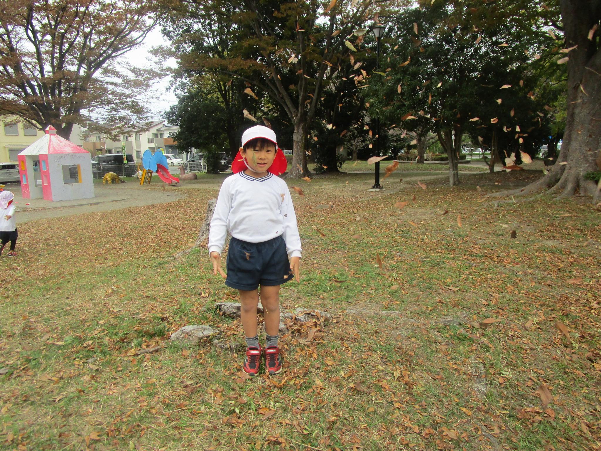 れんげ組さんと大蒲公園にお散歩に行きました。れんげ組さんの手をしっかりと繋いで前の子と間が空くと「いくよー!」と声を掛け、励ましてくれたゆり組さん。すごくたくましく見えました。公園に到着し、いざ散策タイム!どんぐりを拾って袋に入れる子や落ち葉を集めて上から降らせる子などそれぞれ好きなあそびを楽しむ姿が見られました。れんげ組のお友だちにどんぐりがある所を教えてあげたりどんぐりを分けてあげたりとお兄さんお姉さんらしく優しく関わっていましたよ。気候も涼しくなり、秋を感じながら遊ぶことができました!