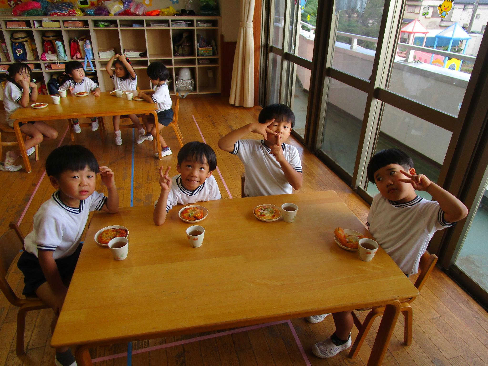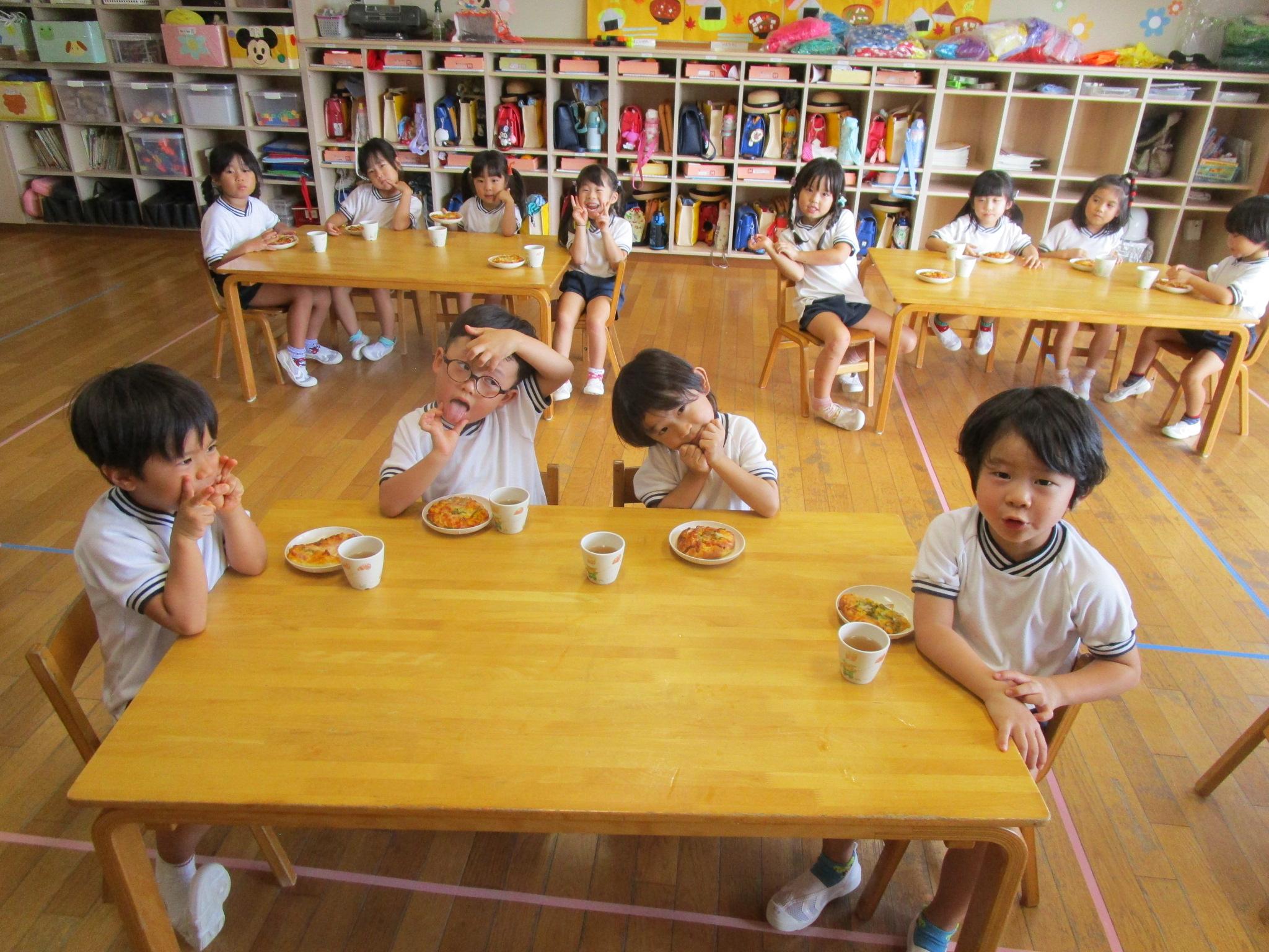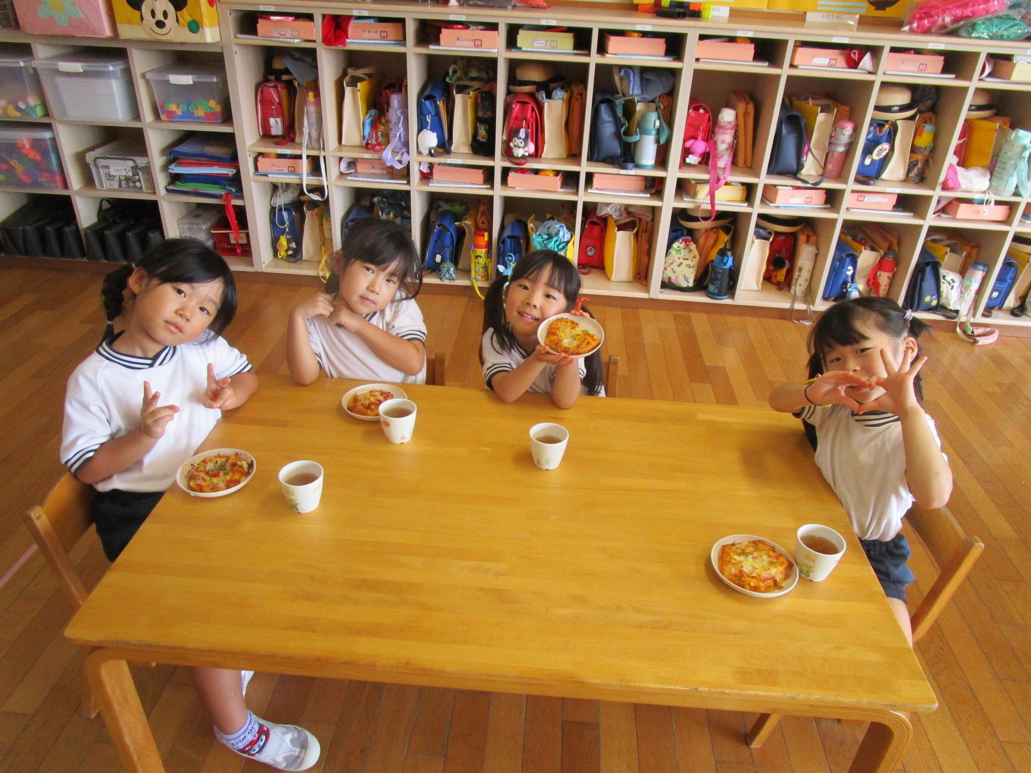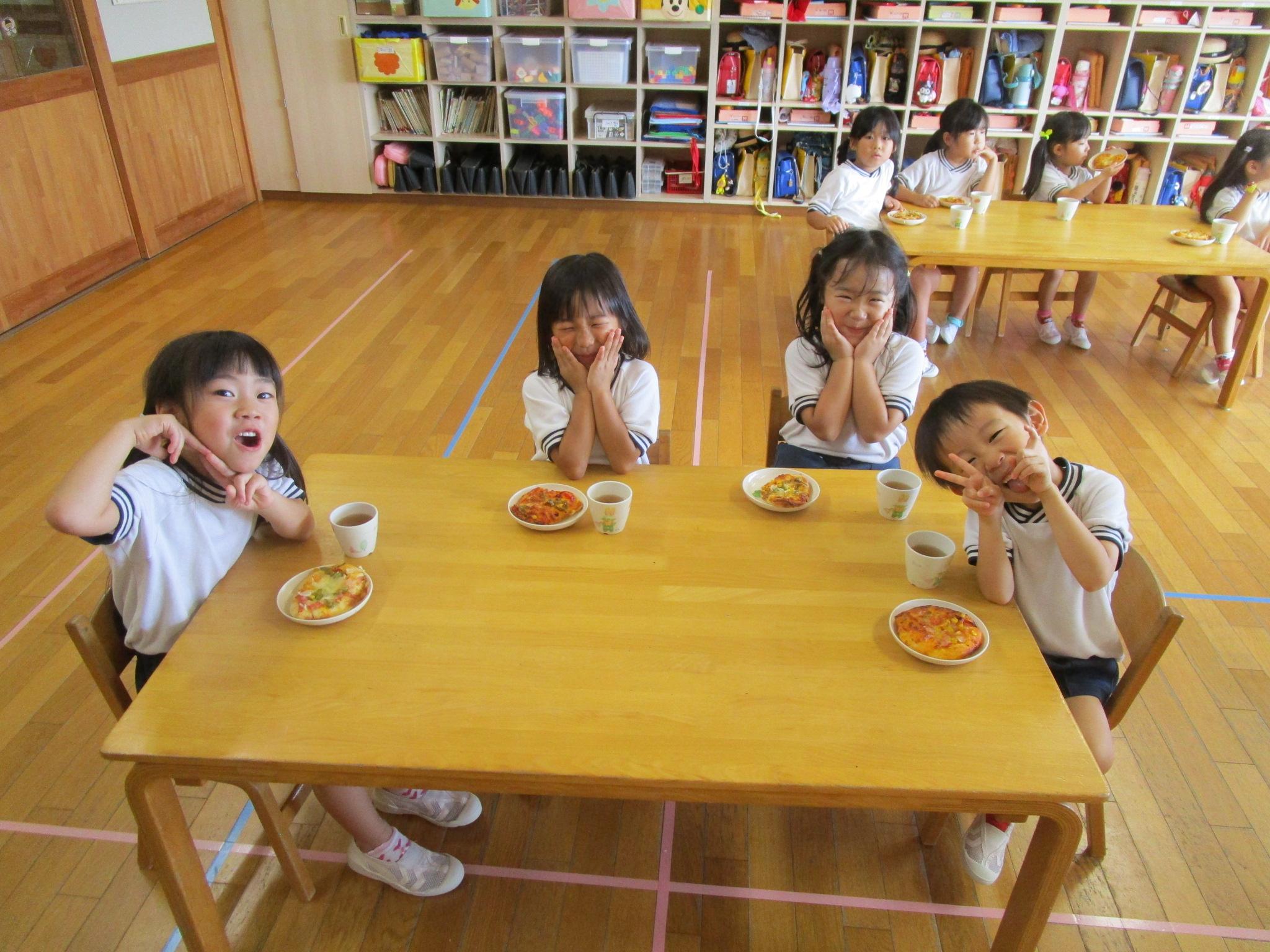 まずは生地をこねて好きな形に伸ばしていきました。生地の柔らかい感触や香りを楽しむ子どもたちの姿が見られましたよ。トッピングは好きな具材を好きなだけ盛っていたので個性が出て面白かったです。その後、給食室で焼いてもらい、ふっくらと美味しそうなピザが出来上がりました!出来立てのピザを保育室に持って行くと「いいにおい~」「おいしそう!」と早く食べたくて仕方がない子どもたち!みんなで「いただきます」をして美味しく頂きました。