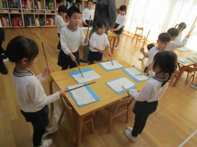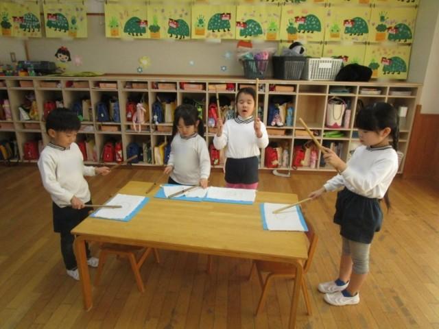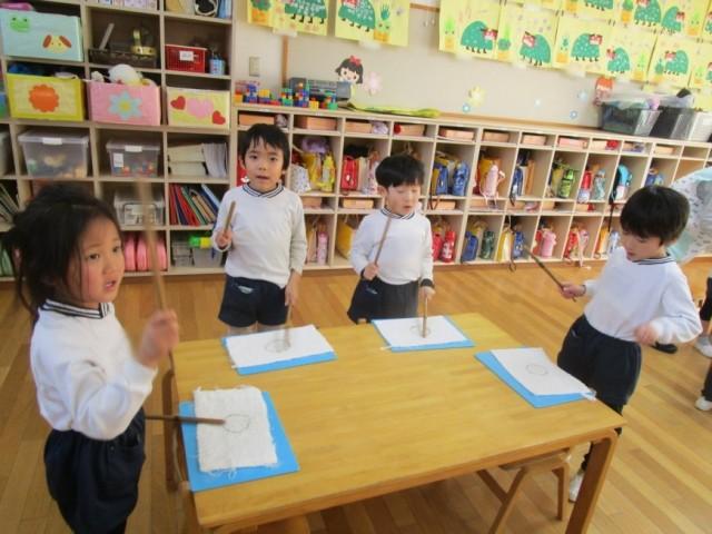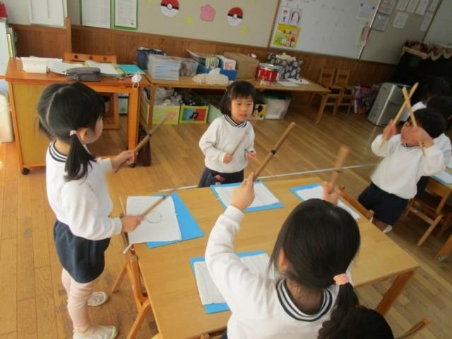 ゆり組さんは3月の卒園式に向けて鼓隊の練習を頑張っています。「たーか たーか たん うん」「と ま と うん」とリズムを声に出しながら一生懸命バチを持って頑張って練習しています。楽器ごとに分かれてパート練習も始まったので無理しないよう楽しんで練習ができるようにしていきたいと思います。リズムを覚えたら次は太鼓を叩いて練習するようになるので、子どもたちも「はやくたいこ、やりたい!」と楽しみにしています。
