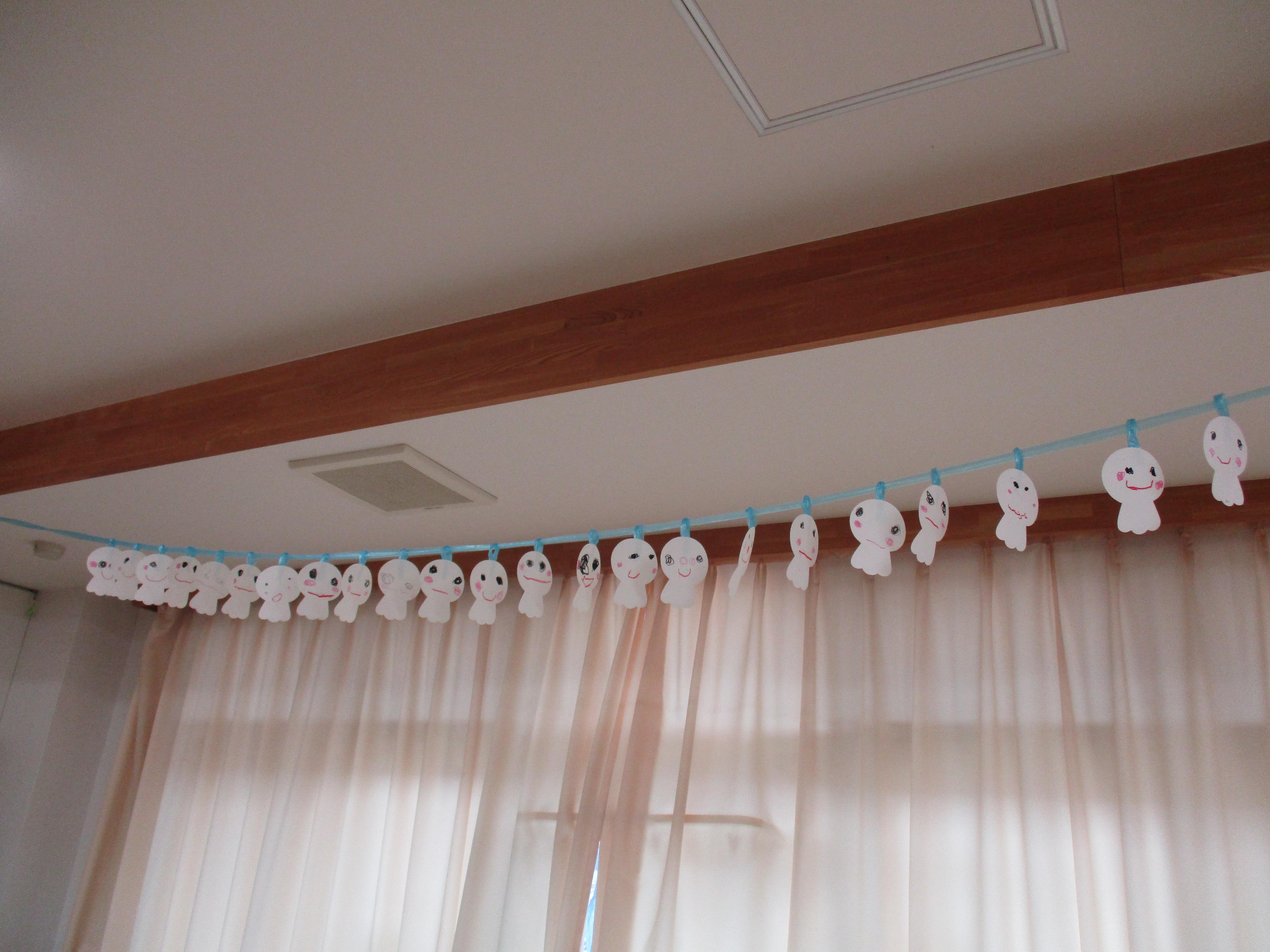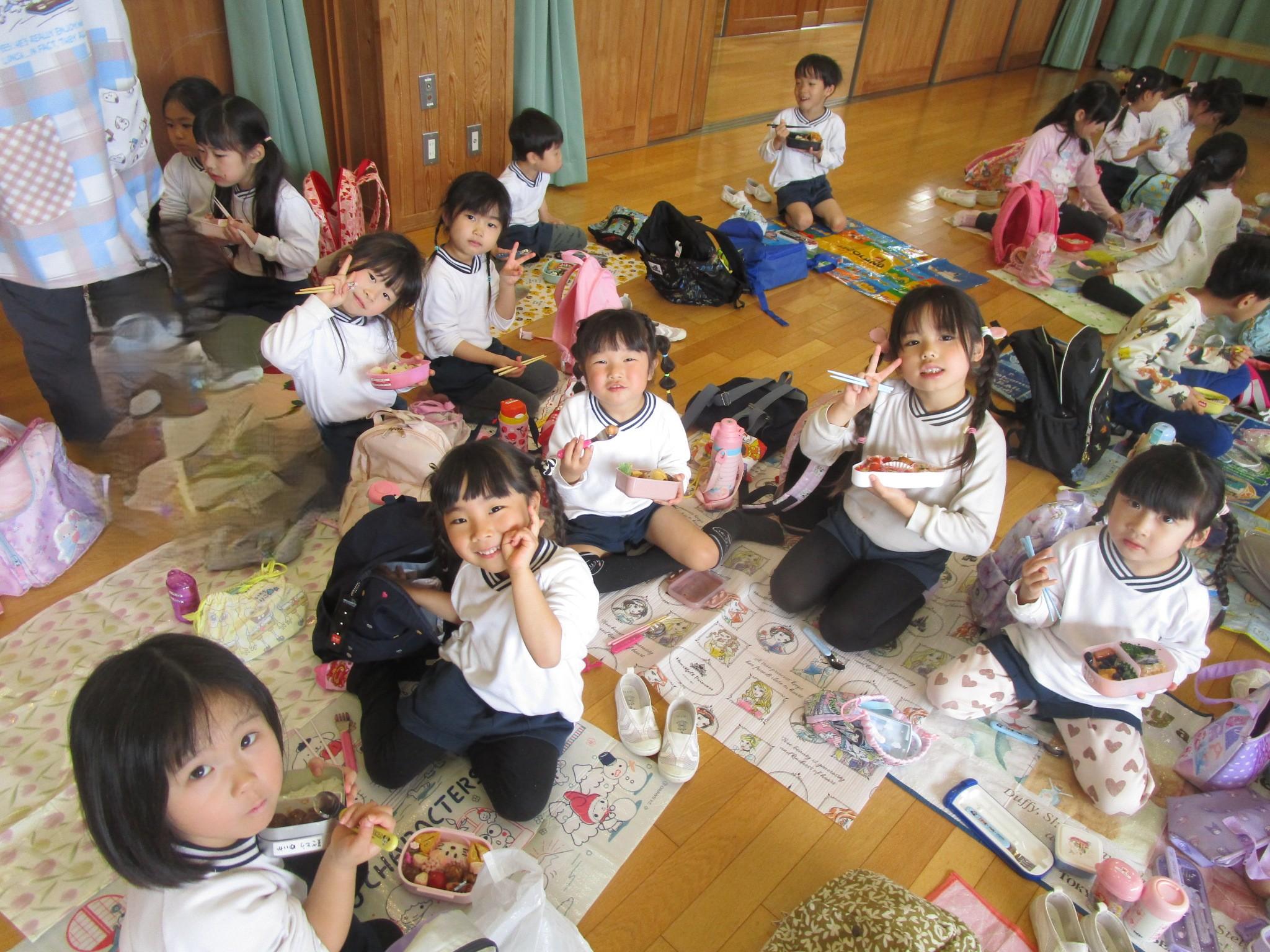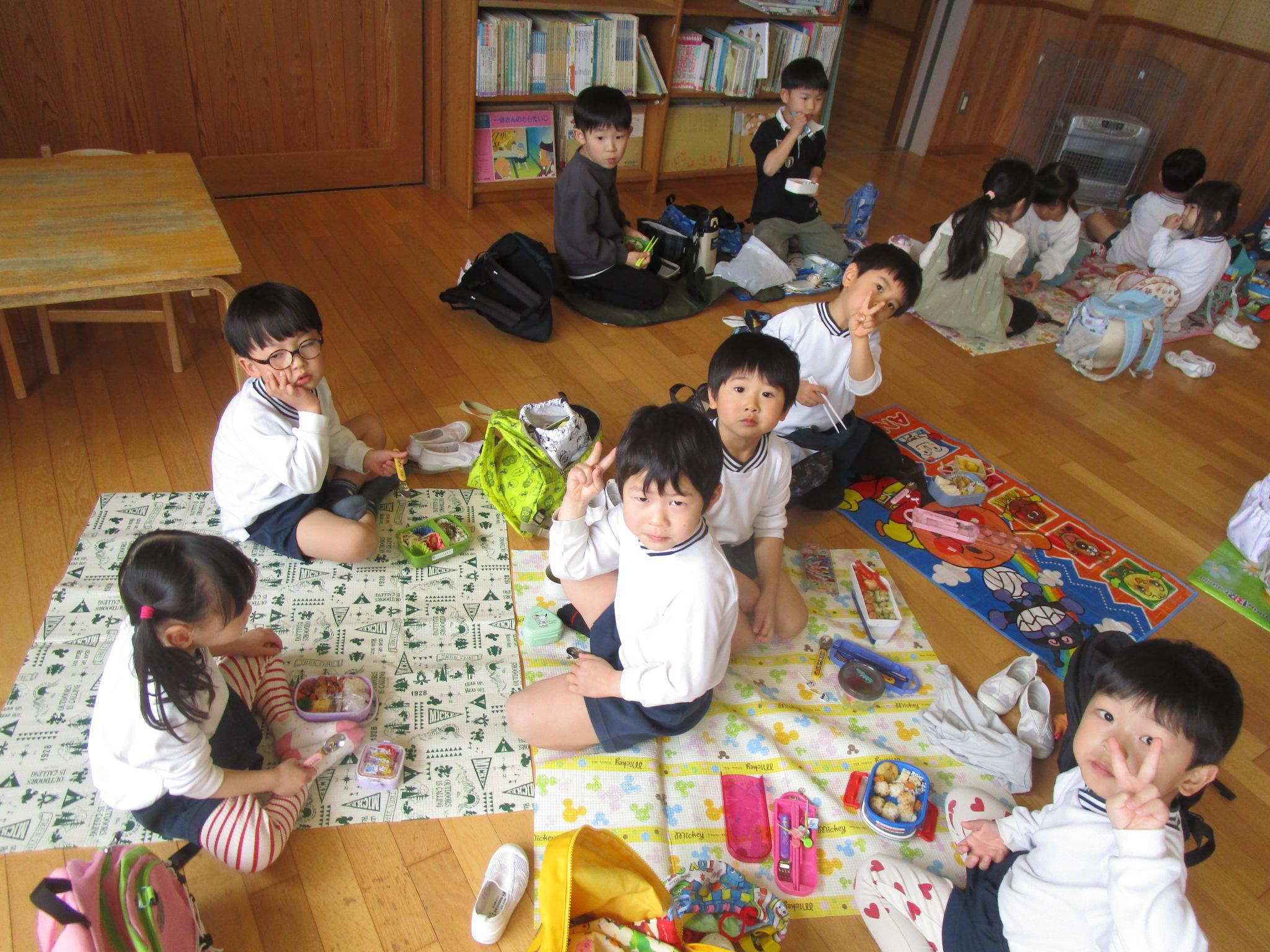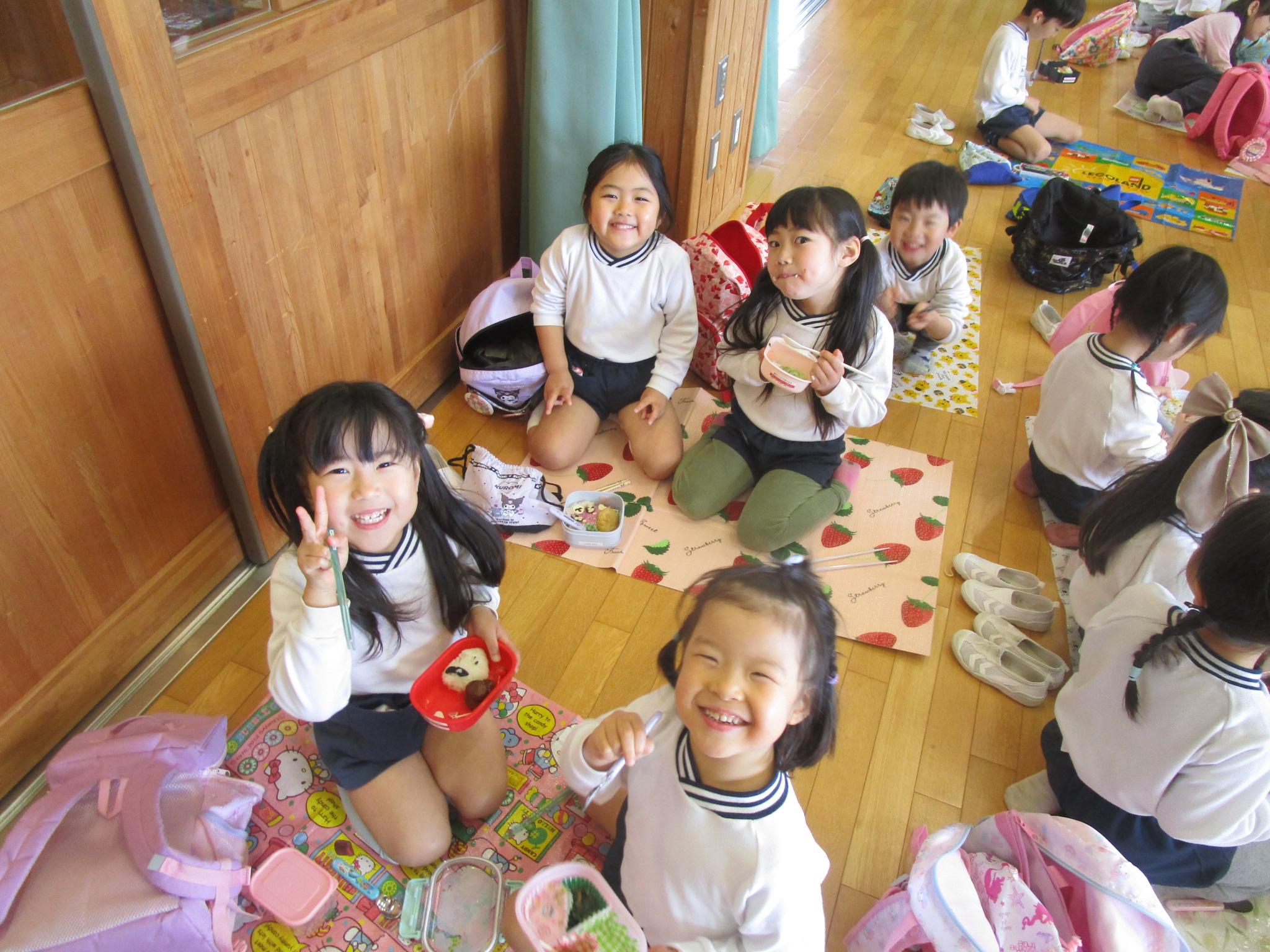 ずっと楽しみにしていたつくしんぼピクニック!「雨で行けないかもしれないから前日にてるてる坊主を作ろうね」と約束をしていたので、かわいくお顔を描いててるてる坊主を作り窓の近くに飾りました。前日の夜から行く直前までの雨で公園に行くことはできませんでしたが、みんなのてるてる坊主のおかげで行く前には雨が止み、すみれさんと手をつないでカメさんを見に行って一緒にお菓子を食べたり、お遊戯室でゆりさん・ひまわりさんと一緒にお弁当を食べたりなど、楽しむことができました。「今日1日楽しかった!」「お菓子とお弁当美味しかった~」と喜んでお話ししてくれる子が多く、嬉しかったです。ご準備ありがとうございました。