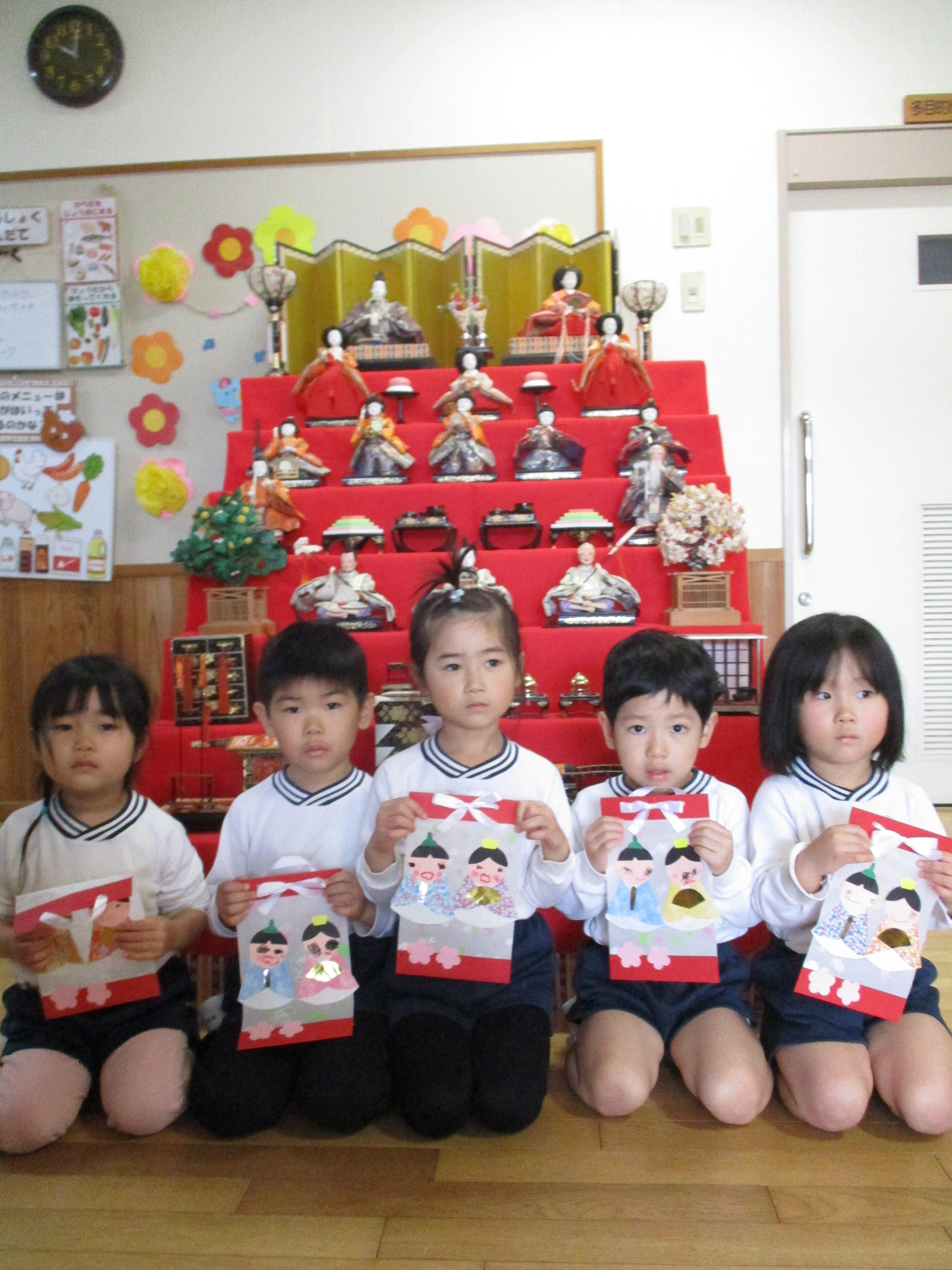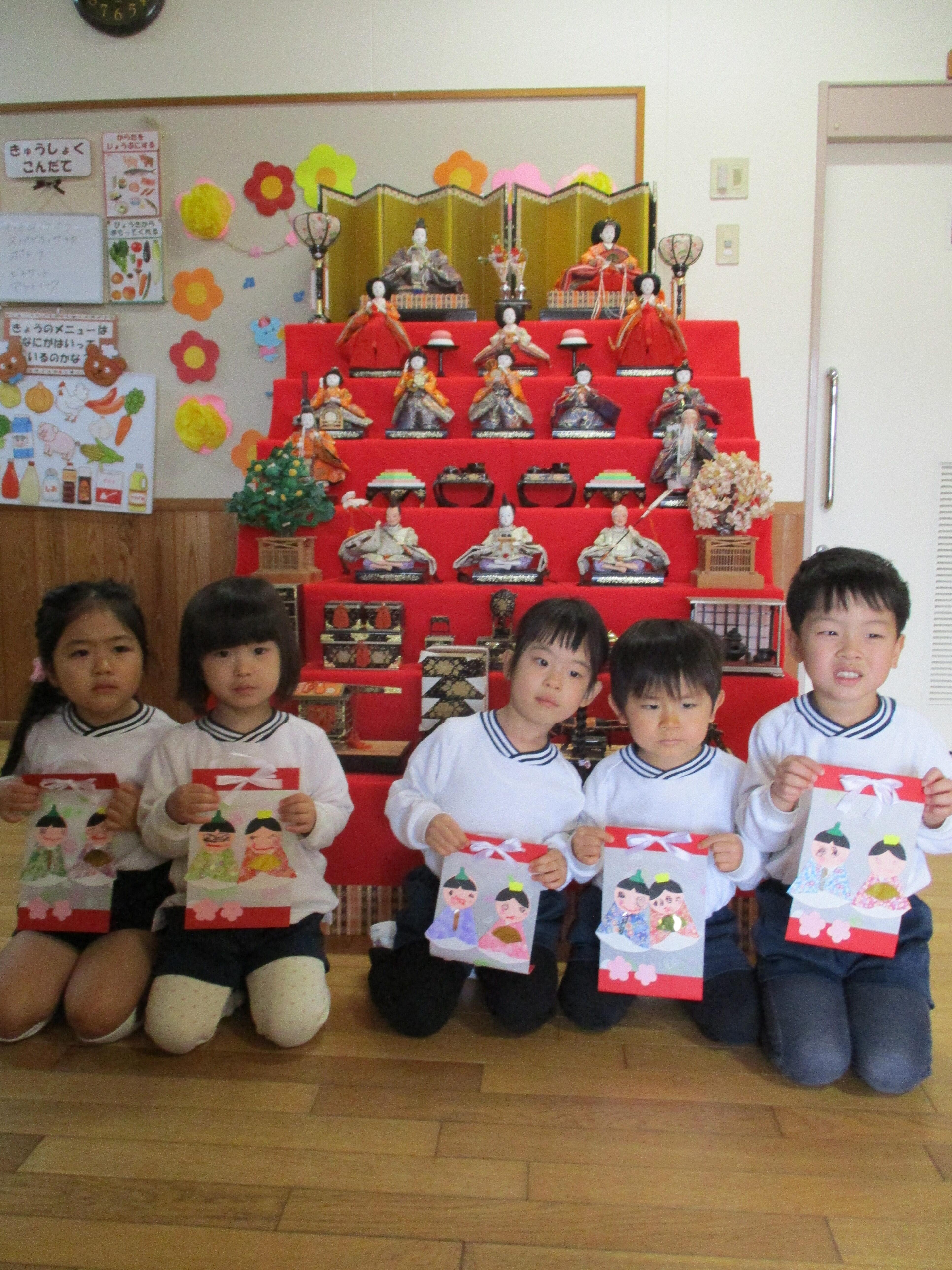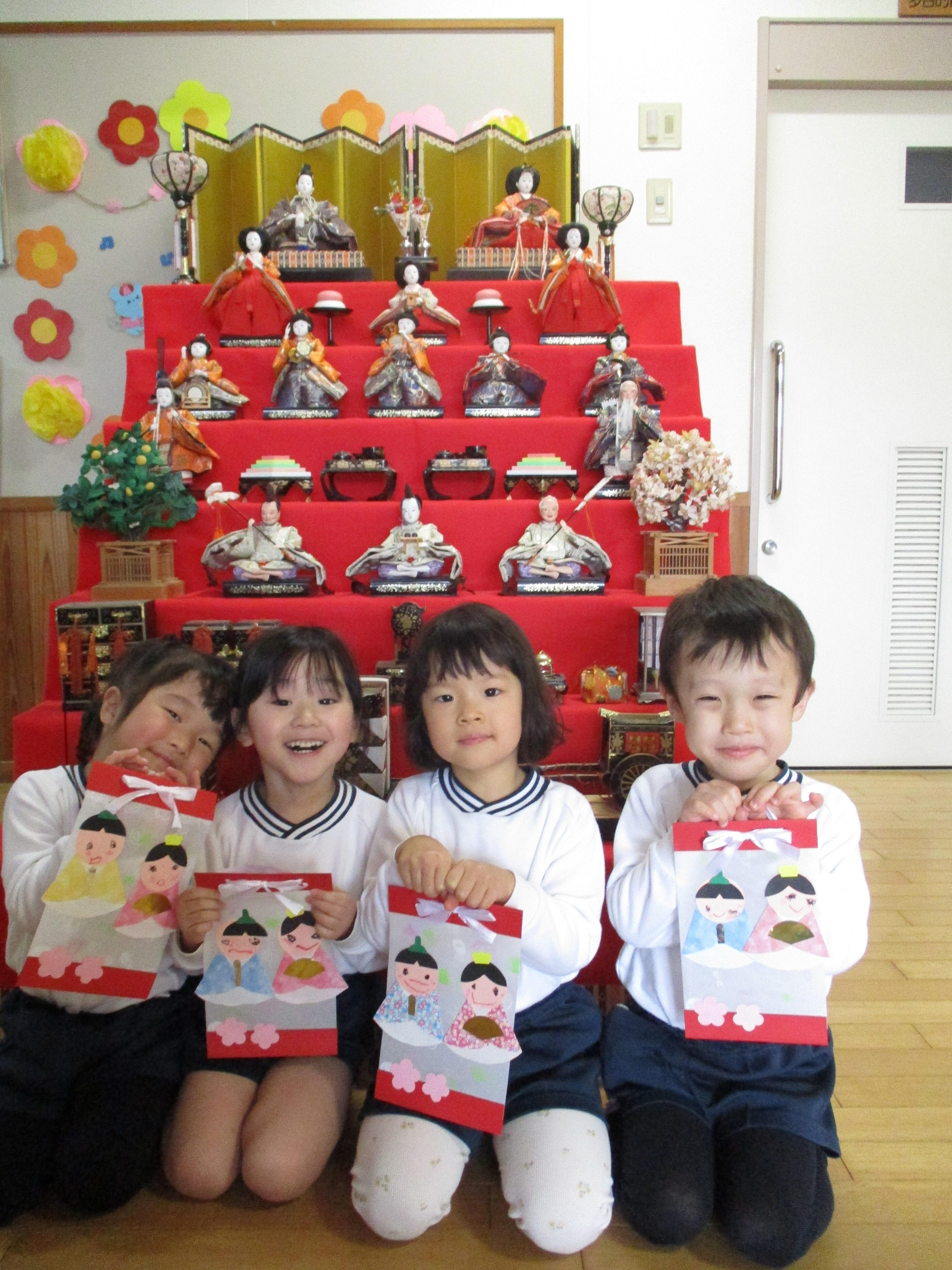 ひな祭りの製作で作ったひなあられを持って、お雛様と一緒にお写真を撮りました。