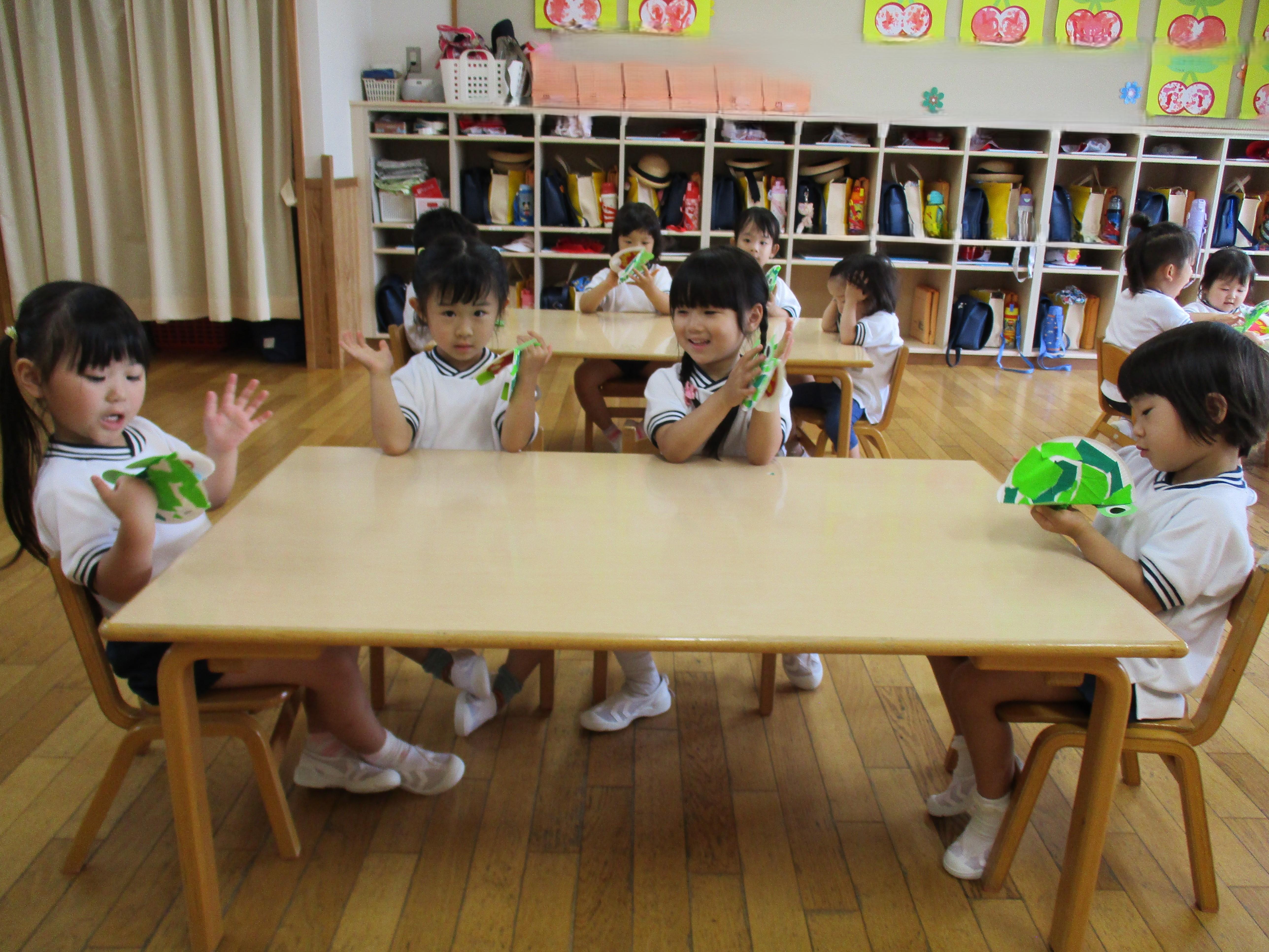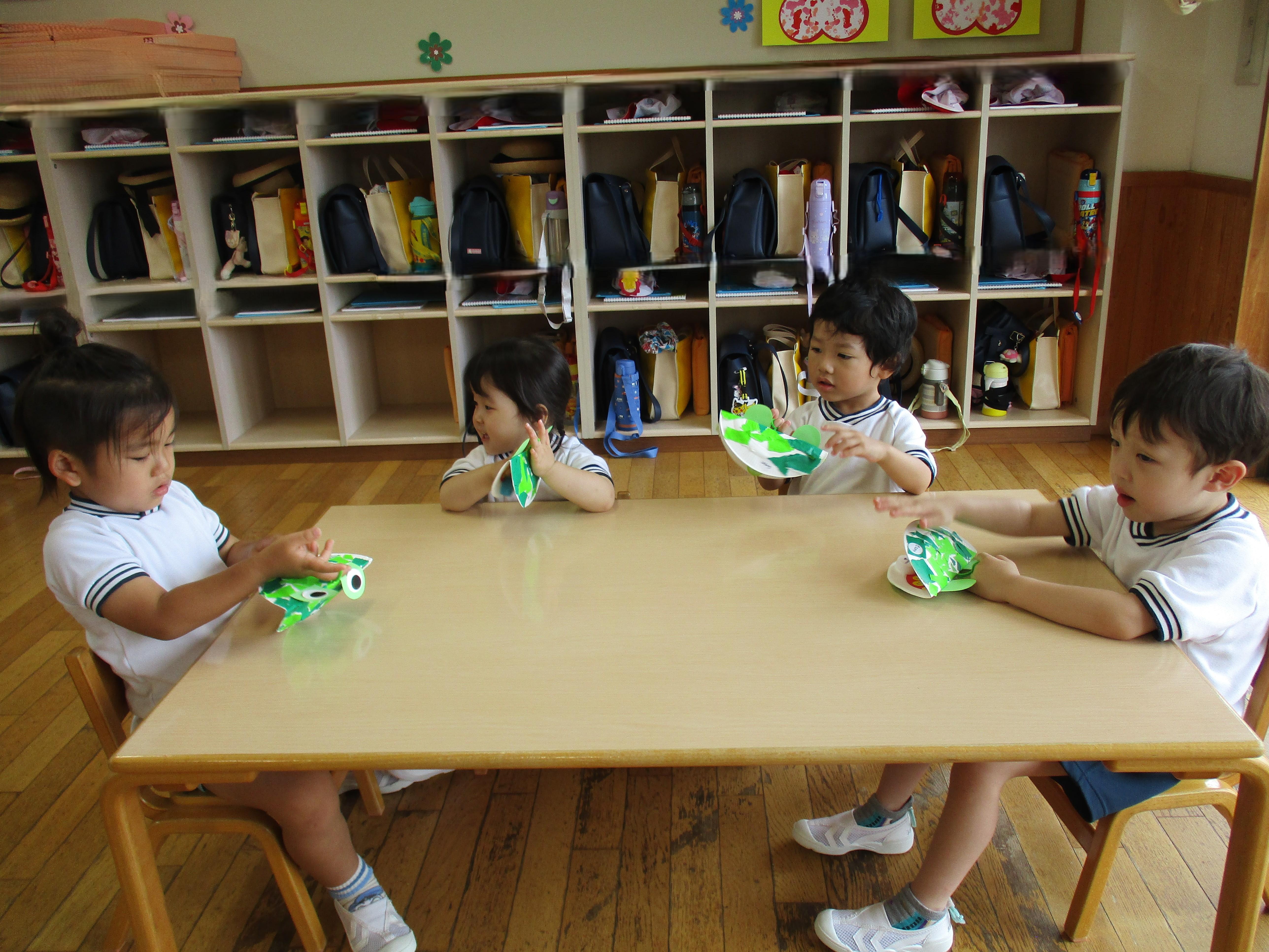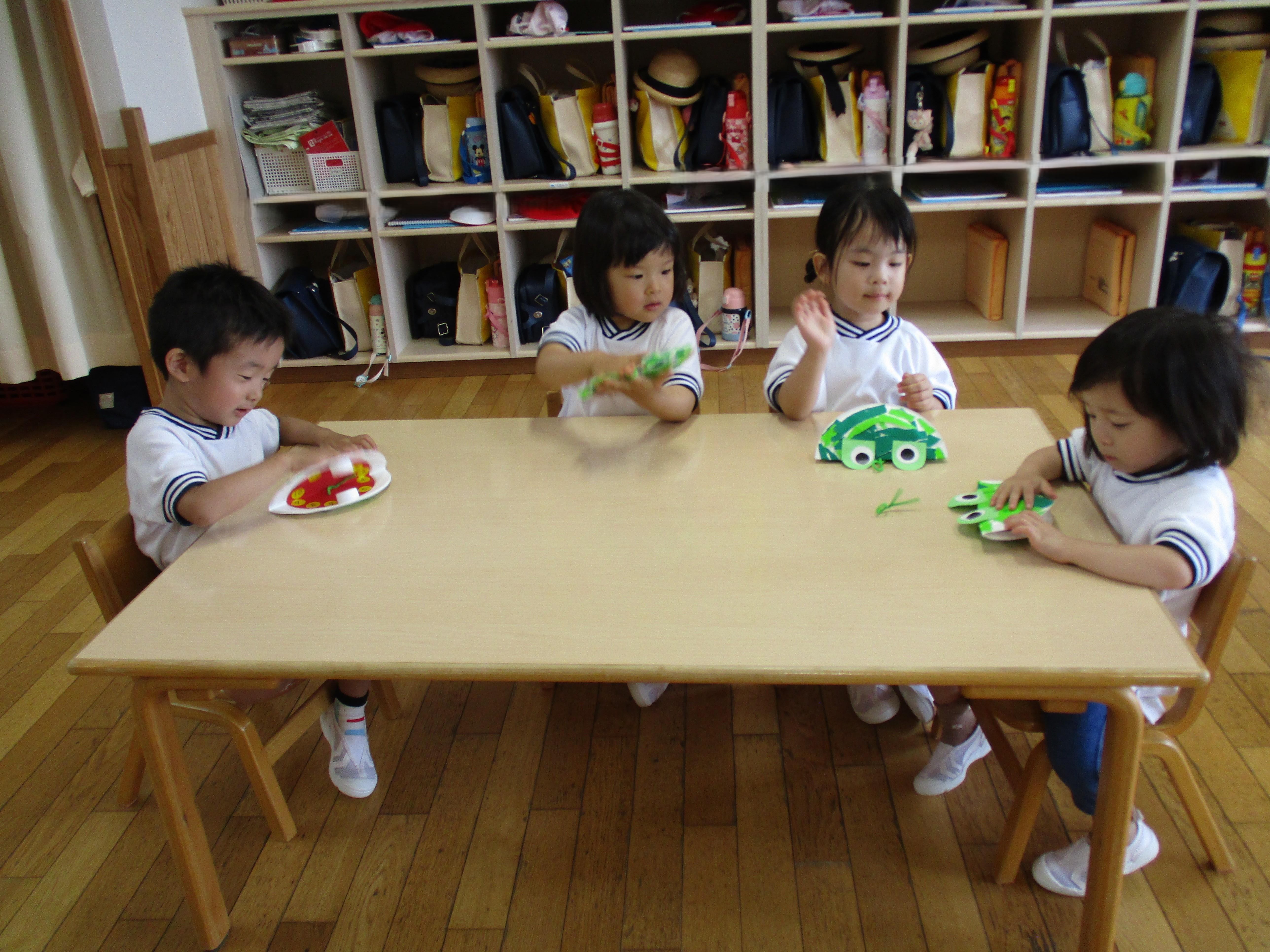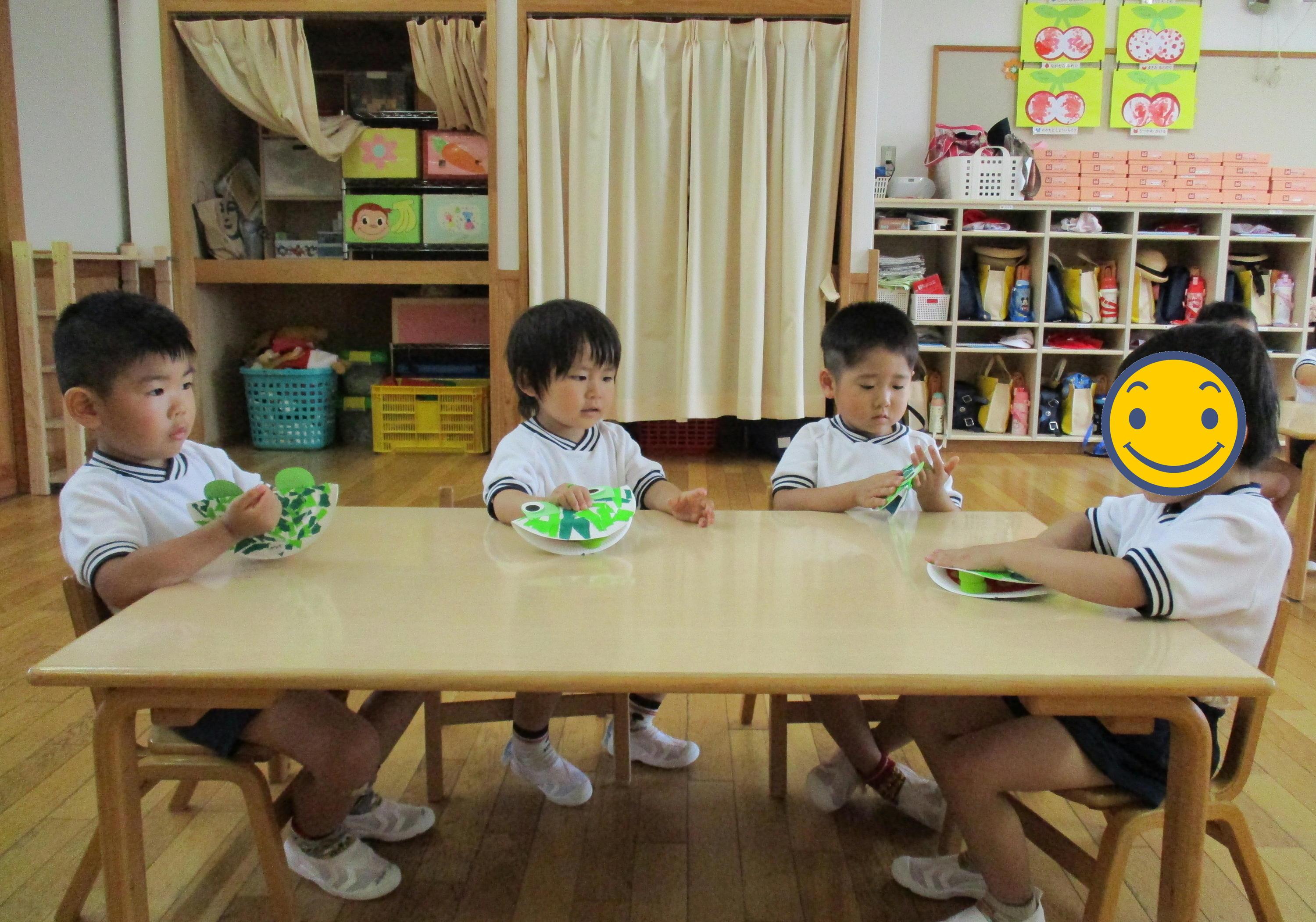 6月10日は時の記念日なので、カエルの時計を作りました。折り紙をちぎって紙皿に貼ったり、数字を書くシールを貼ったり、目をつけたりなど1人ひとり違ったかわいいカエルの時計が完成しました。
