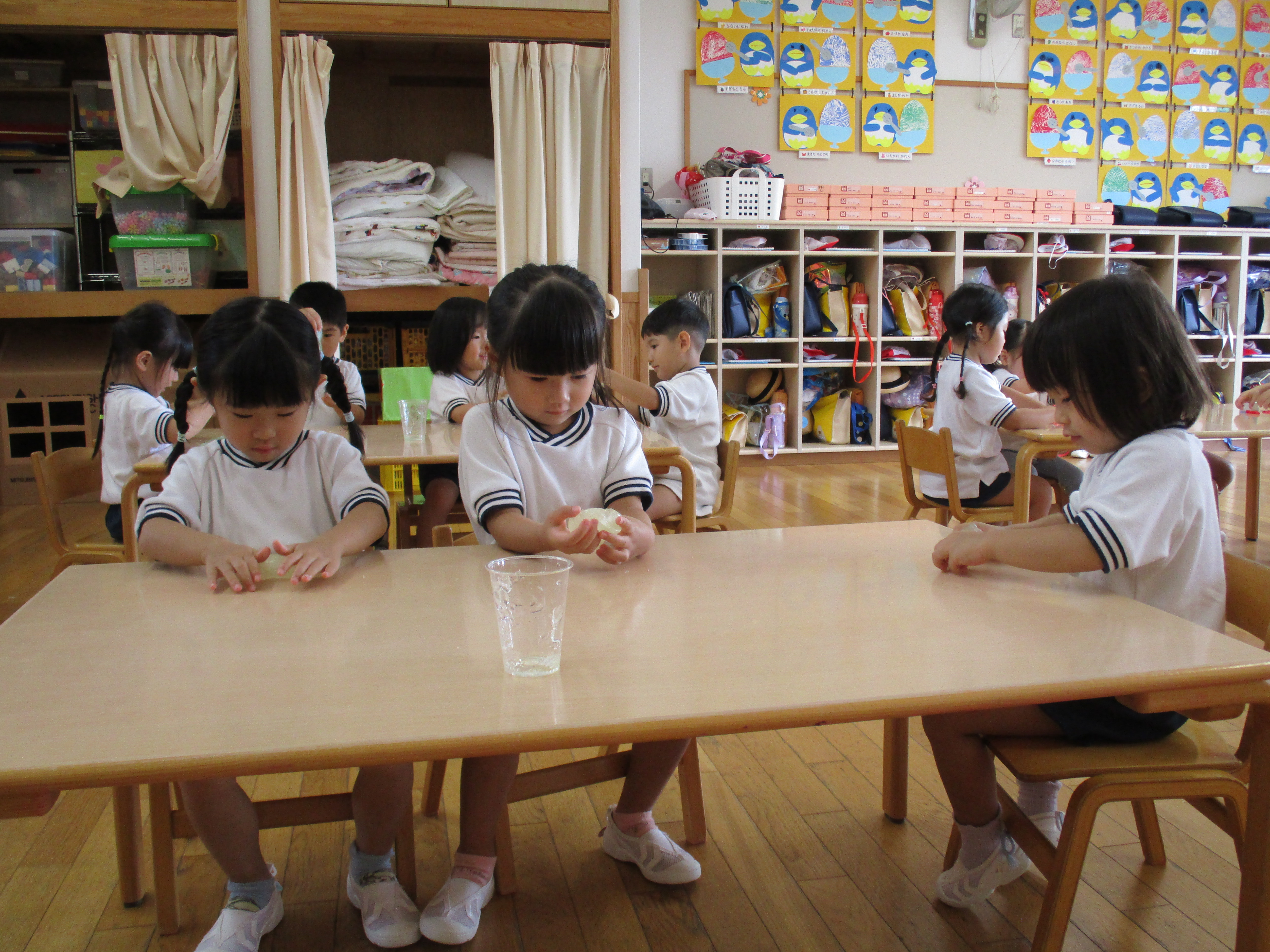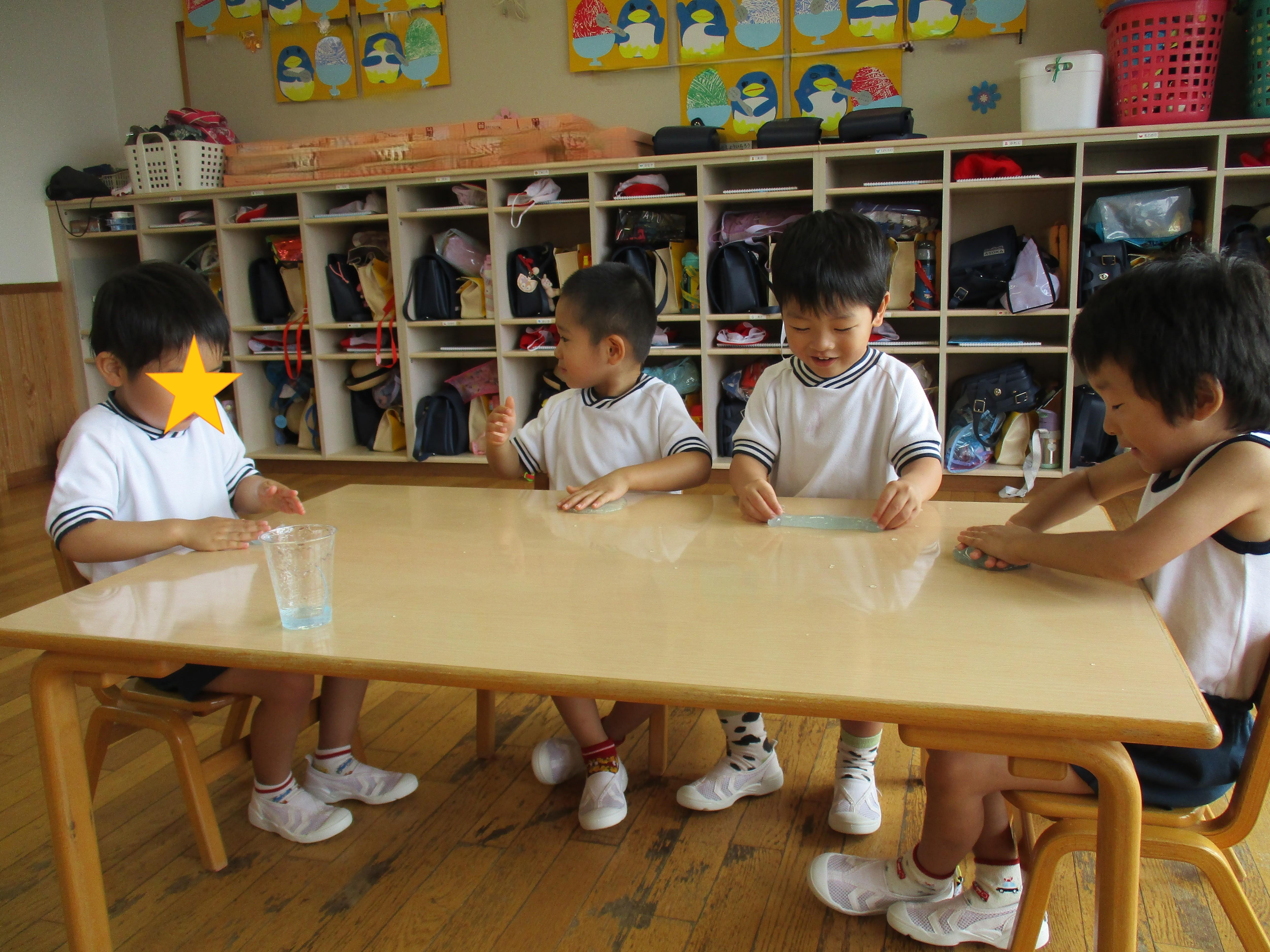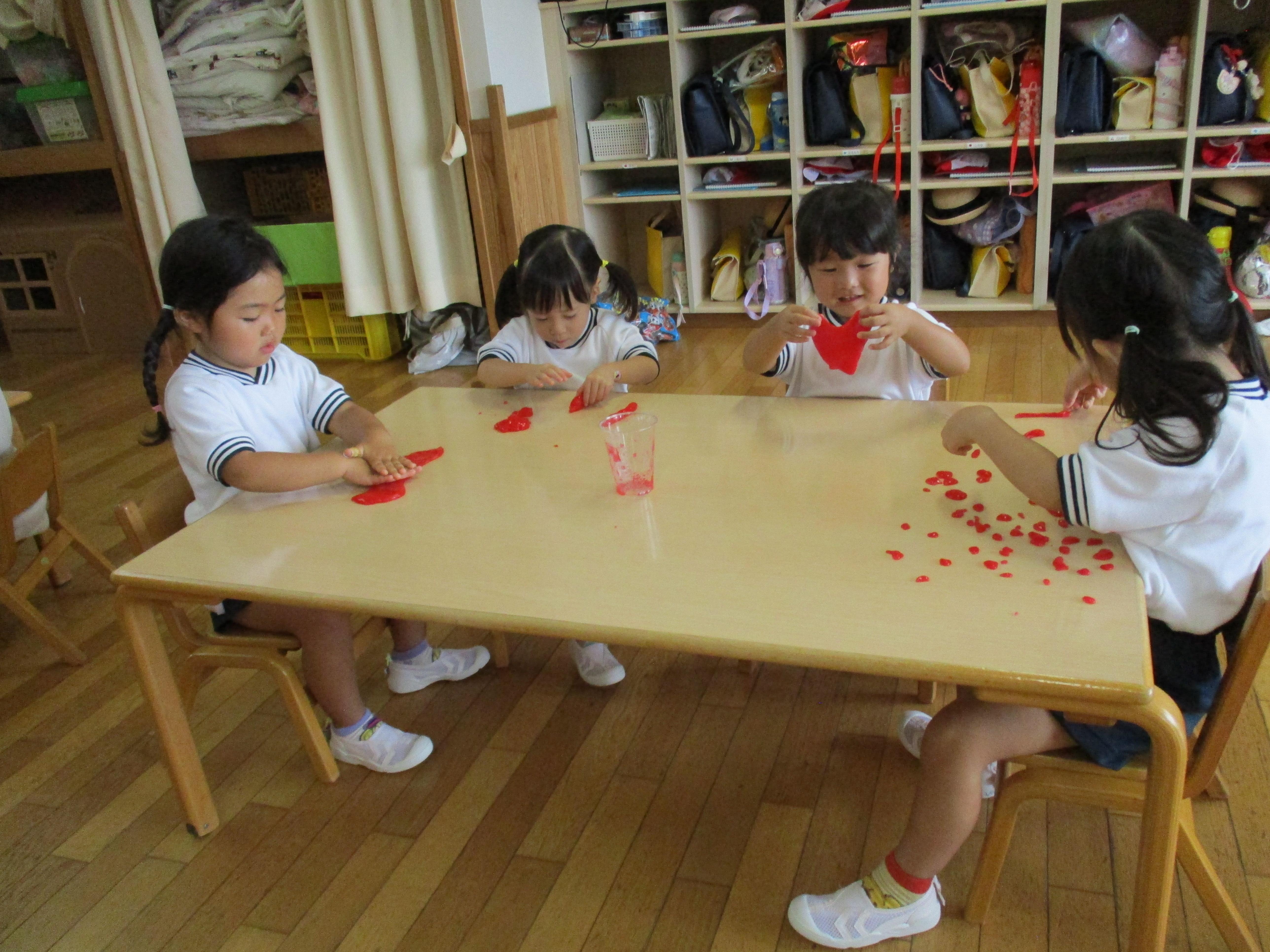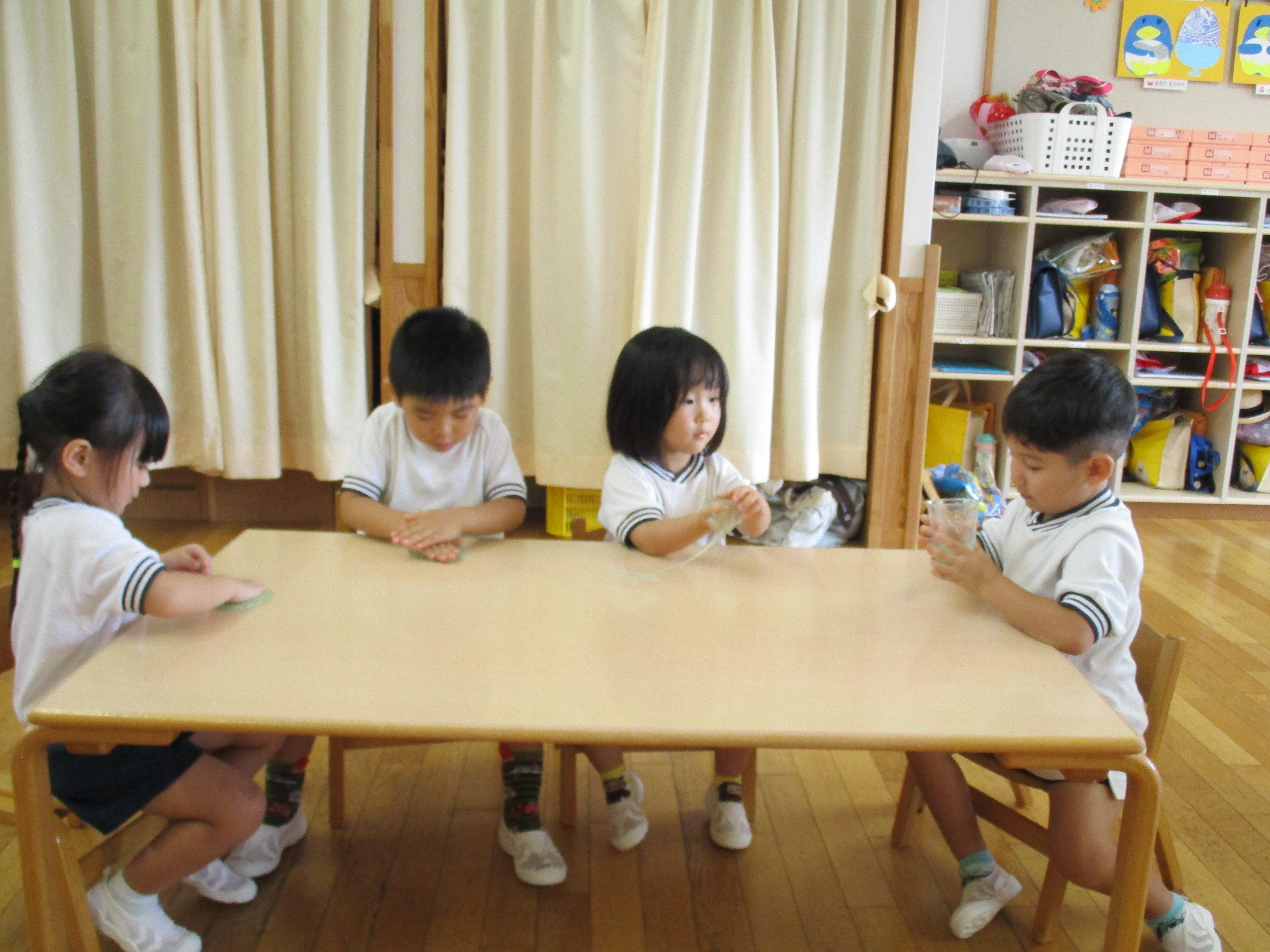 スライムを触ってみると、「すごーい」、「これみてー」など、友達と一緒にお話をしながら興味津々なれんげ組さん。