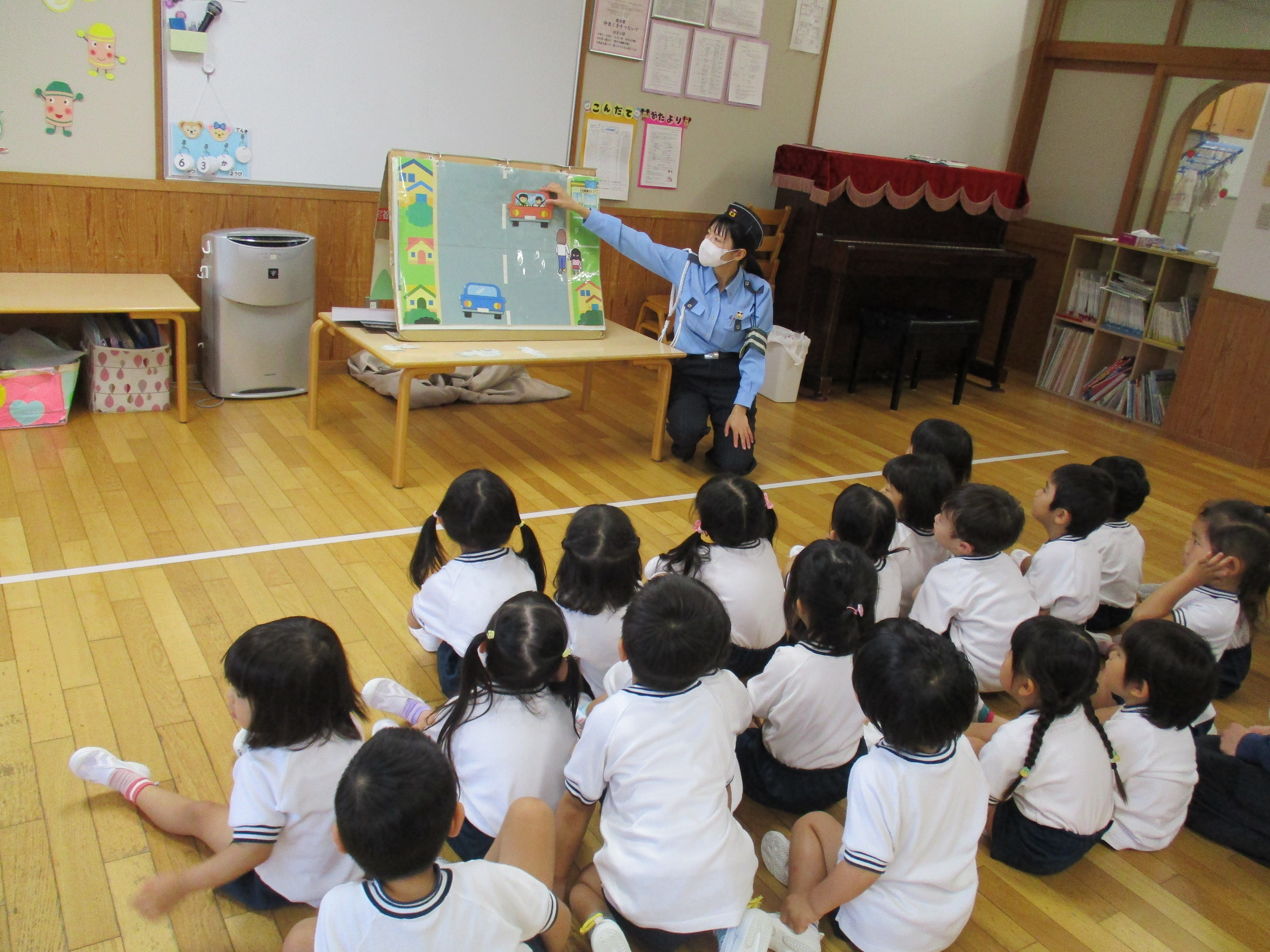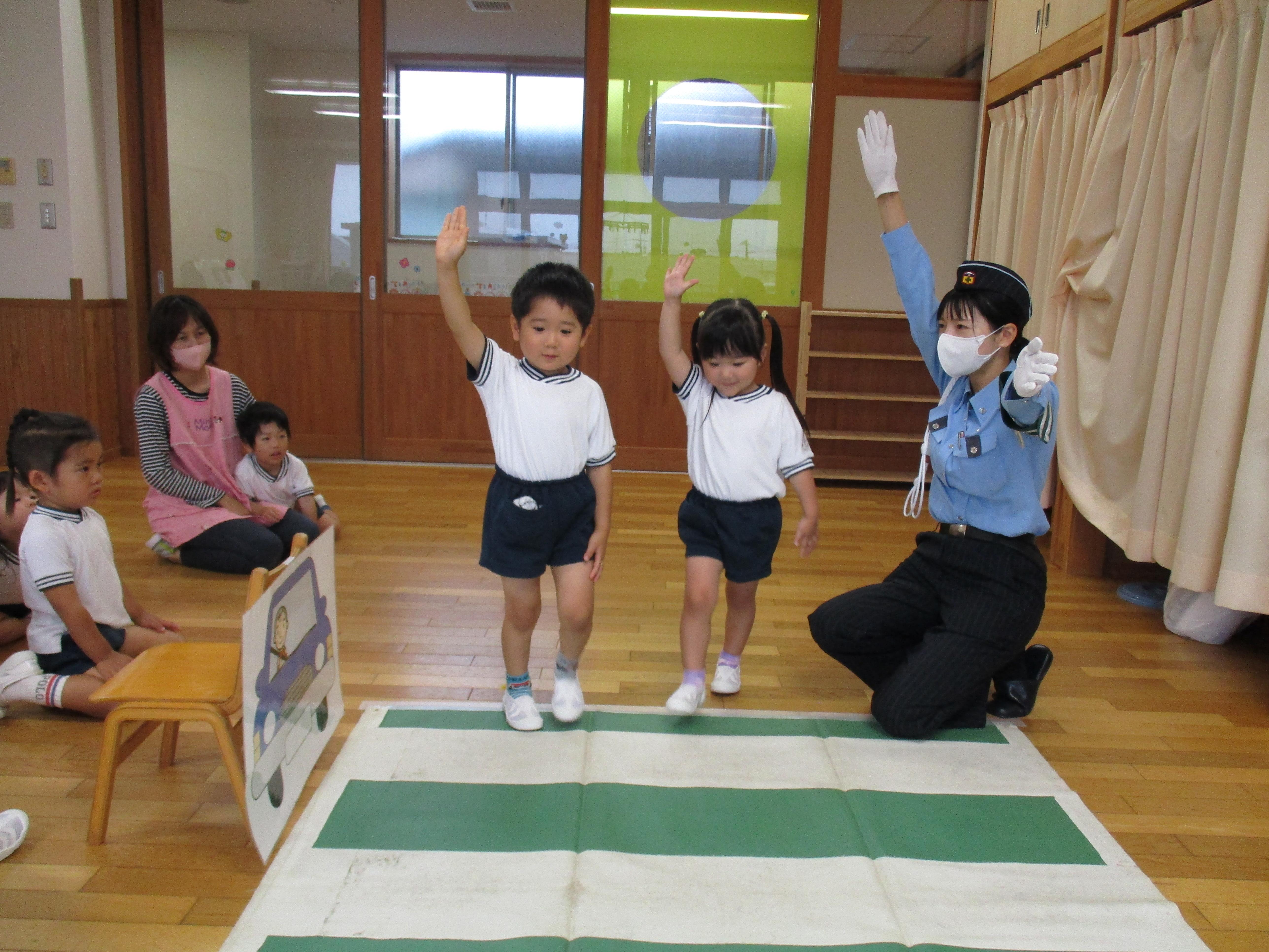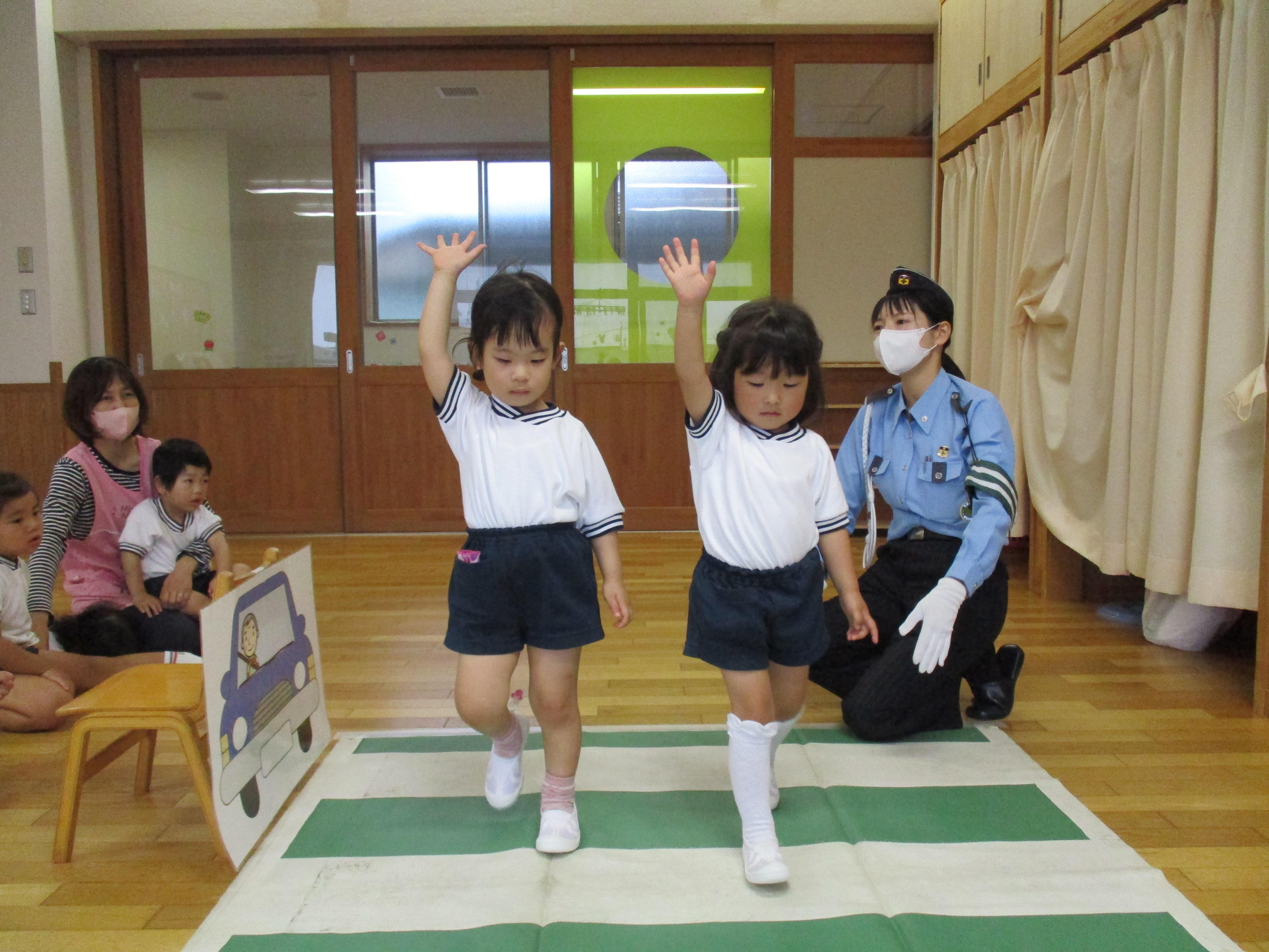 交通安全指導員さんから、道路の歩き方や横断歩道の渡り方を教えてもらいました。