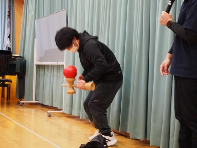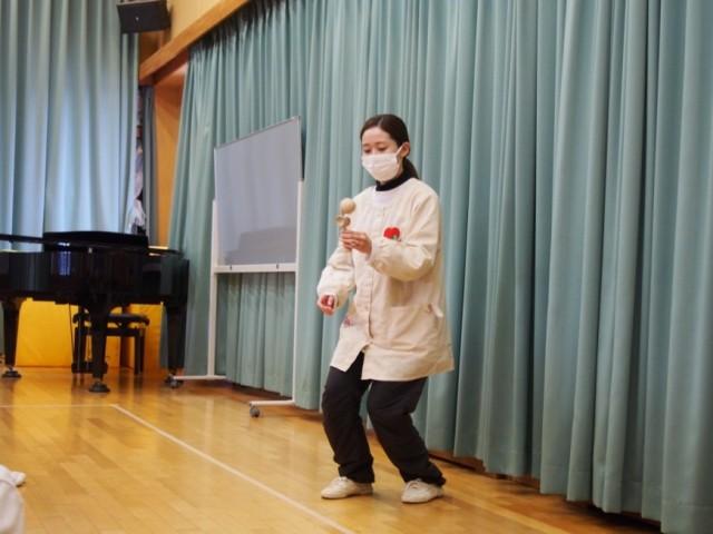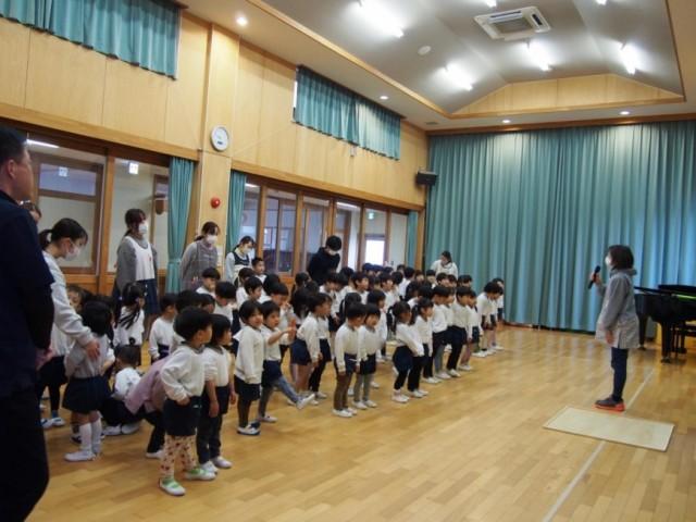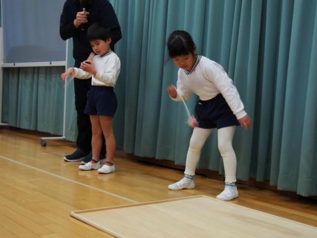 ひまわり組さんの代表者3名が、コマ回しを披露し、先生たちもコマ回しやけん玉を披露してくれました。(練習の成果が出て、ひと安心!)