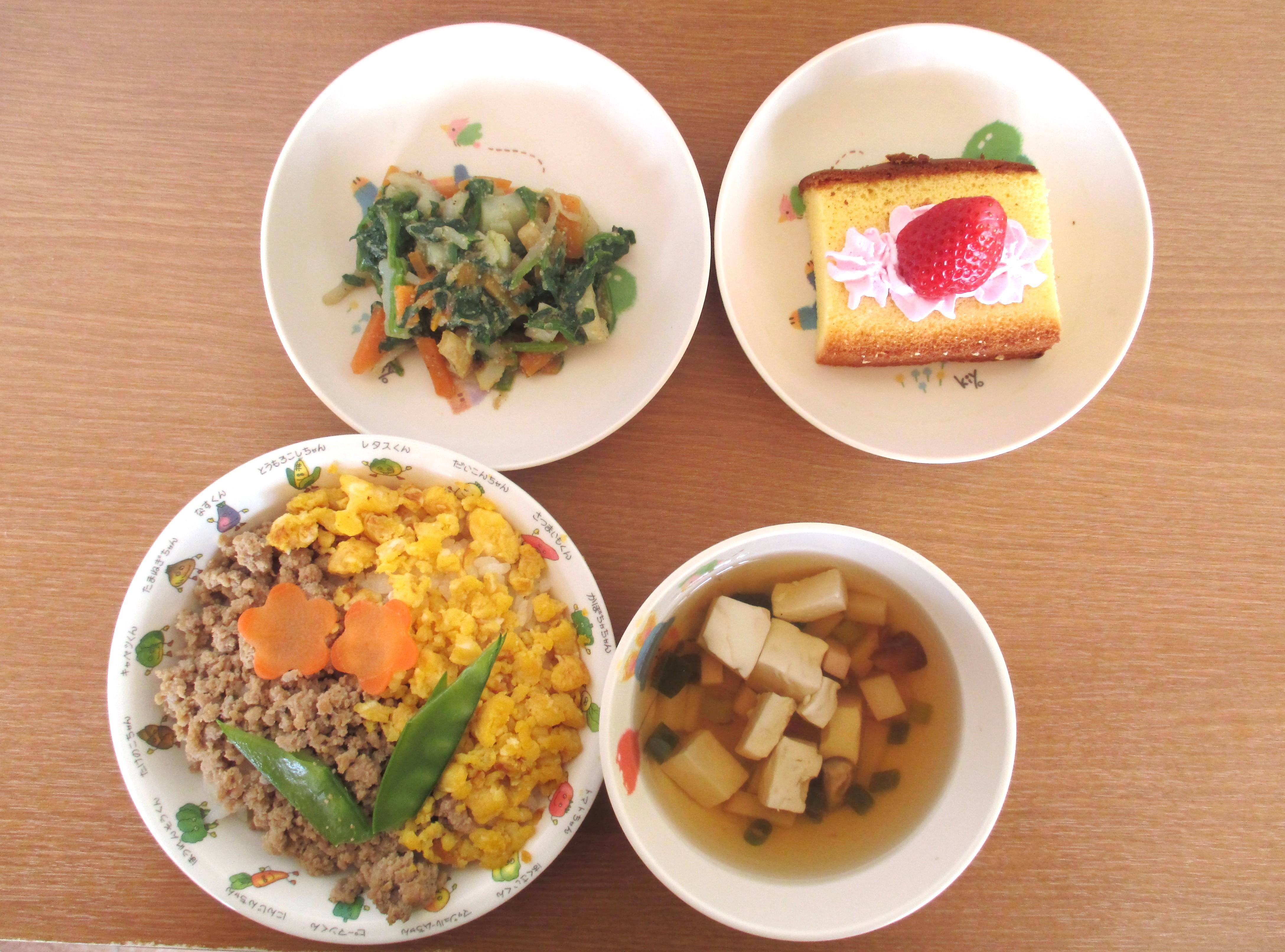 そぼろ丼・千草和え・かまぼこのすまし汁・苺のショートケーキ・カルピス