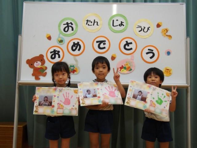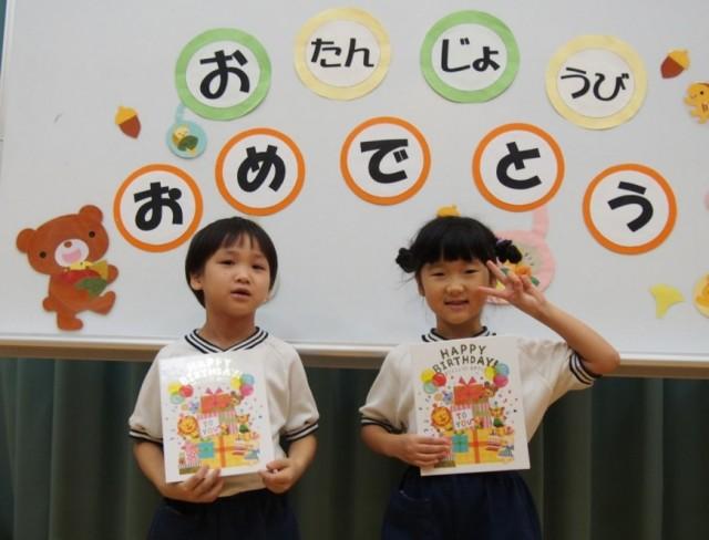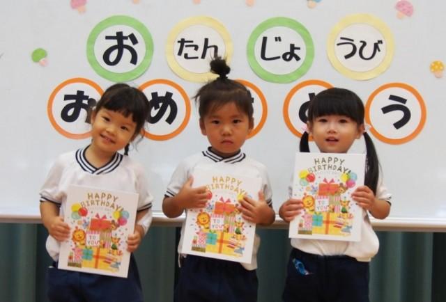9月生まれの10名のお友だち。プレゼントをもらって、みんなから歌でお祝いしてもらって、とても嬉しそうでした。先生の出し物「まほうのでんしレンジ」では、材料を入れると、、、あら不思議!あっという間に大好きな食べ物ができあがりました。ひまわり組の誕生日の2人も手伝ってくれて、大盛り上がりでしたね!