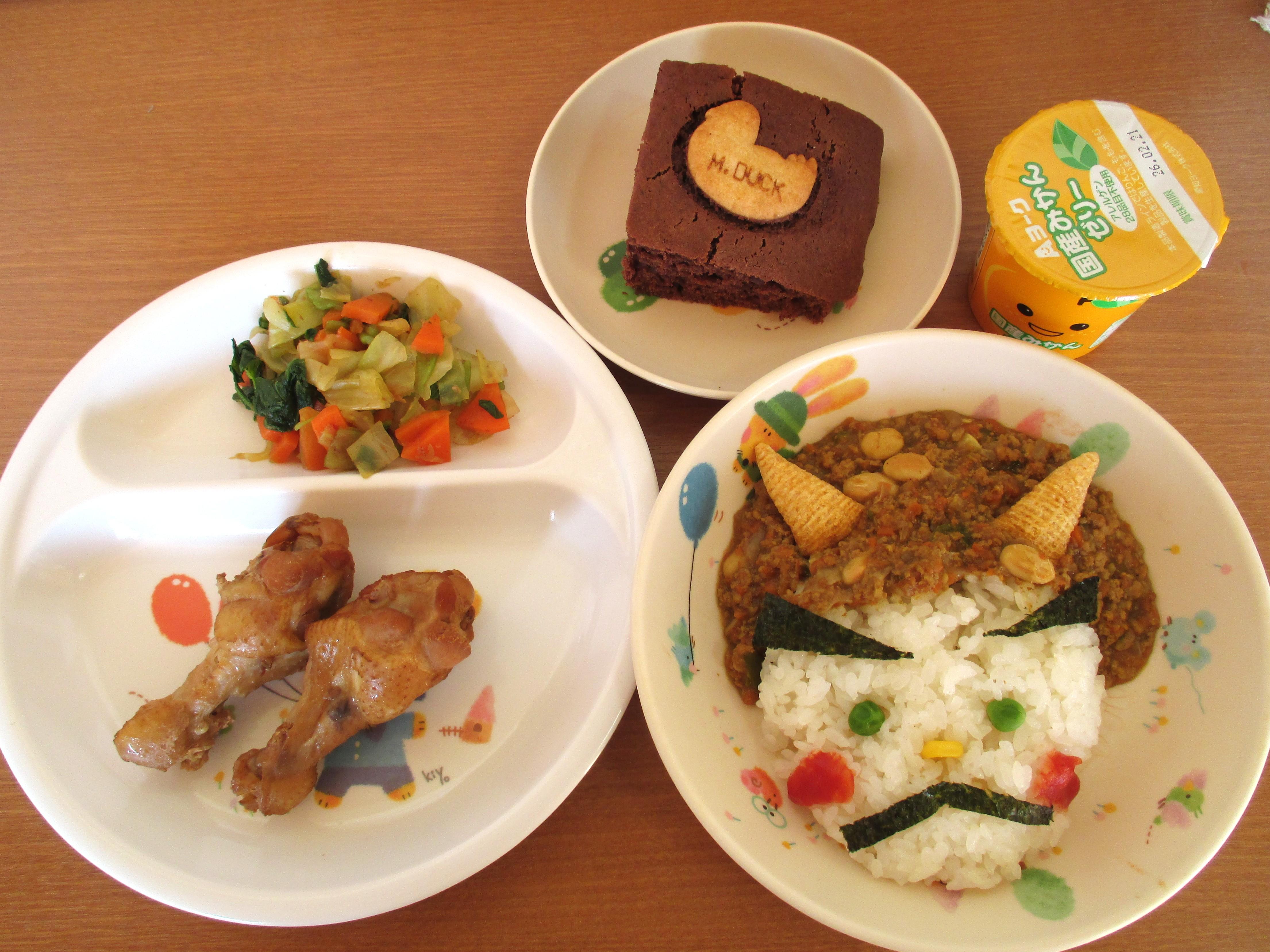 節分にちなんで、大豆が入ったキーマカレーで鬼の顔を作り、鶏の手羽元で鬼の棍棒を表現しました。