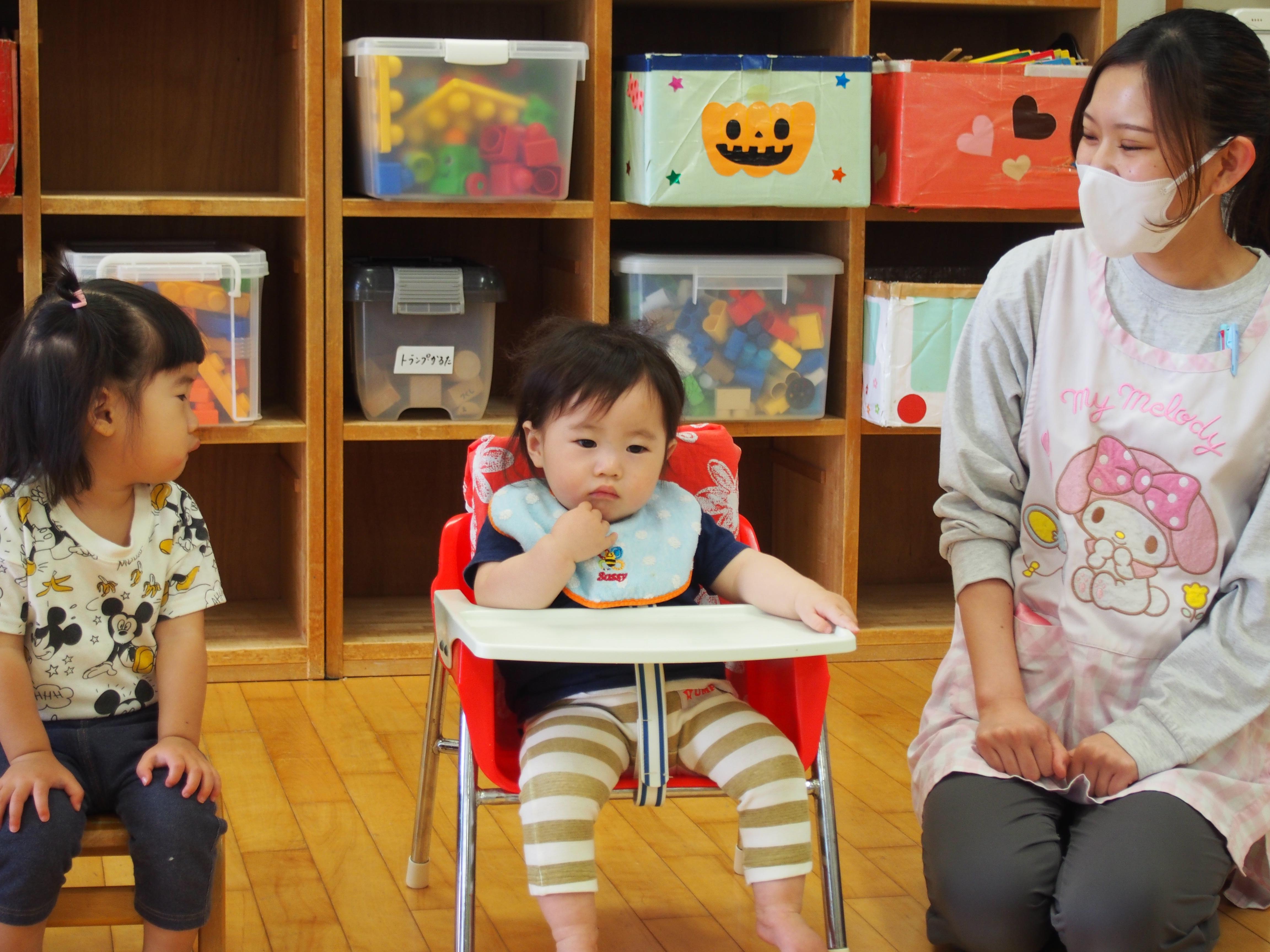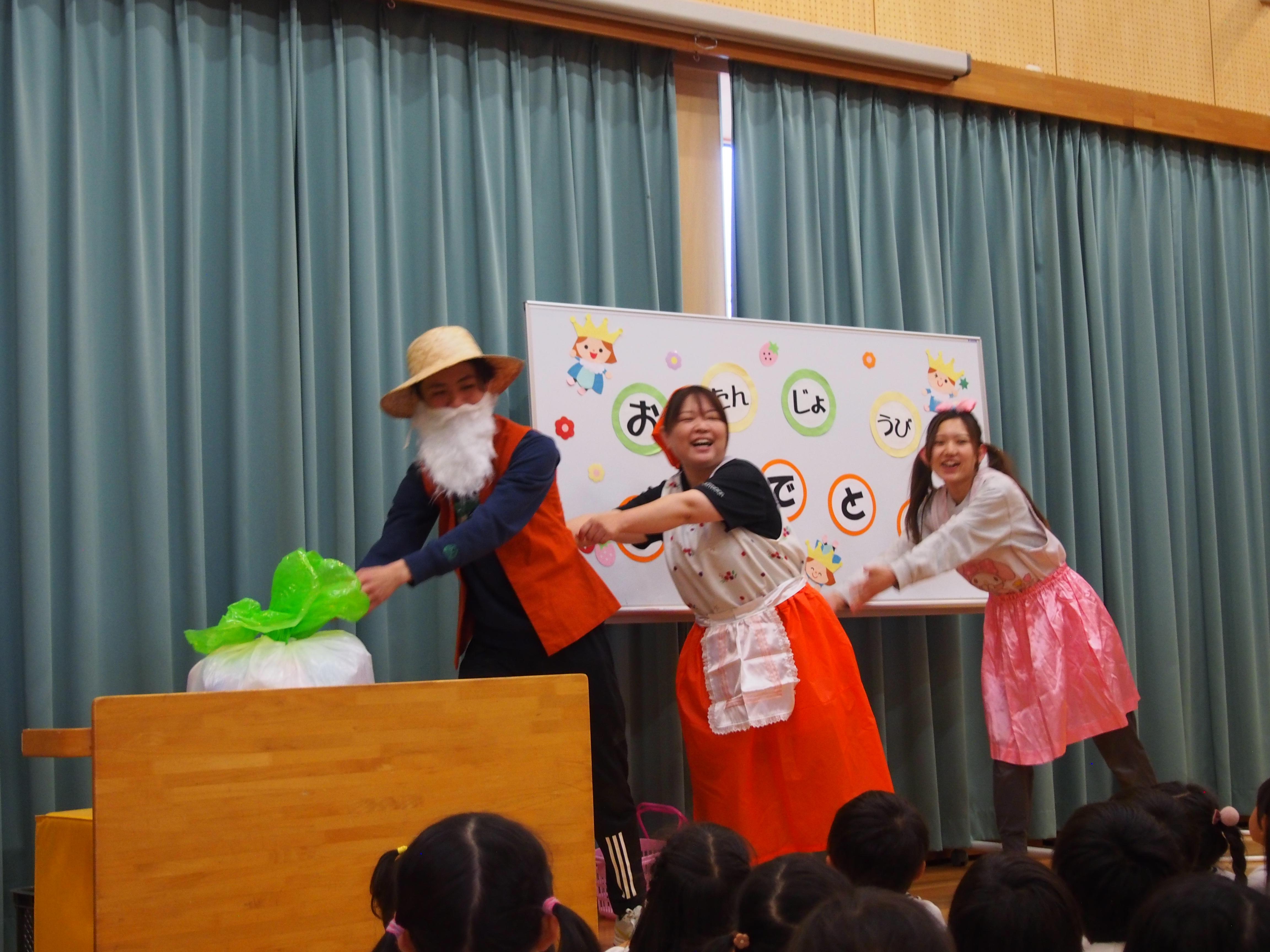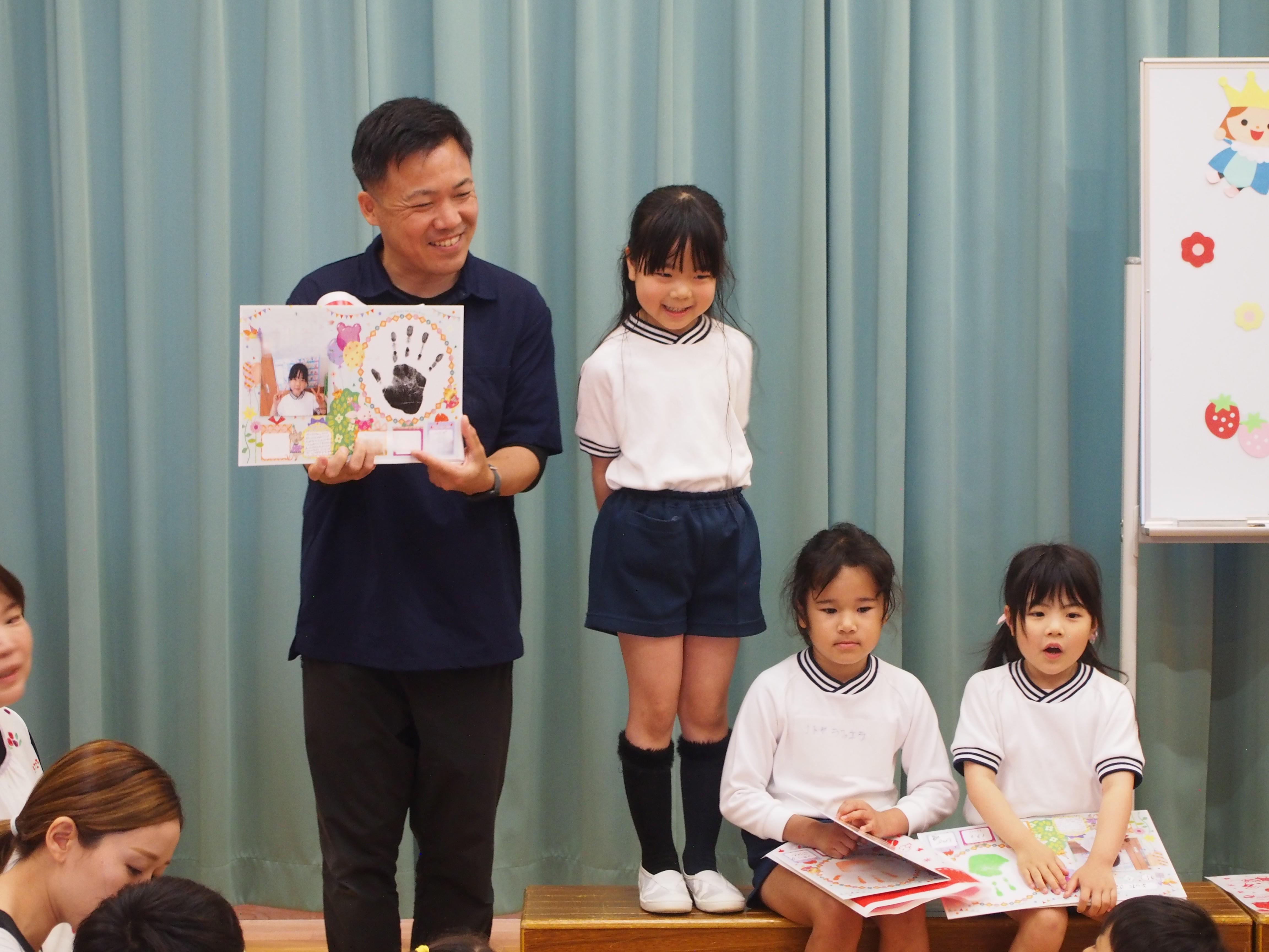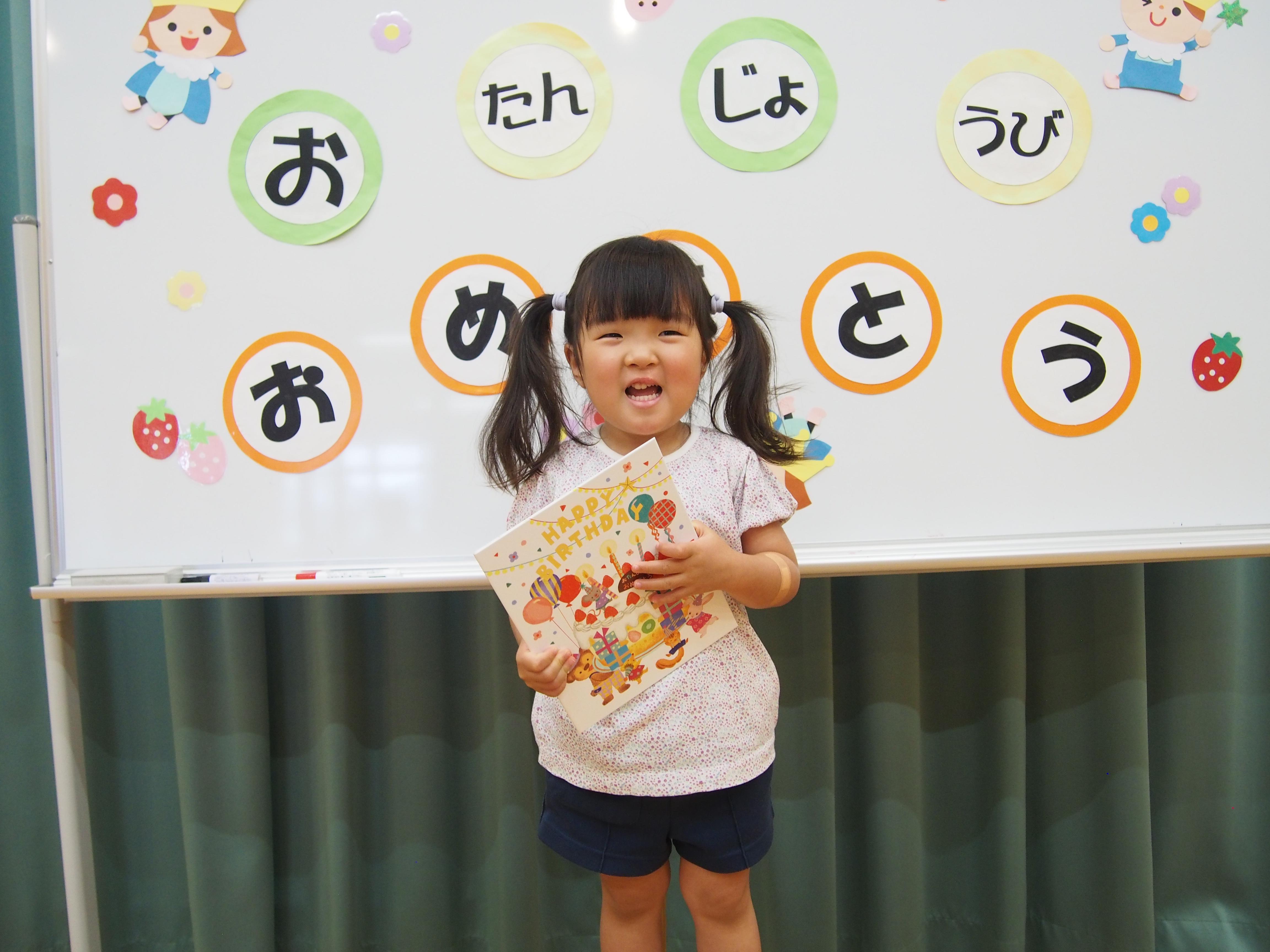 誕生日カードをもらってニッコリ!「かみなりドンがやってきた」を歌ってみんなで「セーフ!イエ~ッス!」職員の出し物「おおきなかぶ」も盛り上がりました。