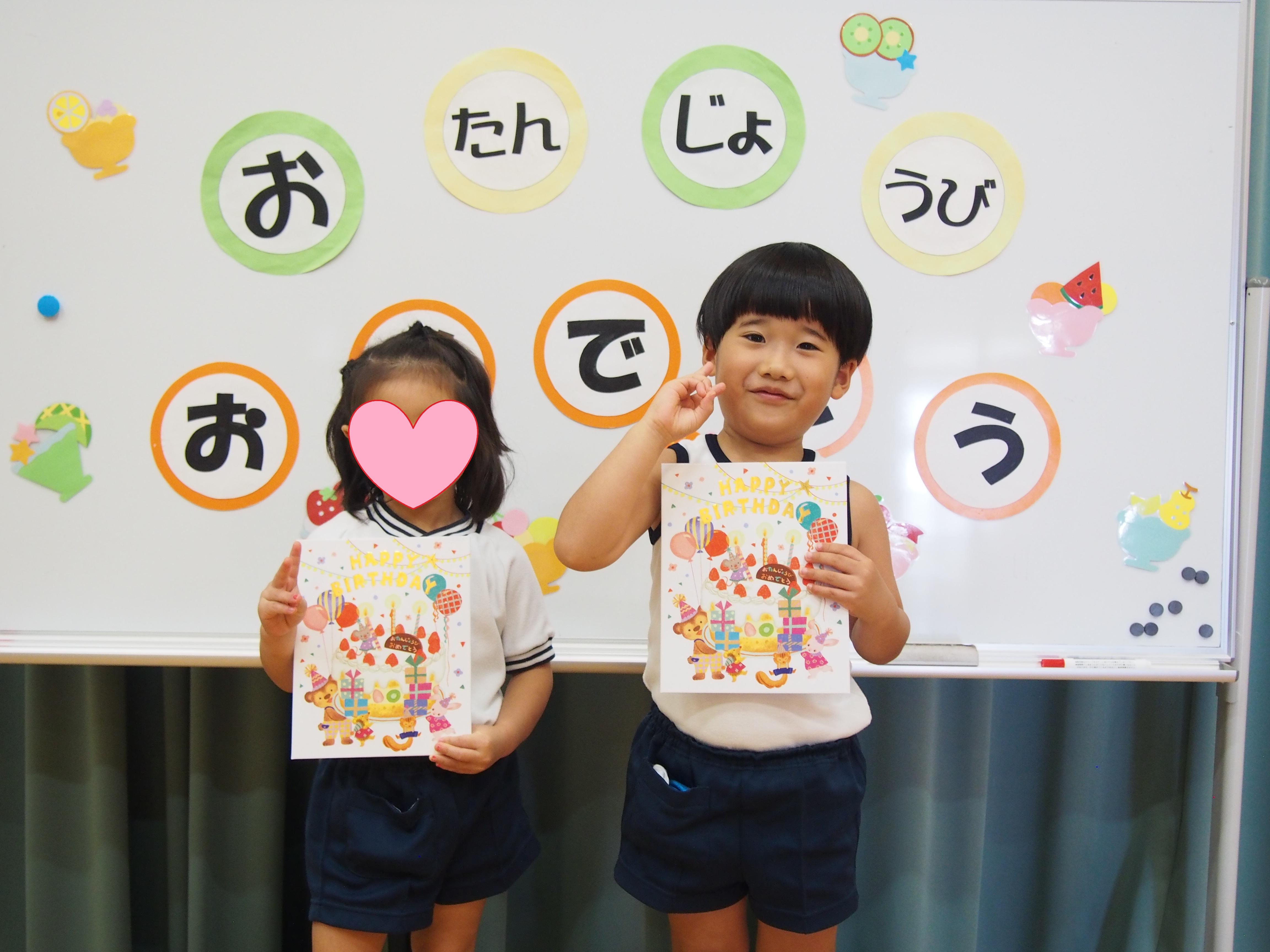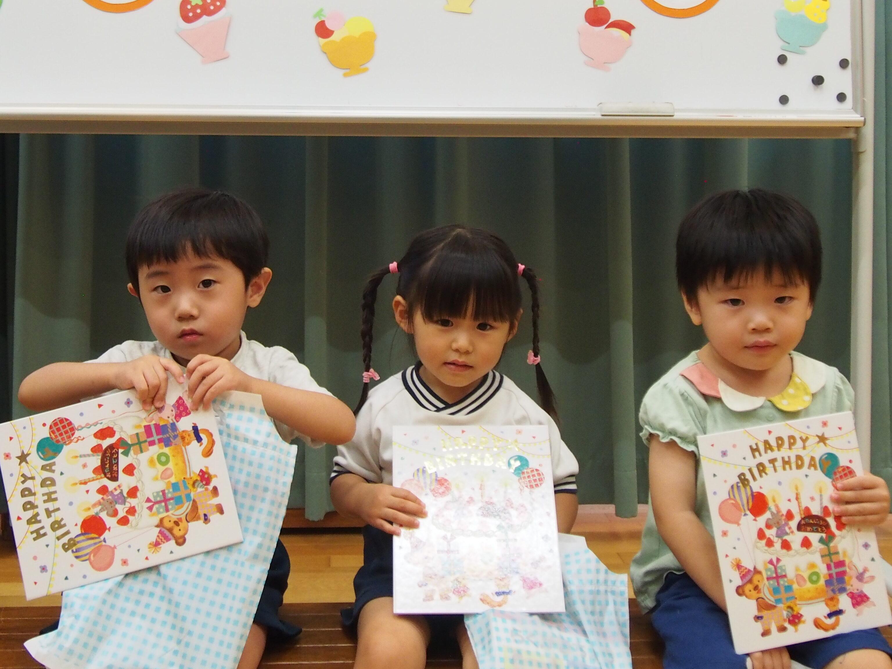 8月生まれのお友だちは7名!すみれ~ひまわり組のお友だちは、インタビューにも答えることができましたね。誕生日カードとプレゼントをもらってご機嫌のお友だち。みんなからお祝いしてもらって、恥ずかしながらも嬉しい気持ちになったようです。