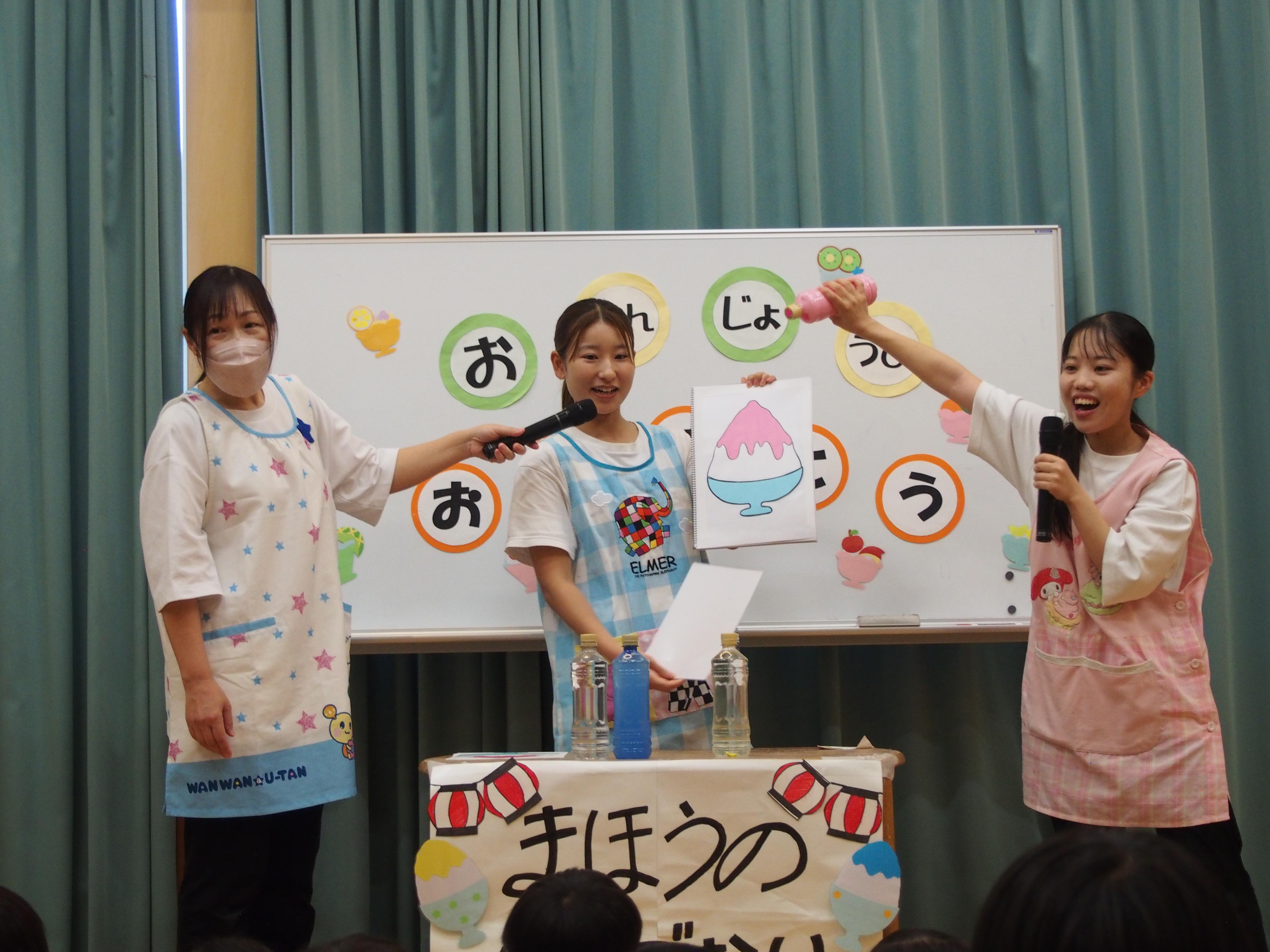 先生たちからの出し物は、「魔法のかきごおり屋さん」透明なシロップを振ってみると…あら不思議!
