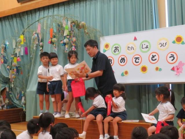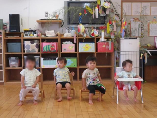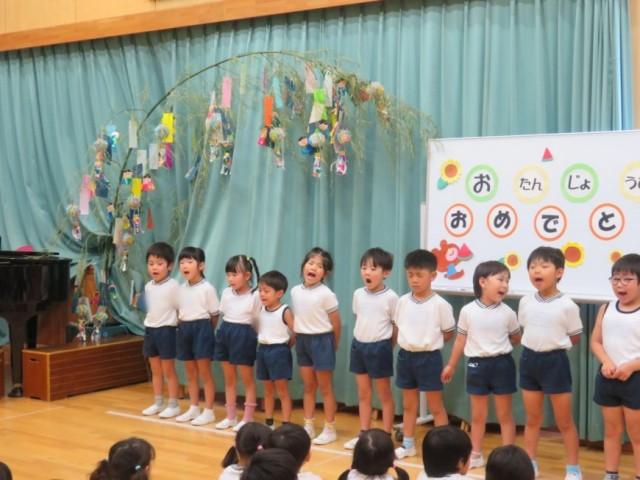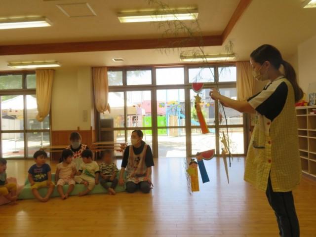 保育室は笹飾りで彩られ、誕生会と七夕会が始まりました。7月生まれのお友だちはインタビューで願い事も教えてくれました。